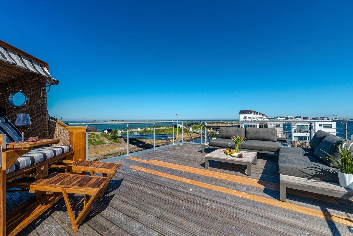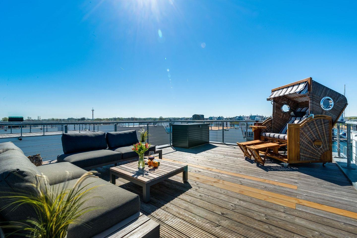 Von der Terrasse im Obergeschoss gelangen Sie zur 30 Quadratmeter großen Dachterrasse mit Strandkorb und bequemen Loungemöbeln. Hier können Sie die Sonne genießen und einen romantischen Sonnenuntergang über der Schlei und dem Hafen der Ostsee erleben.