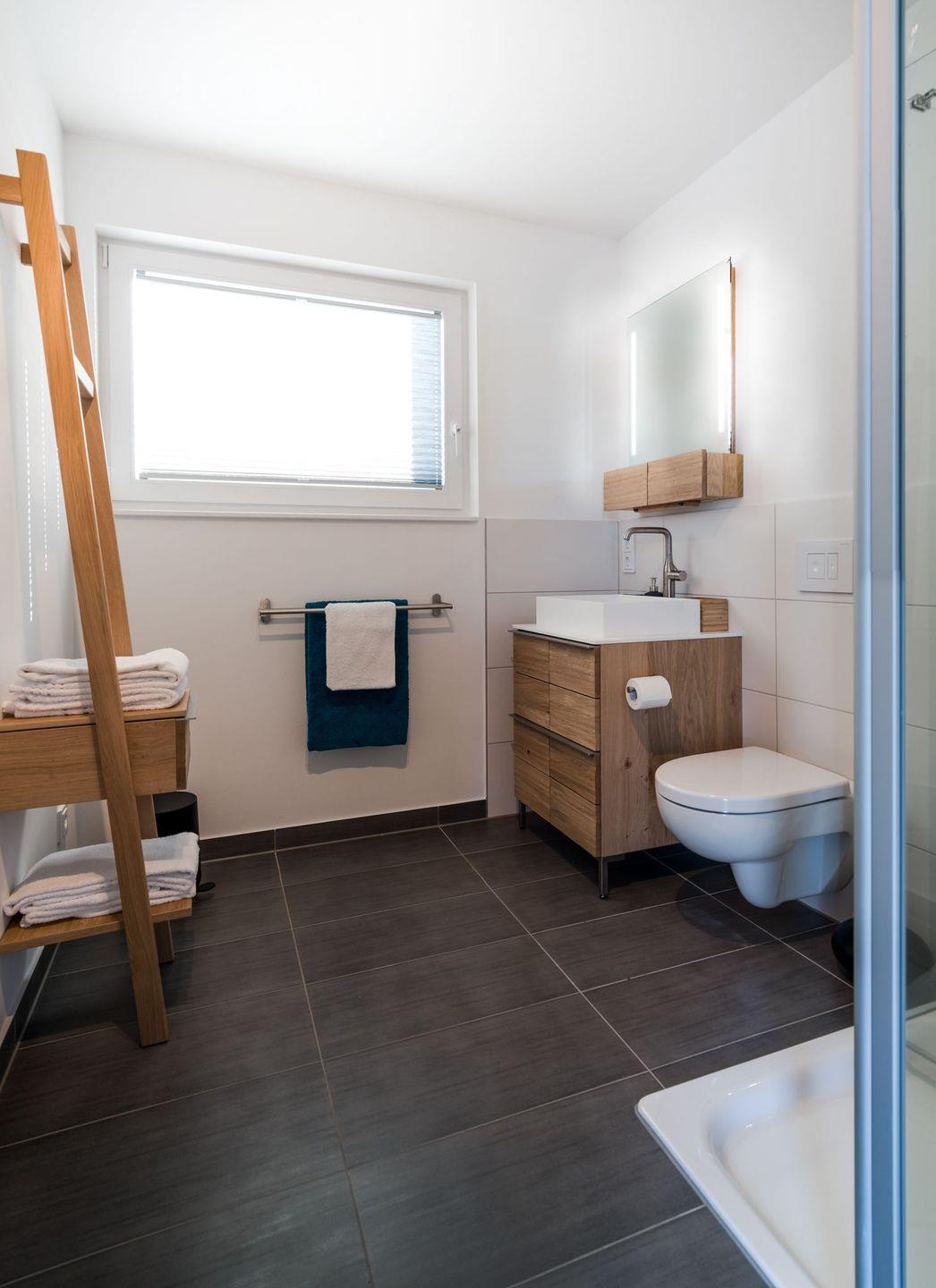 Die Sauna mit direktem Blick auf das Wasser verwandelt dieses Ferienhaus auch an kühleren Tagen in eine Wohlfühloase. Der direkte Zugang von der Sauna im Erdgeschoss in die Ostsee bietet ein luxuriöses Badeerlebnis. Gegenüber der Sauna befindet sich das Badezimmer mit Dusche, WC und Waschbecken, ebenfalls im Erdgeschoss.