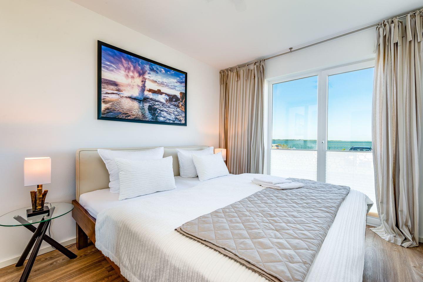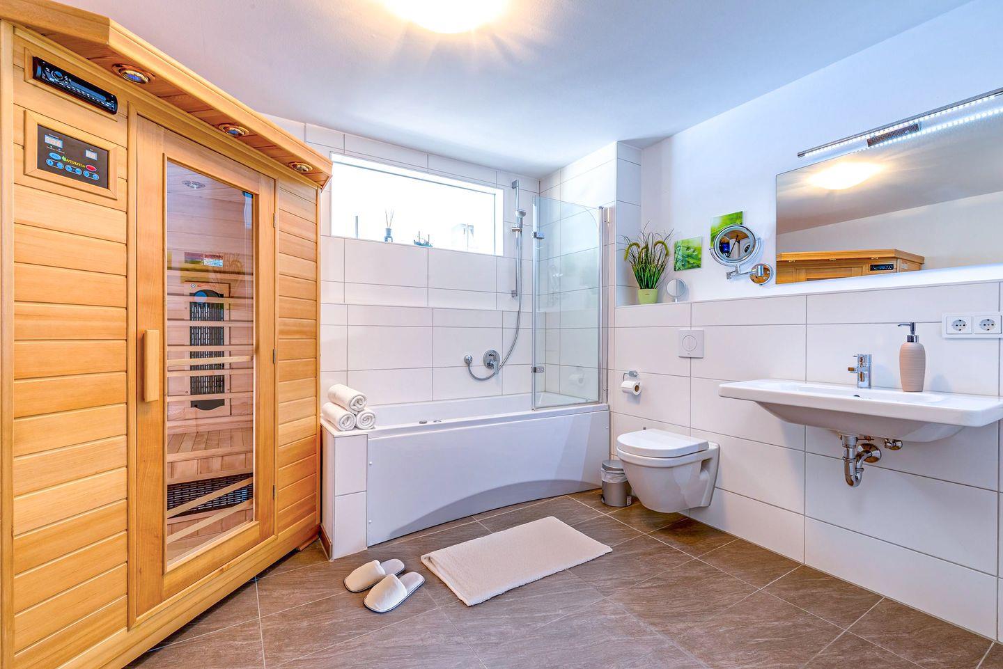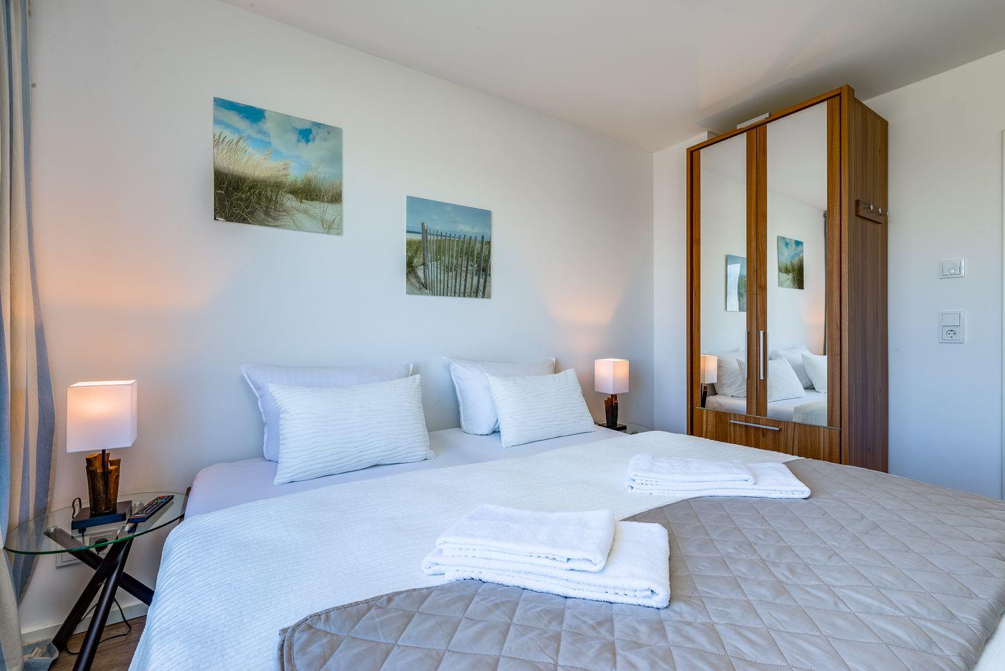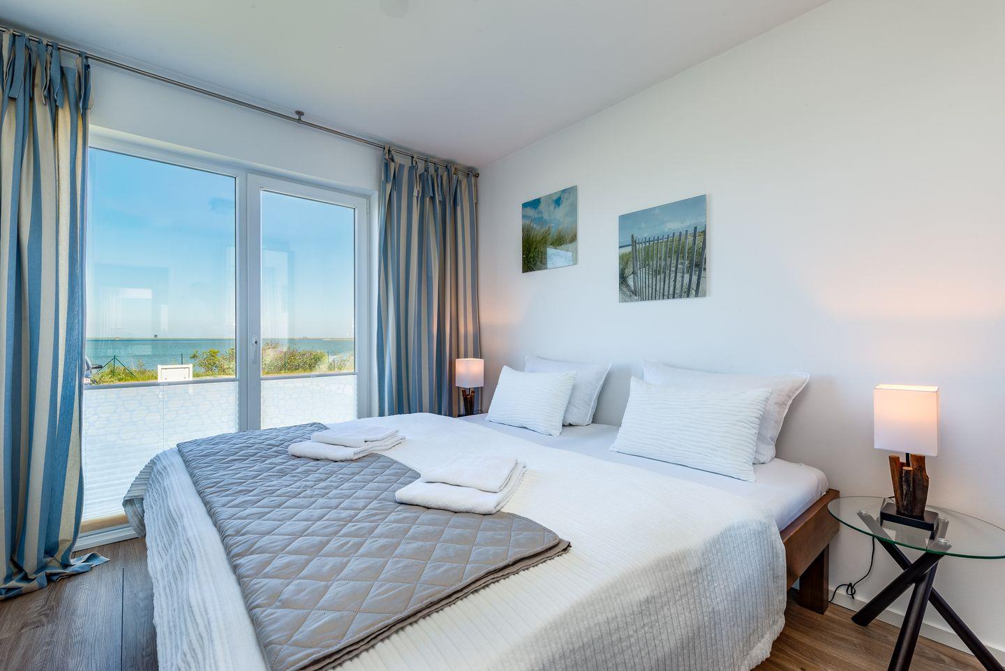 Zur Wohnung "Meerglück" gehören zwei Schlafzimmer, die beide einen wunderbaren Ausblick auf die Schlei bieten und jeweils ein großes Doppelbett und ausreichend Stauraum haben. Das Tageslichtbad verwöhnt mit einer Wellnesssauna (auch Infrarotsauna genannt) und einer Whirlwanne mit Duschfunktion, perfekt für entspannende Momente unabhängig von der Jahreszeit.