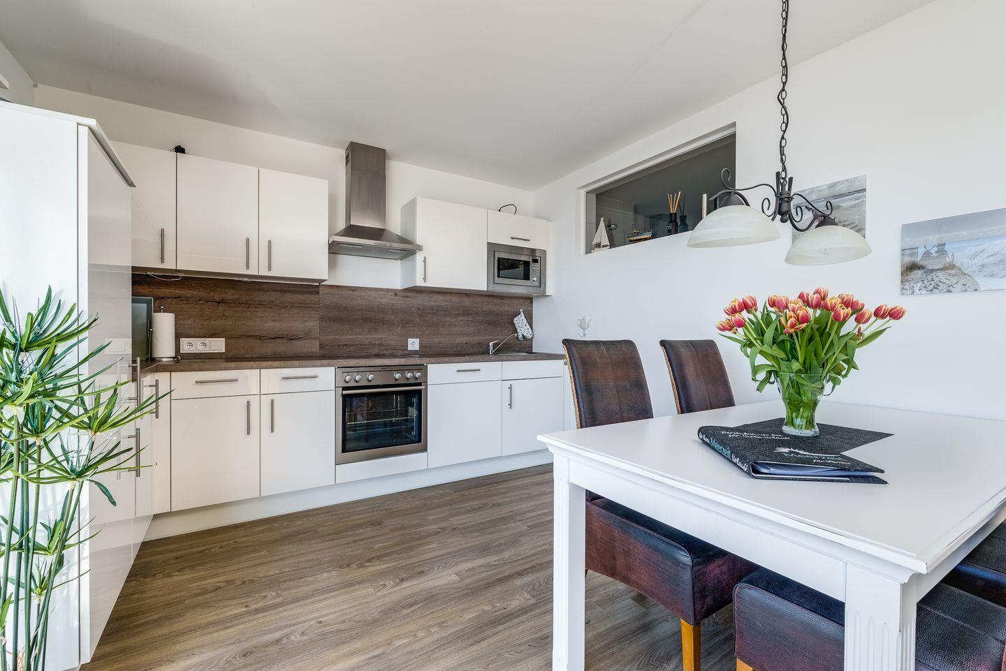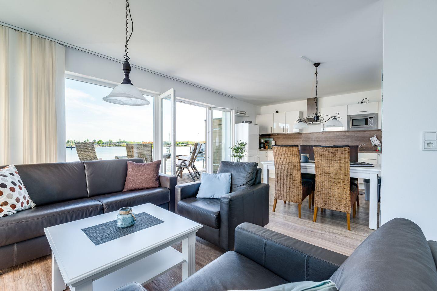 Im Zentrum der Ferienwohnung "Meerglück" befindet sich der helle Wohn- und Essbereich, der nahtlos zur großzügigen Südterrasse mit herrlichem Hafen- und Meerblick übergeht. Die Terrasse ist ausgestattet mit einem elektrischen Grill und komfortablen Möbeln, ideal zum Entspannen am Wasser. Die angrenzende Küche ist voll ausgestattet, und der Wohnbereich bietet mit einem Schlafsofa, Sesseln und einem Fernseher alle Annehmlichkeiten für gemütliche Abende.