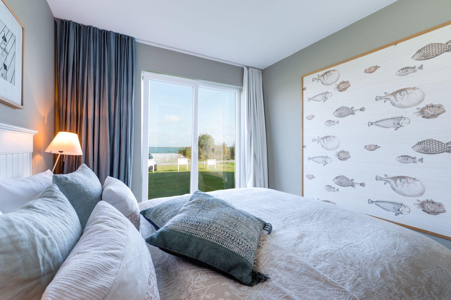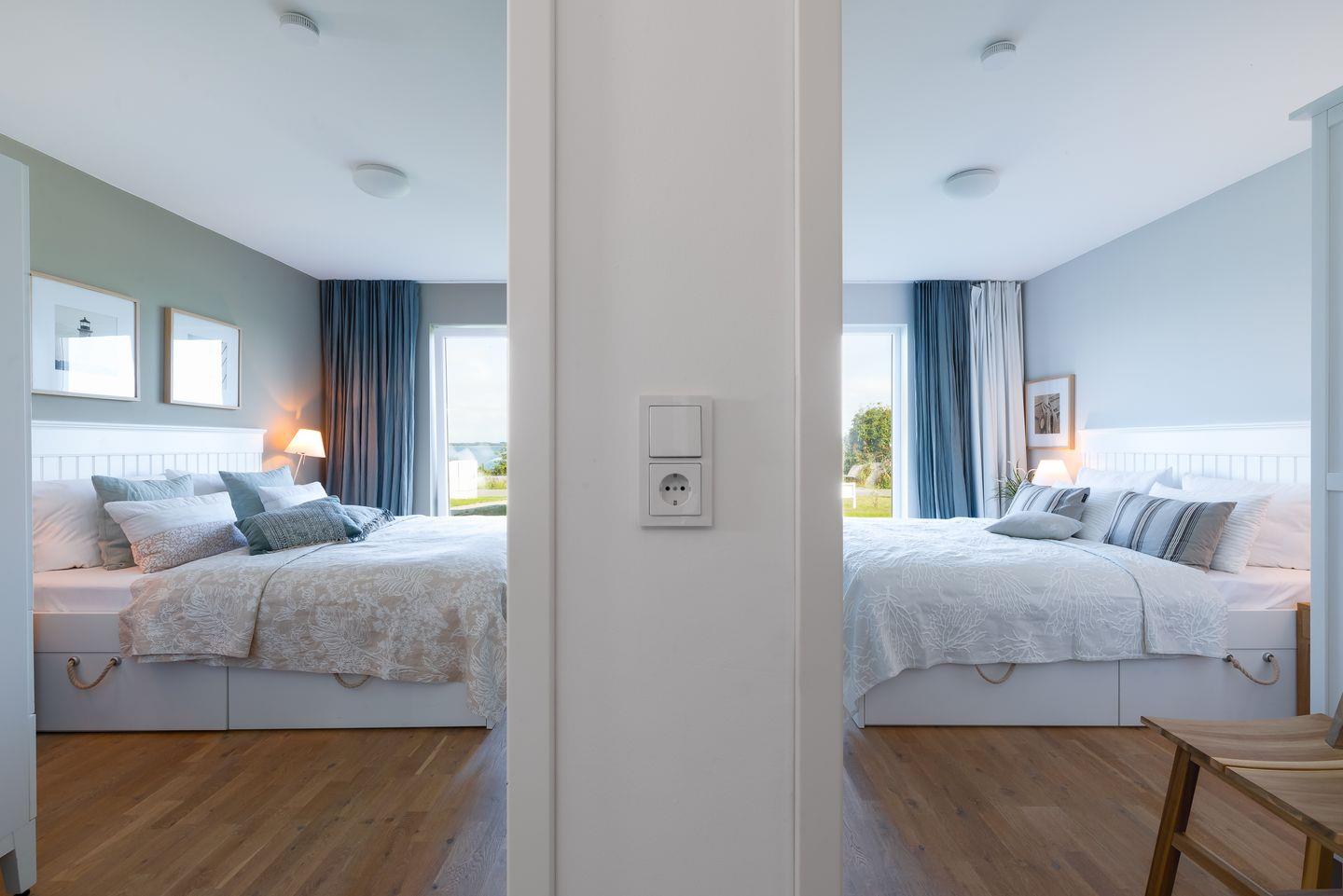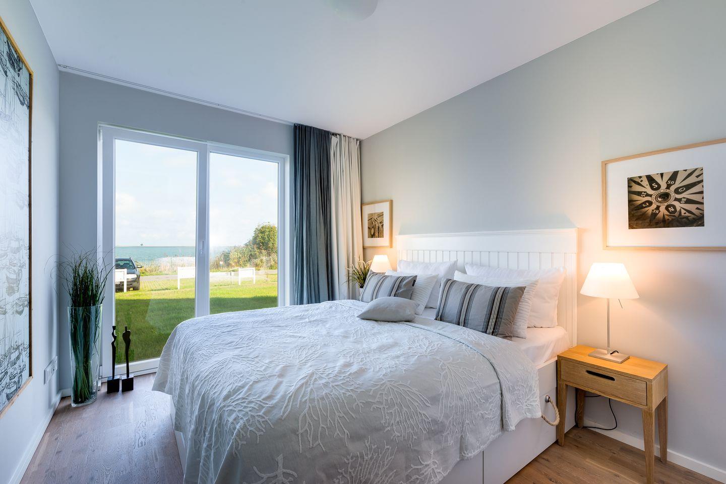 Die Wohnung verfügt über 2 Schlafzimmer, die durch bodentiefe Fenster ein Erwachen mit Blick auf die Schleimündung oder nach Maasholm ermöglichen. Beide Schlafzimmer sind mit jeweils einem Doppelbett (160x200 cm), Schiebetürenschrank, sowie Verdunklungsvorhängen ausgestattet.