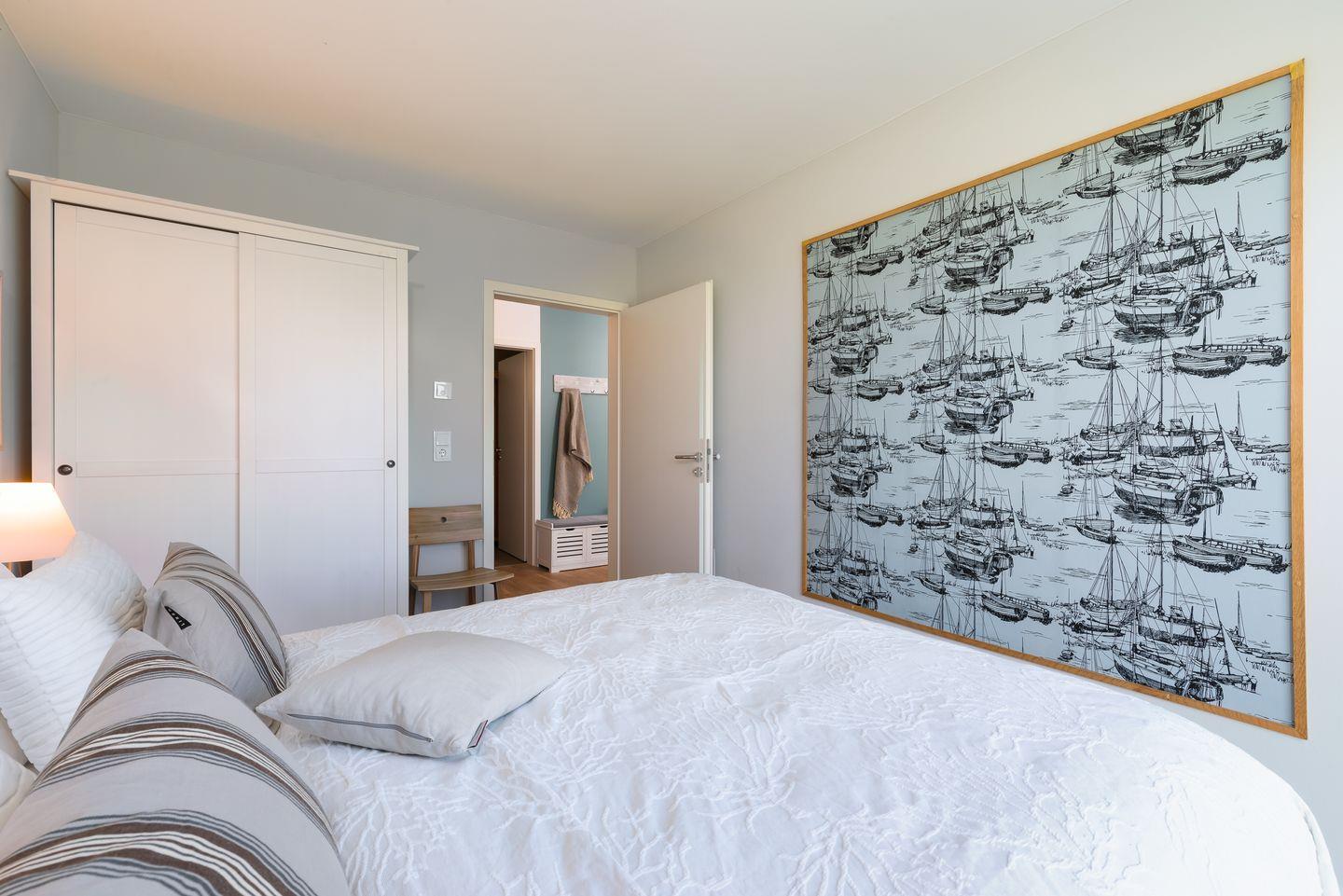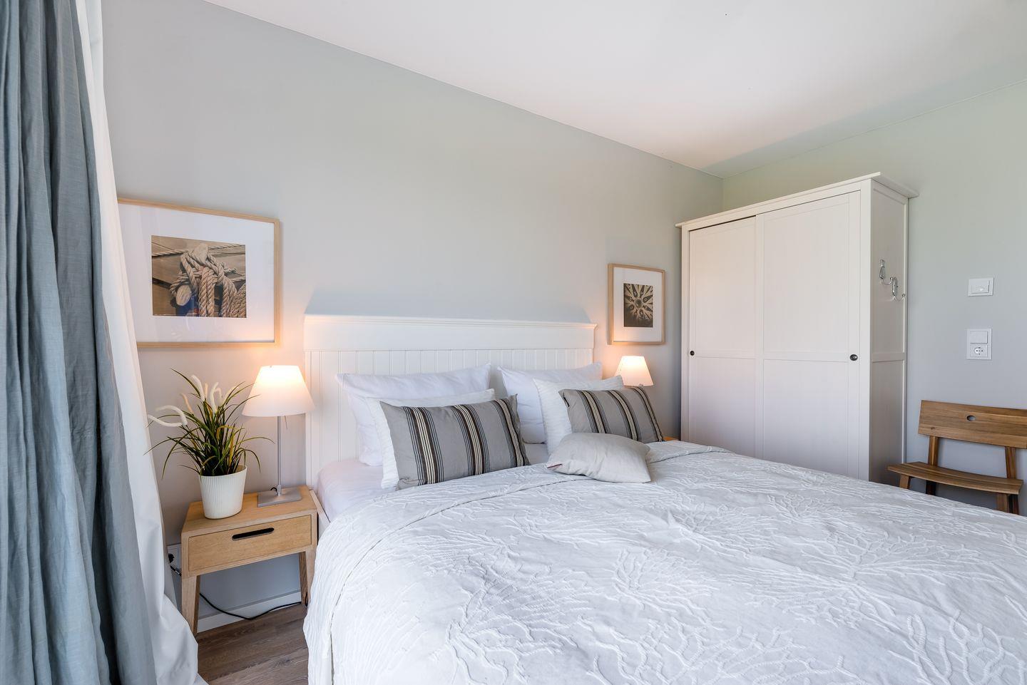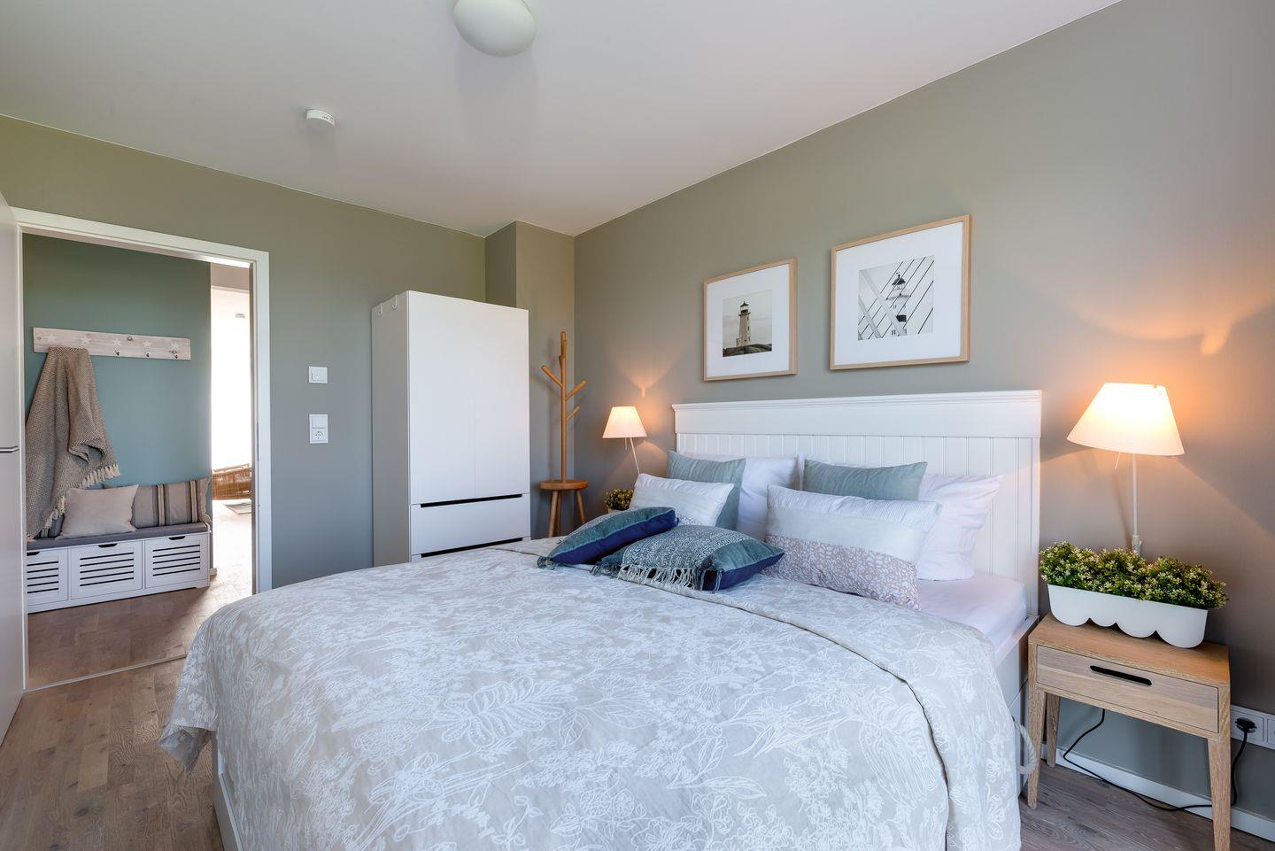 Die Wohnung verfügt über 2 Schlafzimmer, die durch bodentiefe Fenster ein Erwachen mit Blick auf die Schleimündung oder nach Maasholm ermöglichen. Beide Schlafzimmer sind mit jeweils einem Doppelbett (160x200 cm), Schiebetürenschrank, sowie Verdunklungsvorhängen ausgestattet.