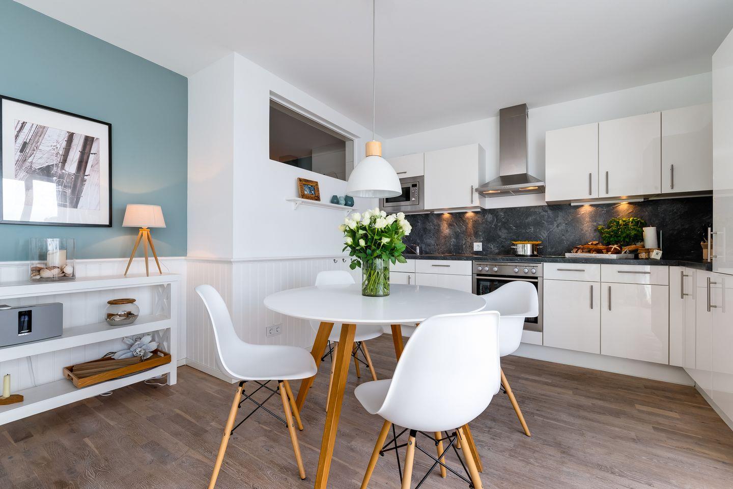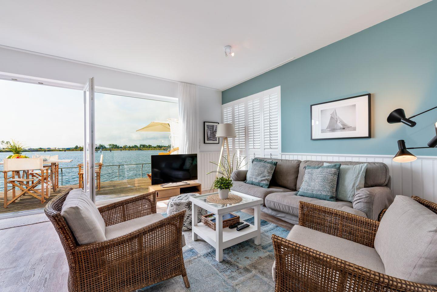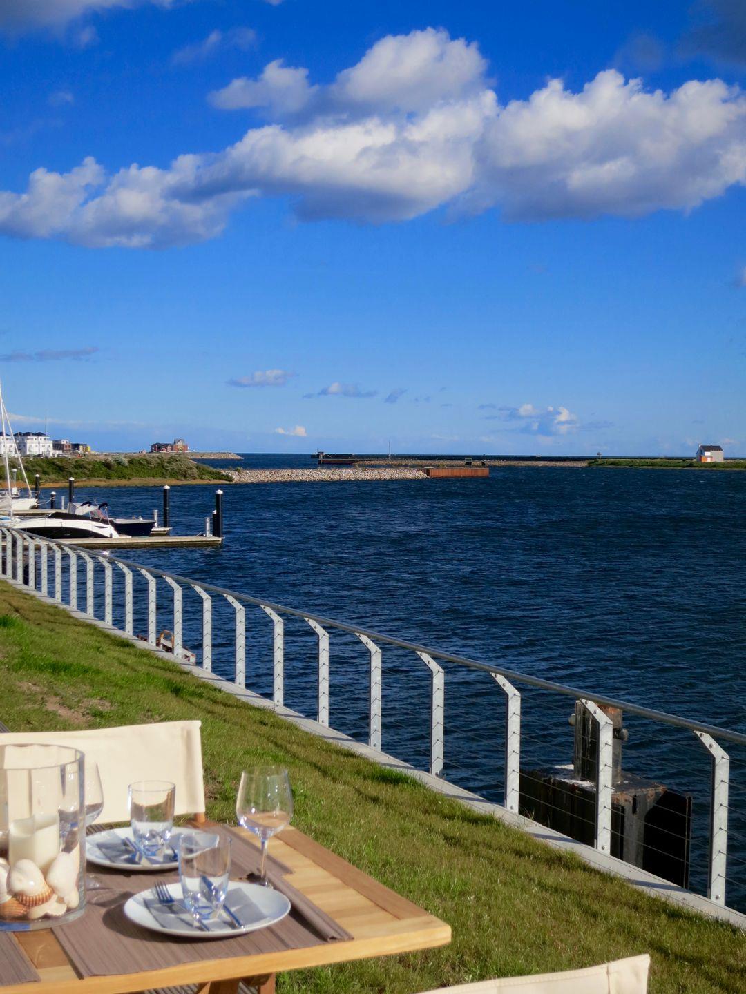 Die lichtdurchfluteten Räume der Ferienwohnung "Pier 51" strecken sich über 83 m². Der offen gestaltete Wohnraum verfügt über ein gemütliches Sofa mit Sesseln und bietet einen wunderschönen Panoramablick auf den Hafen des Resorts. Der großzügige Wohnbereich stellt einen tollen Mittelpunkt für den Familienurlaub dar. Die angrenzende offene Küche verfügt über Backofen, Mikrowelle, Geschirrspüler und diverse technische Annehmlichkeiten sowie einem Essbereich, von dem aus man bereits beim Frühstück den Blick auf das Wasser genießen kann. Relaxen Sie auf der großen Terrasse, die unmittelbar an den Yachthafen grenzt und nach Süden ausgerichtet ist. Beobachten Sie die ein- und auslaufenden Segelyachten oder angeln Sie direkt von der Terrasse aus. Für geruhsame Stunden steht Ihnen zudem ein Original-Ostsee-Strandkorb zur Verfügung.