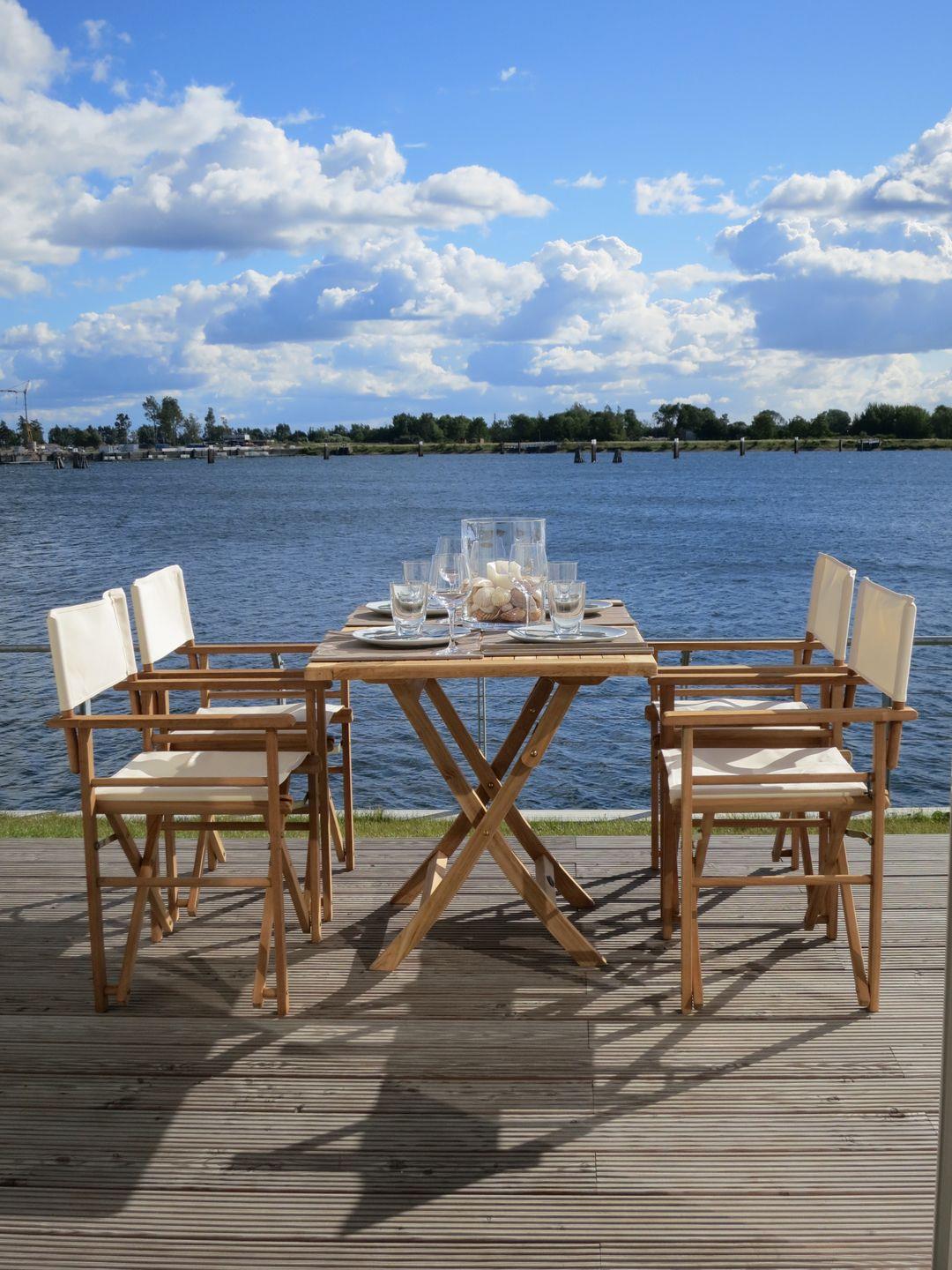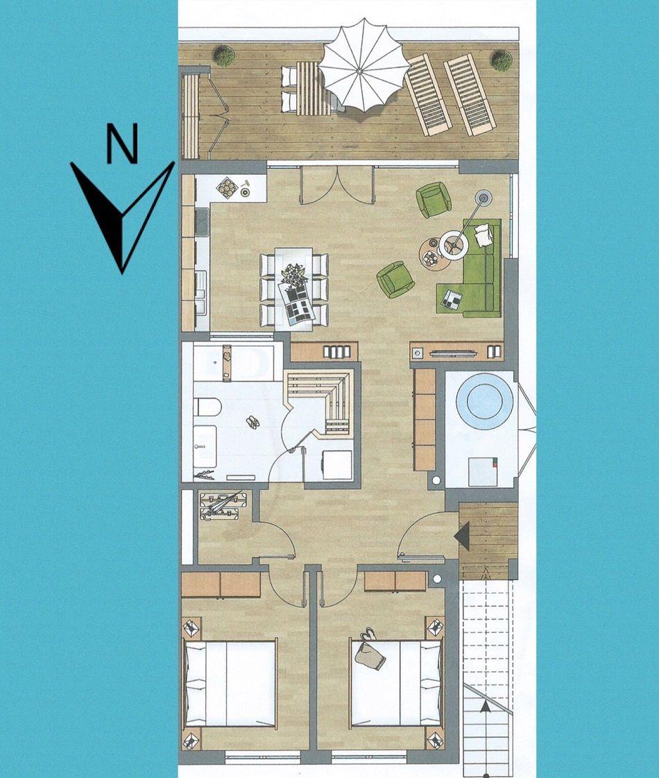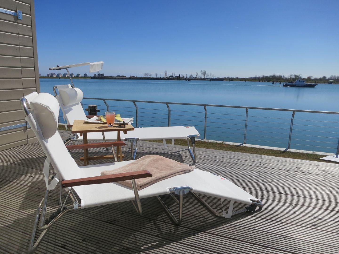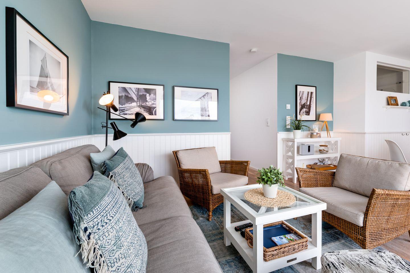 Die lichtdurchfluteten Räume der Ferienwohnung "Pier 51" strecken sich über 83 m². Der offen gestaltete Wohnraum verfügt über ein gemütliches Sofa mit Sesseln und bietet einen wunderschönen Panoramablick auf den Hafen des Resorts. Der großzügige Wohnbereich stellt einen tollen Mittelpunkt für den Familienurlaub dar. Die angrenzende offene Küche verfügt über Backofen, Mikrowelle, Geschirrspüler und diverse technische Annehmlichkeiten sowie einem Essbereich, von dem aus man bereits beim Frühstück den Blick auf das Wasser genießen kann. Relaxen Sie auf der großen Terrasse, die unmittelbar an den Yachthafen grenzt und nach Süden ausgerichtet ist. Beobachten Sie die ein- und auslaufenden Segelyachten oder angeln Sie direkt von der Terrasse aus. Für geruhsame Stunden steht Ihnen zudem ein Original-Ostsee-Strandkorb zur Verfügung.