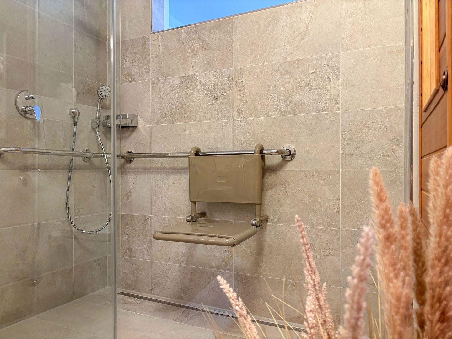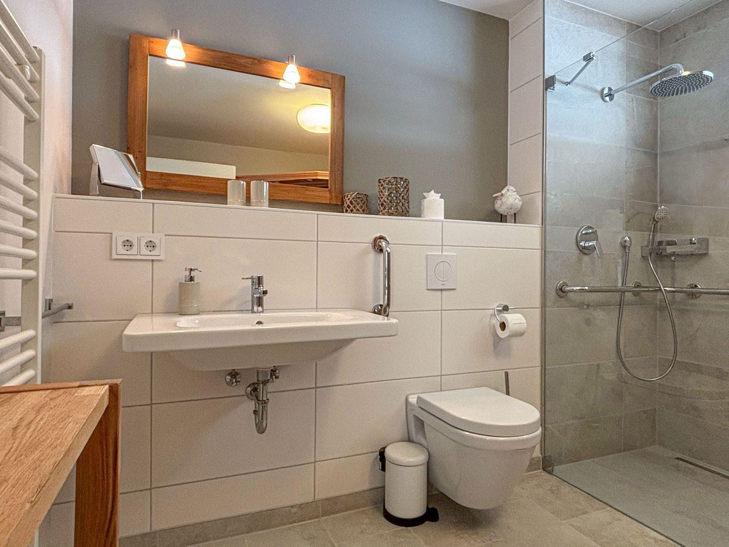 Das Bad verfügt über ein unterfahrbares Waschbecken sowie eine hochwertige und bodengleiche Regendusche mit Einhängesitz. Ein Griff neben der Toilette bietet zusätzliche Sicherheit.