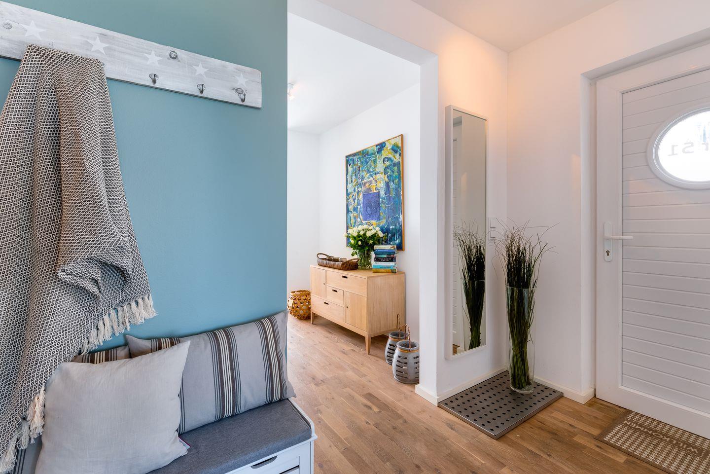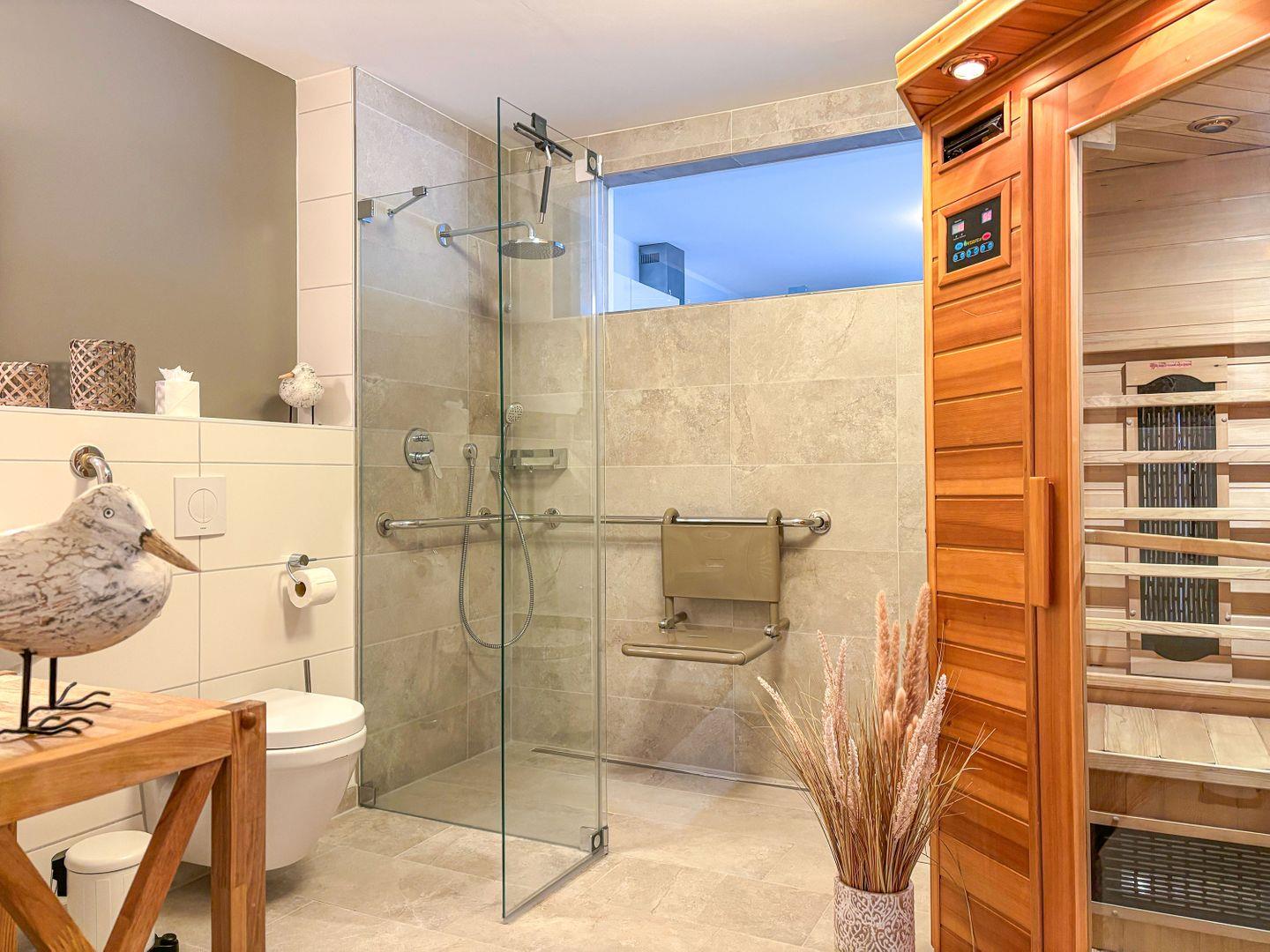 Im großen Wellnessbad mit Infrarotsauna und Stimmungslicht, einer großen barrierefreien Regendusche, WC und Waschtisch fängt der Tag besonders schön an. Bei Schietwetter kann auch hier herrlich entspannt und relaxed werden. Eine Waschmaschine ist ebenfalls vorhanden.