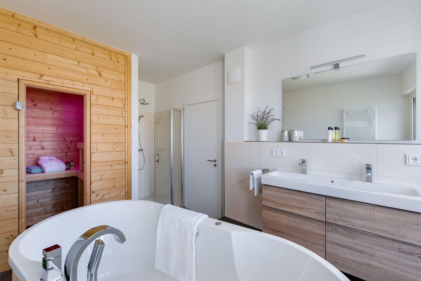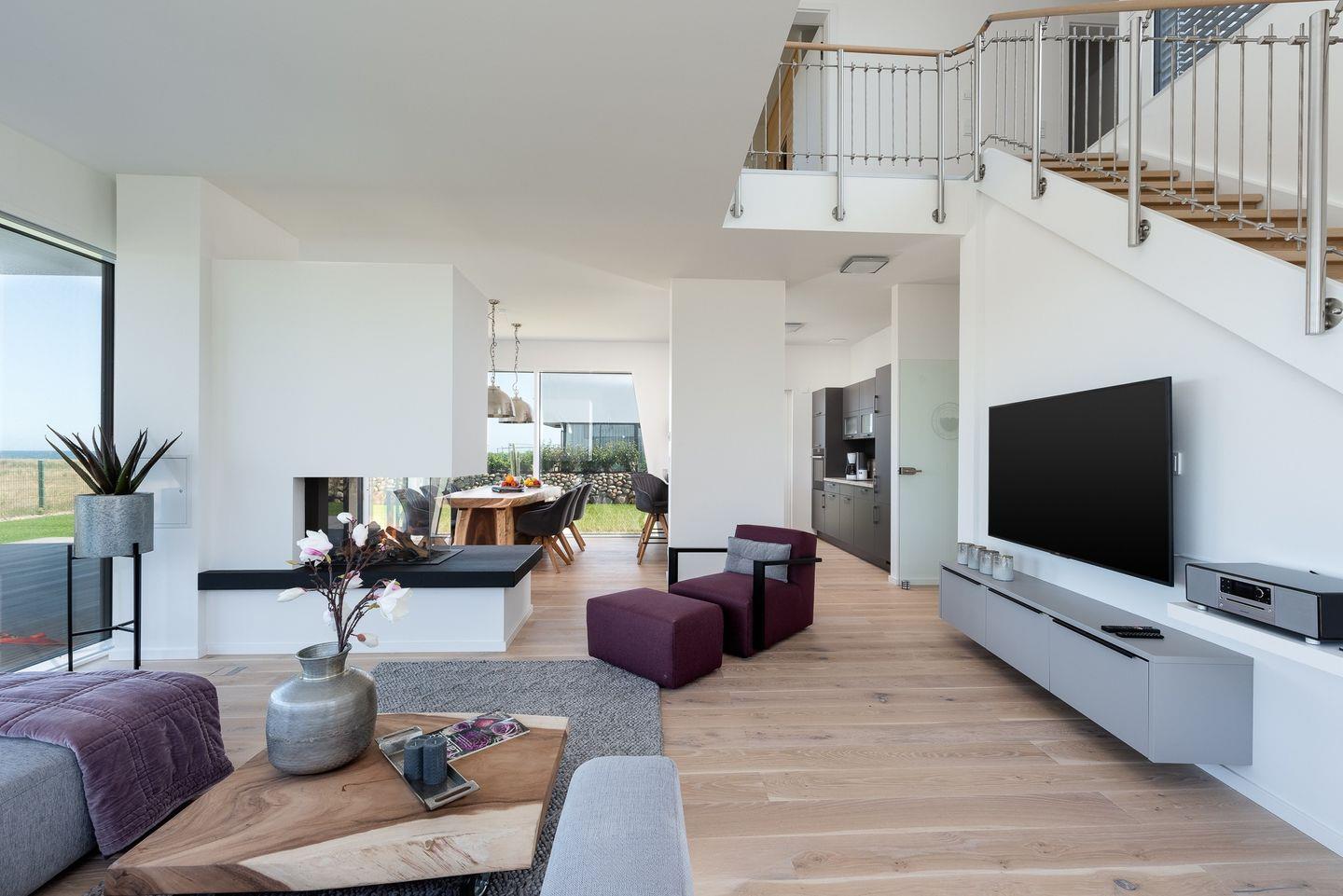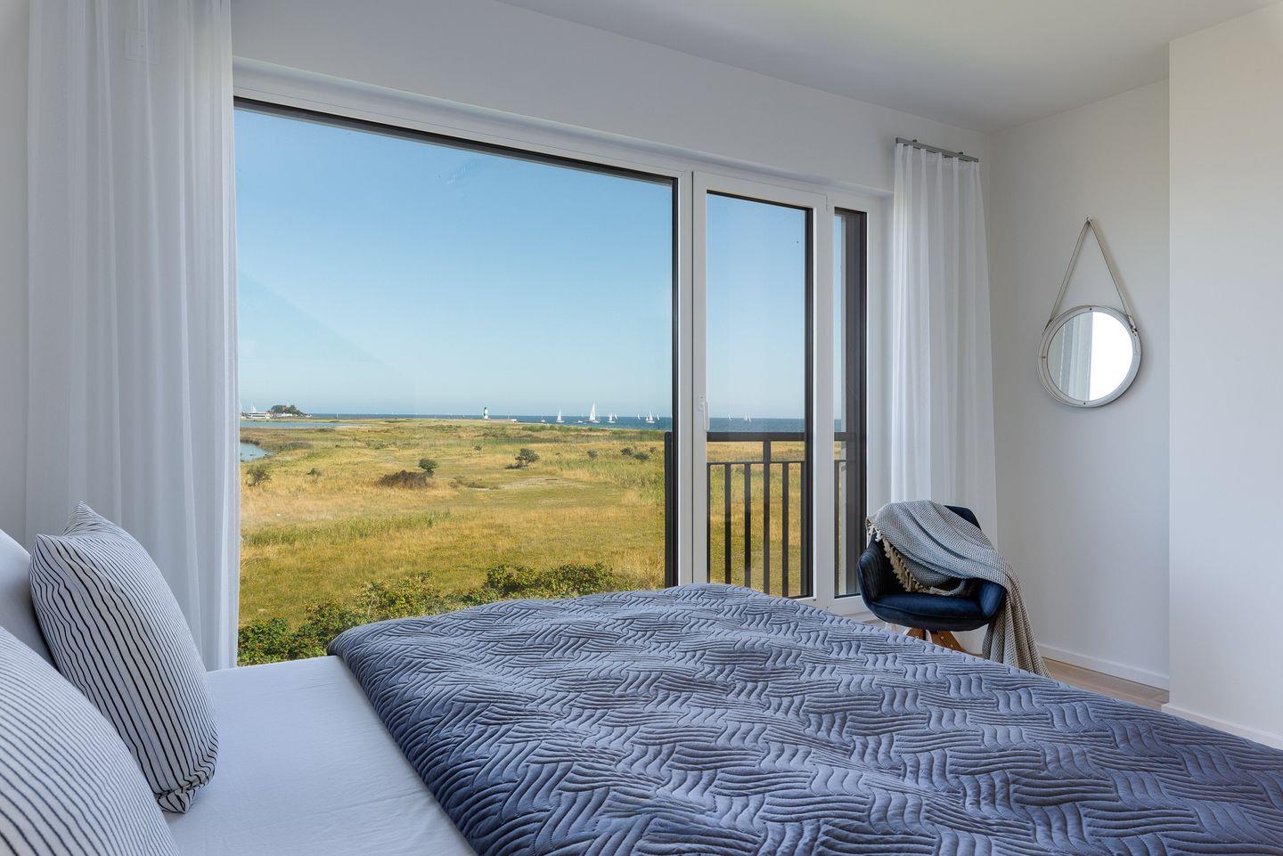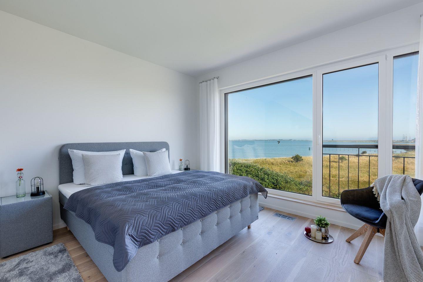 Obergeschoss: Die integrierte Treppe führt Sie ins Obergeschoss, wo Sie zwei luxuriöse Schlafzimmer und ein Badezimmer finden. Der Masterbedroom mit Boxspringbett und Panoramaverglasung lässt Ostseeträume wahr werden. Das Highlight? Das großzügige Badezimmer mit frei stehender Badewanne und einer finnischen Sauna mit Blick auf die Ostsee.