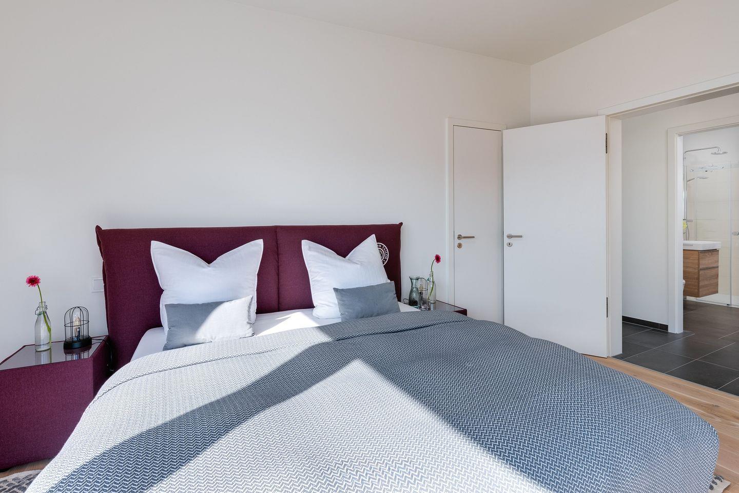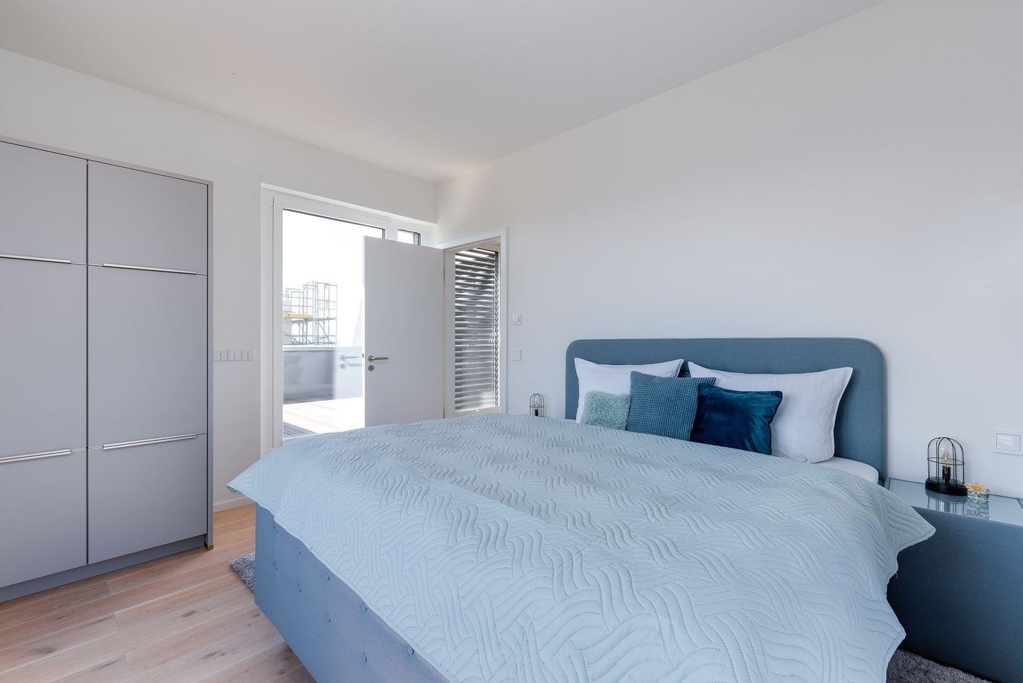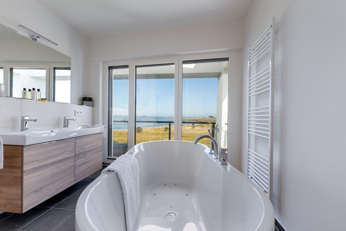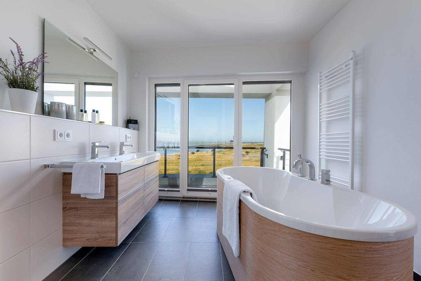 Obergeschoss: Die integrierte Treppe führt Sie ins Obergeschoss, wo Sie zwei luxuriöse Schlafzimmer und ein Badezimmer finden. Der Masterbedroom mit Boxspringbett und Panoramaverglasung lässt Ostseeträume wahr werden. Das Highlight? Das großzügige Badezimmer mit frei stehender Badewanne und einer finnischen Sauna mit Blick auf die Ostsee.