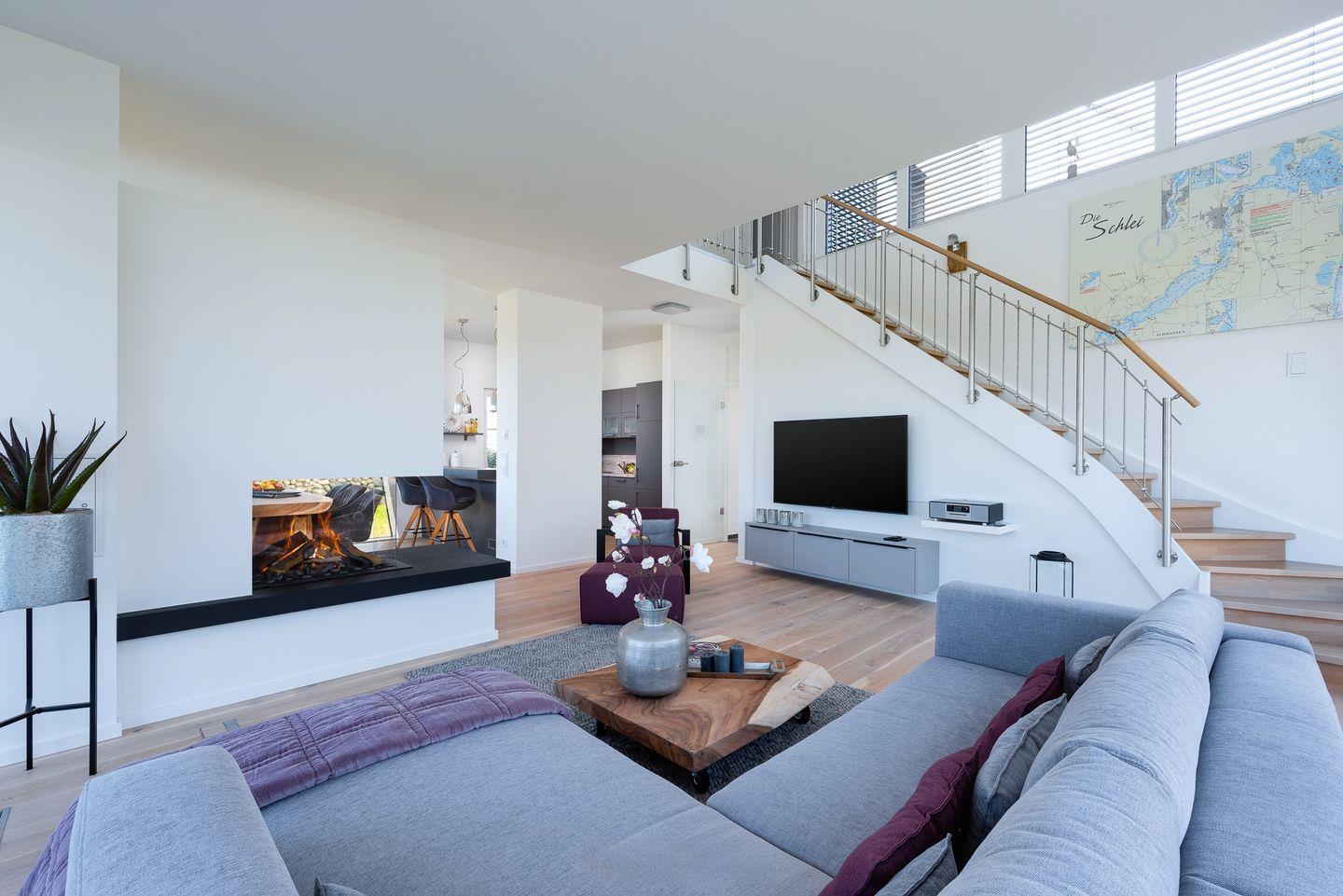 Erdgeschoss: Schon beim Betreten begrüßt Sie ein Eingangsbereich mit praktischem Abstellraum inkl. Waschmaschine und Trockner. Ein modernes Badezimmer, ein Schlafzimmer mit Boxspringbett sowie der 43 qm große offene Wohn-Essbereich mit Gas-Kaminofen und einer top-ausgestatteten offenen Küche bieten Komfort pur.
