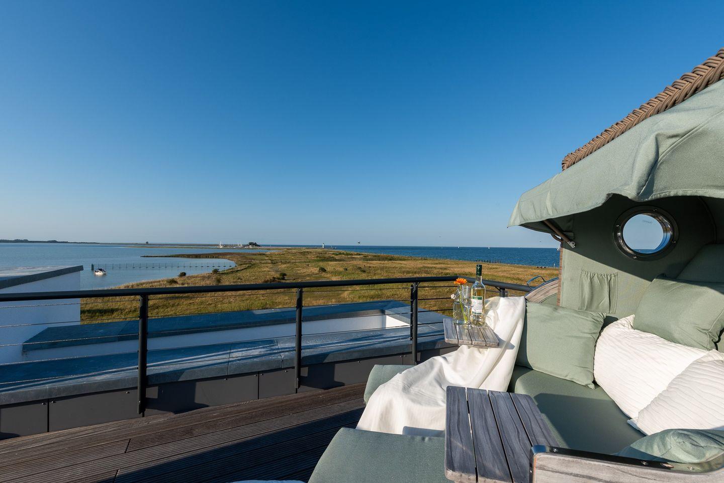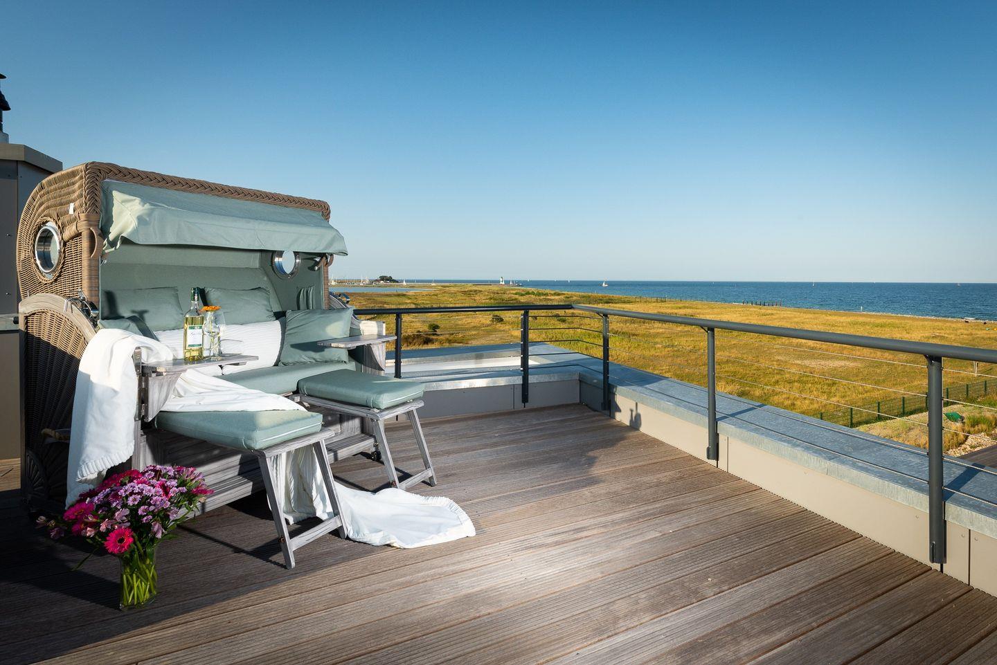 Dachterrasse: Von der oberen Etage geht es hinauf zur weitläufigen Dachterrasse. Genießen Sie im Strandkorb den unvergleichlichen Rundumblick auf Ostsee, Schlei und den Hafen des Ostseeresort Olpenitz – das Highlight für Ihren Ostseeurlaub.