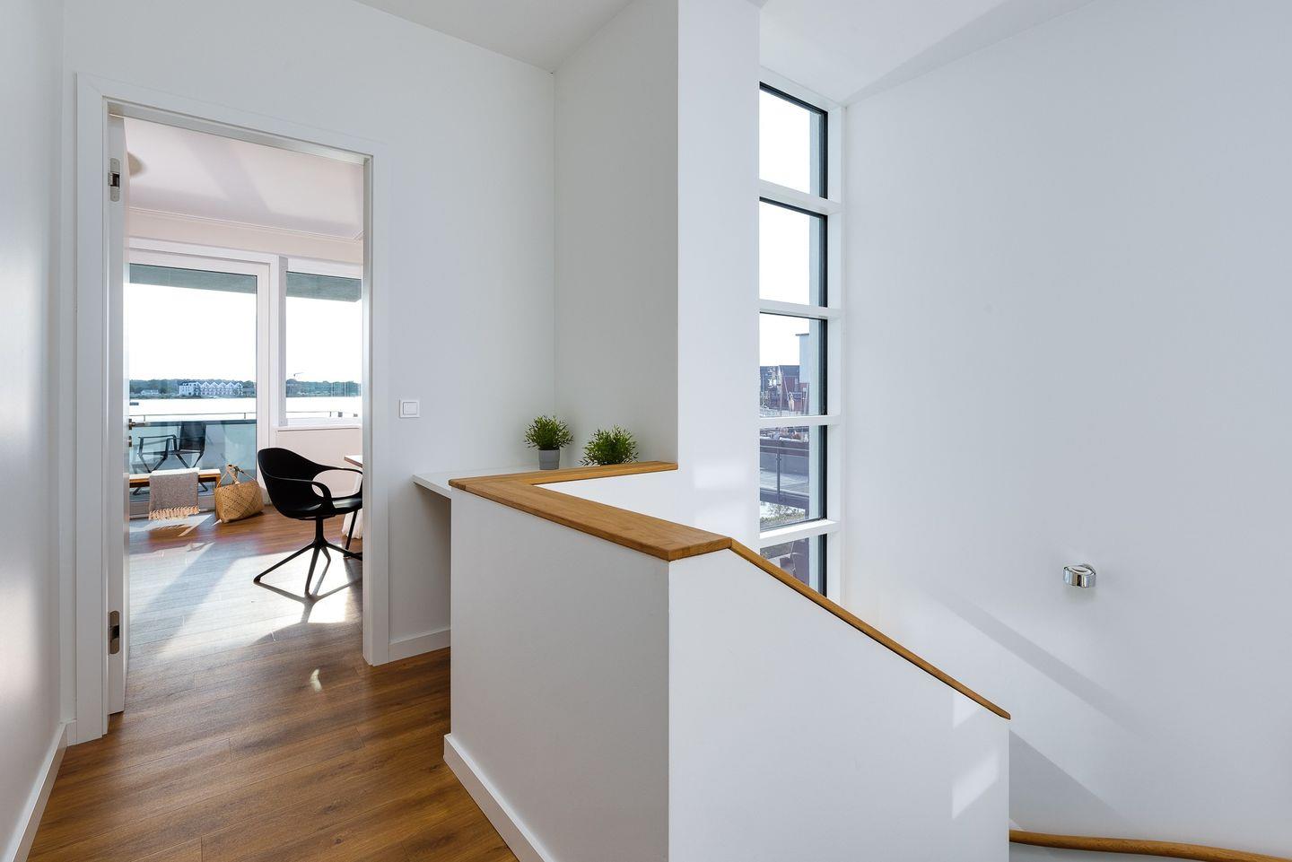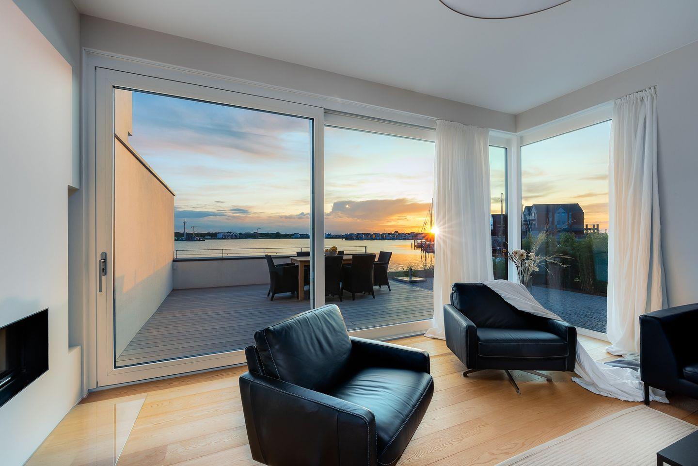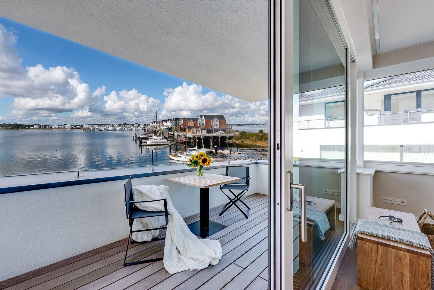 Die Ferienwohnung "Harbour Lodge" ist nach Westen ausgerichtet, sodass Sie die Sonne bis in die Abendstunden genießen können. Die Terrasse bietet viel Platz zum Entspannen und Sonnenbaden, während der Balkon mit Sitzgarnitur im ersten Stock einen atemberaubenden Blick auf den Hafen und die Ostsee bietet.