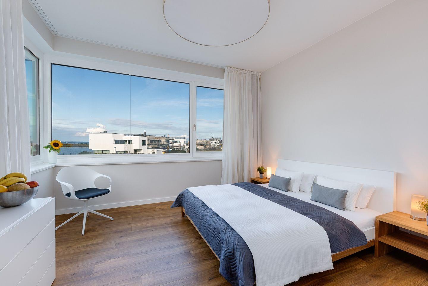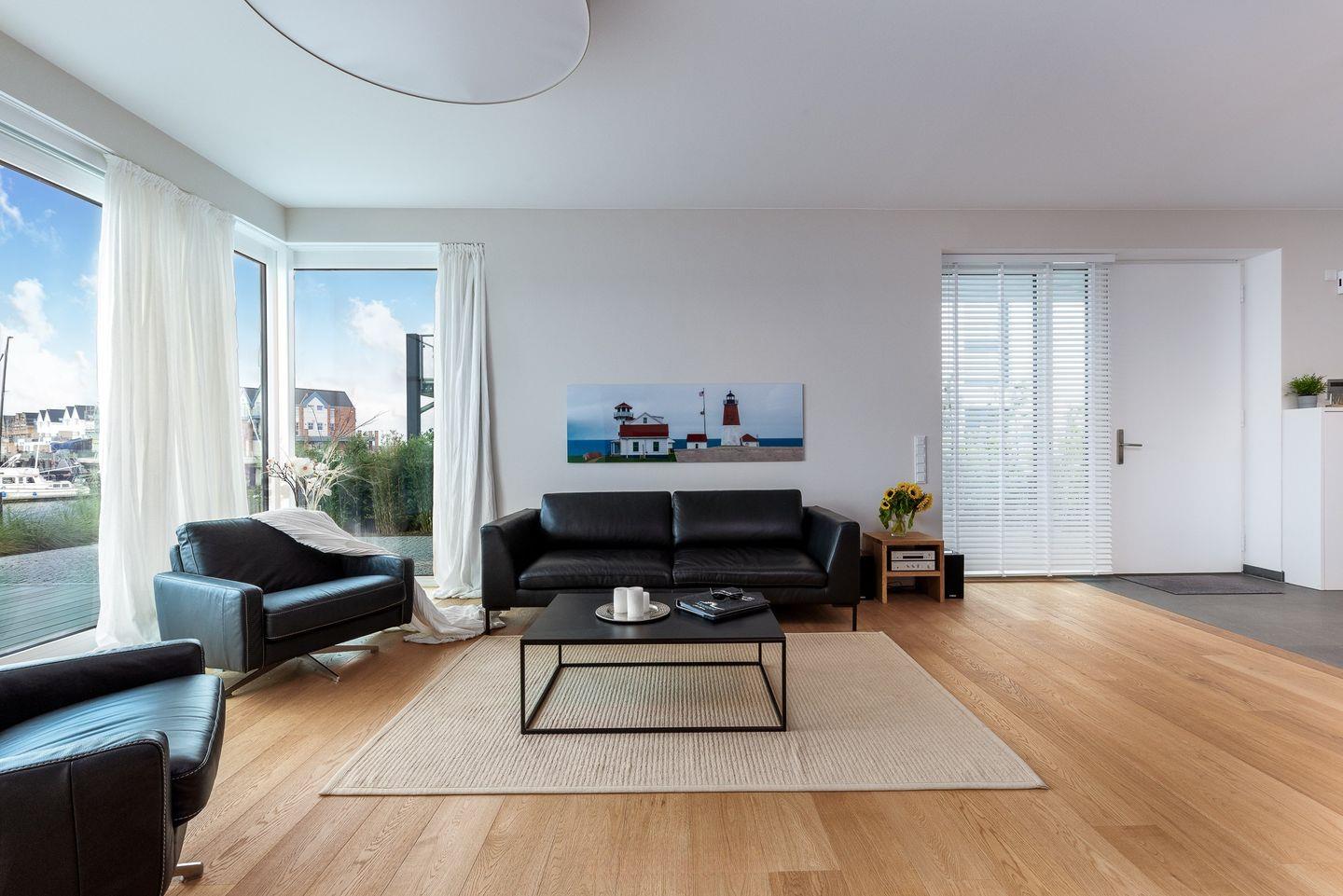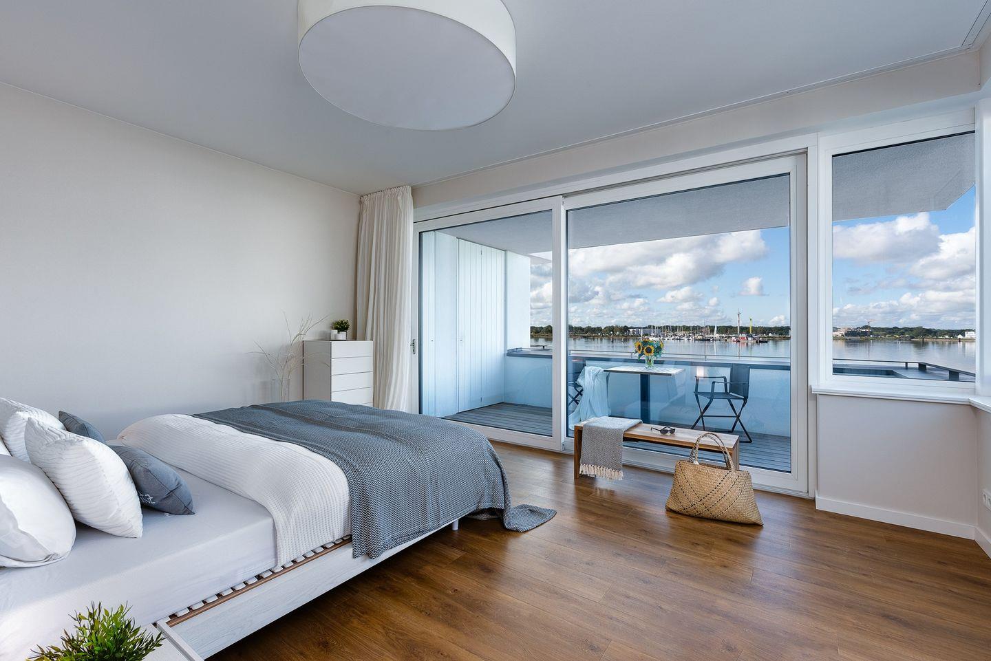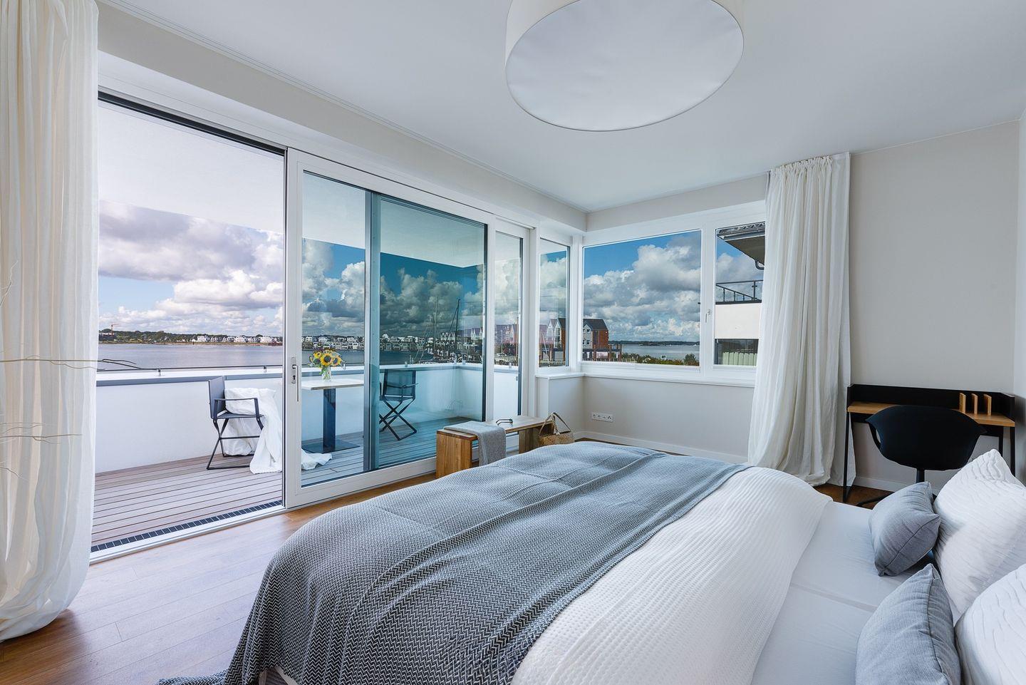 Die Ferienwohnung "Harbour Lodge" ist nach Westen ausgerichtet, sodass Sie die Sonne bis in die Abendstunden genießen können. Die Terrasse bietet viel Platz zum Entspannen und Sonnenbaden, während der Balkon mit Sitzgarnitur im ersten Stock einen atemberaubenden Blick auf den Hafen und die Ostsee bietet.