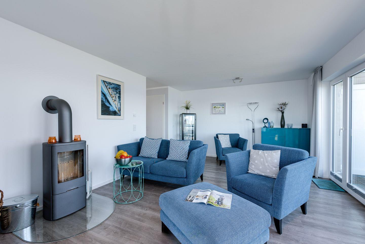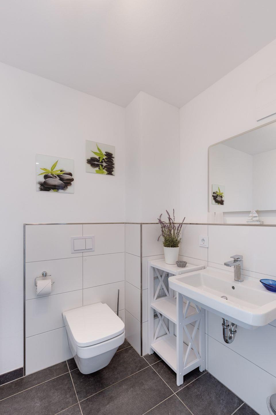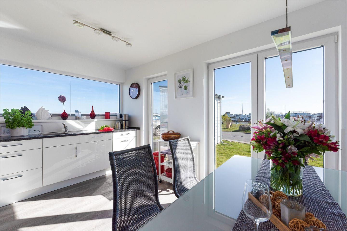 Im EG befindet sich ein Flur mit angrenzenden Gäste-WC mit Waschmaschine. Es folgt dann der große Wohnbereich mit traumhaftem Blick auf die Schlei. Im linken Hausteil ist die moderne Küche mit Essbereich und im rechten Hausteil das Wohnzimmer mit Kamin, TV und Sitzgarnitur untergebracht.Fußbodenheizung, Kaminofen und privater Wellnessbereich spenden wohligen Komfort zu jeder Jahreszeit. Zurück von einem Strandspaziergang lässt es sich in der finnischen Sauna mit Wasserblick oder in der Badewanne tiefenentspannen.
