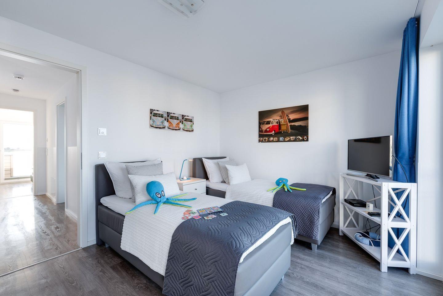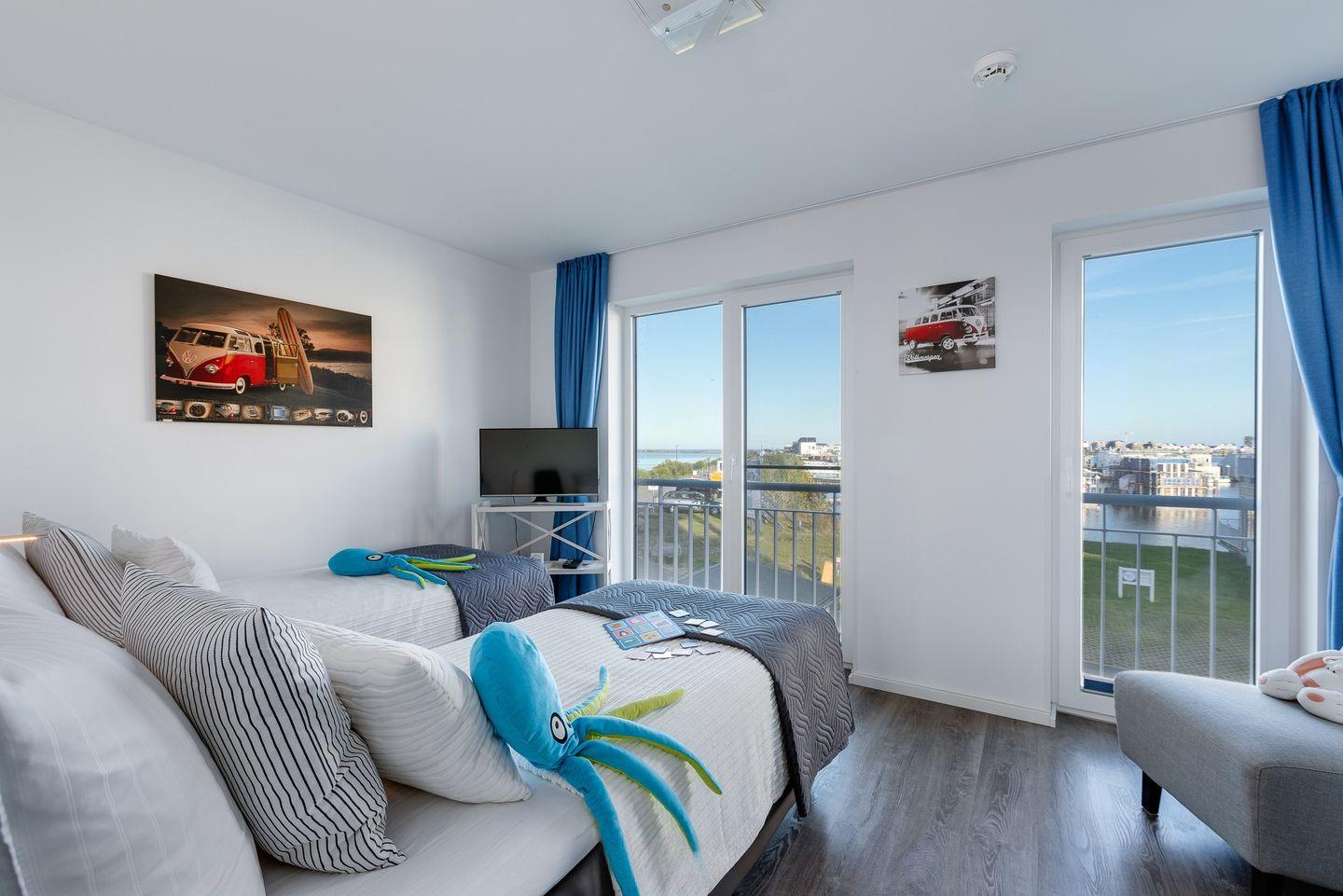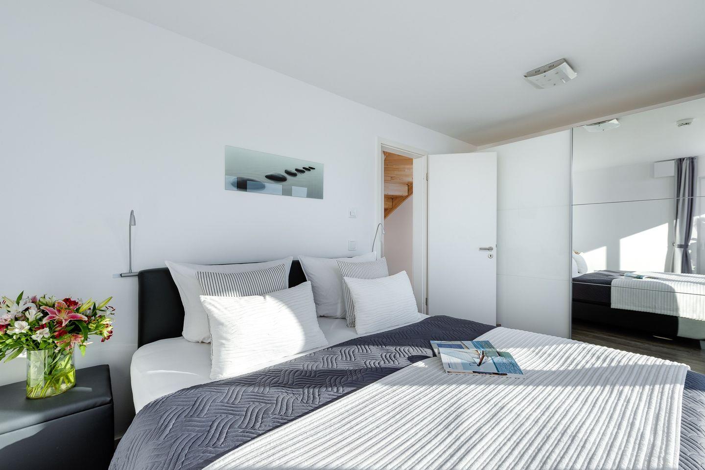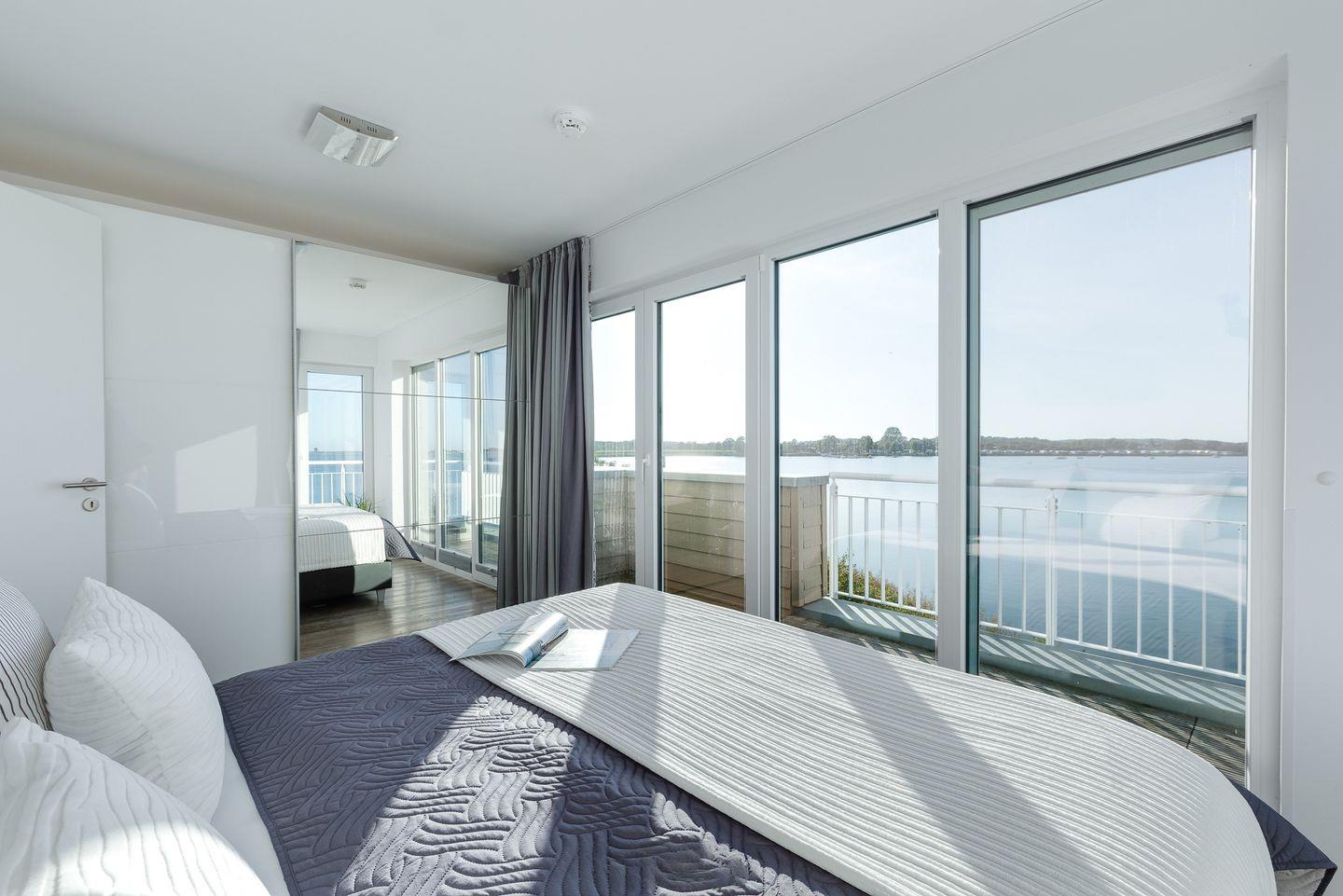 Drei Schlafzimmer laden zum Träumen ein, denn auch hier ermöglichen bodentiefe Fenster neue Perspektiven auf die unmittelbare Wasserkulisse. Ausgeschlafen erwachen und Ostseebrise schnuppern. Zwei der Schlafzimmer befinden sich im 1. Obergeschoss, eins mit bequemen Doppelbett und Schleiblick und ein weiteres mit 2 Einzelbetten. Mit einem Heißgetränk darf der Gast hier der Natur beim Wachwerden zuschauen und in einen unvergesslichen Urlaubstag starten.Zwei weitere Schlafplätze bietn zwei gemütliche Schlafsessel im Dachgeschoss. Auch hier ist Einschlafen und Aufwachen bei Wasserblick garantiert.