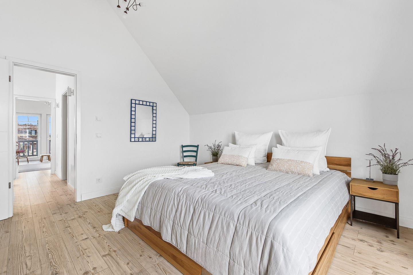 Im Obergeschoss des Ferienhaus „Emily“ befinden sich die beiden Schlafräume. Ein Schlafzimmer verfügt über ein Doppelbett (1,80 x 2,00 m), einen Kleiderschrank und einen Flachbildfernseher. Von diesem Zimmer aus haben Sie Zugang zum Balkon und einen Ausblick über die Hafeneinfahrt des Ostseeresorts.Ein weiteres Schlafzimmer auf der gegenüberliegenden Seite des Obergeschosses bietet ein Doppelbett (1,40 x 2,00 m), ein Einzelbett (1,00 x 2,00 m) und ein Ausziehbett (0,90 x 1,90 m). Dieses Zimmer ist ebenfalls mit einem Kleiderschrank und einer Fußbodenheizung ausgestattet.