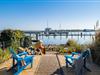 Die große Terrasse mit Zugang vom Wohnzimmer liegt direkt am Wasser. Sie ist nach Süden ausgerichtet und mit Gartenmöbeln ausgestattet. Ein Grill ermöglicht die Zubereitung von Speisen im Freien. Ein Strandkorb steht für windige Tage bereit. Von hier aus können Sie das Geschehen im Hafen und das Ein- und Auslaufen der Segelschiffe beobachten.