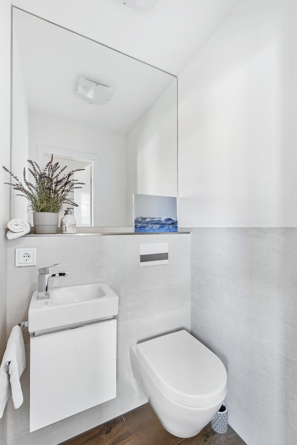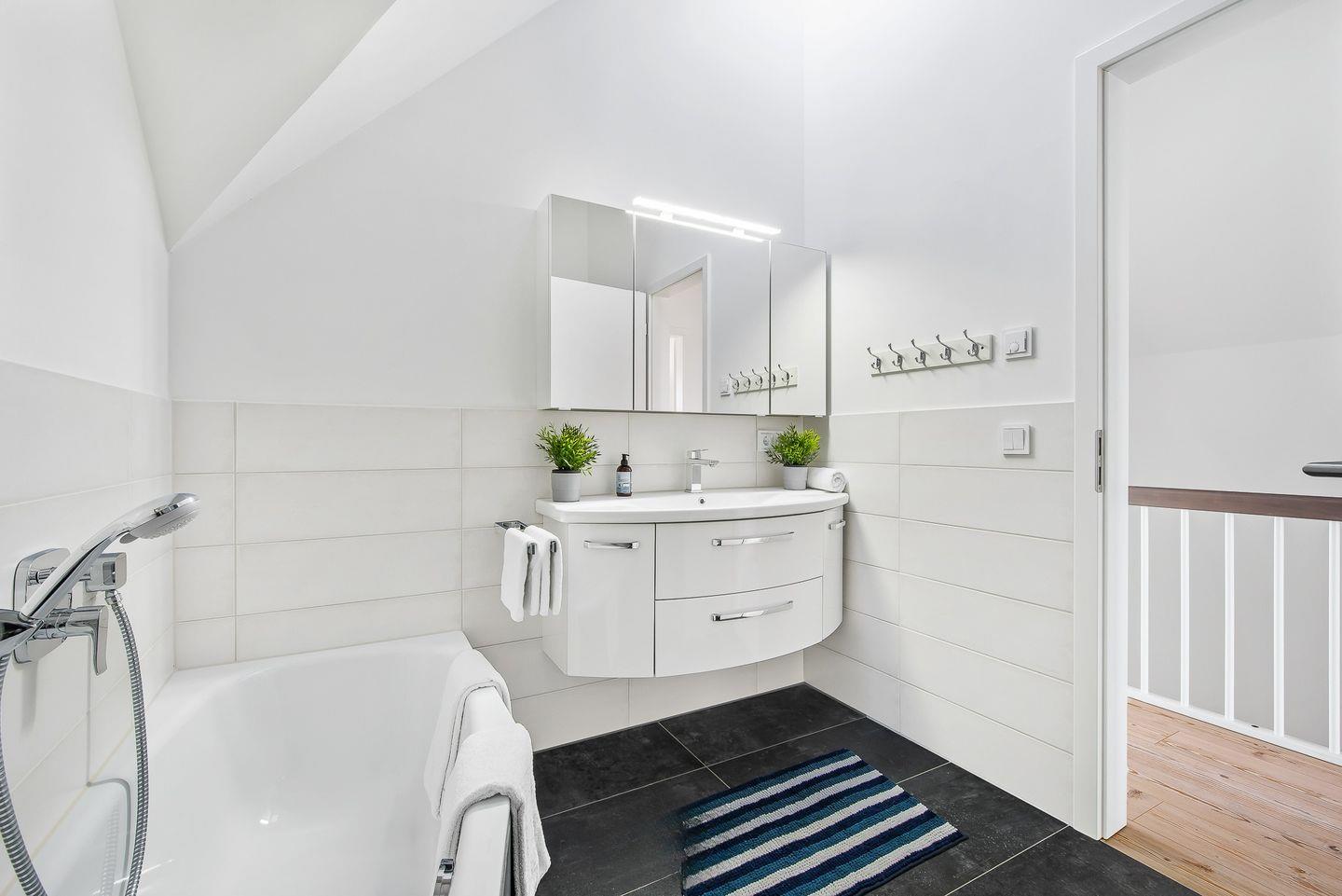Das große Badezimmer verfügt über eine Dampfsauna von Hoesch mit verschiedenen Wellness-Funktionen. Zusätzlich stehen eine Badewanne und ein Gäste-WC im Erdgeschoss zur Verfügung.