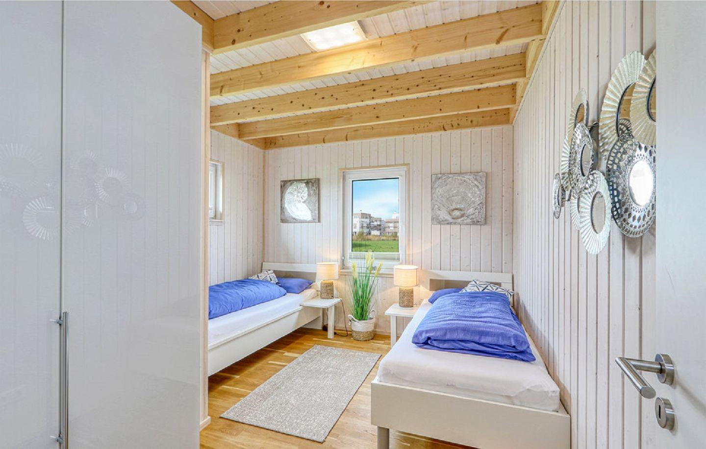 Im Erdgeschoss findest Du zwei Schlafzimmer. Eines verfügt über ein Boxspring-Doppelbett (180 x 200 cm) und einen Flachbild-TV, das zweite über zwei Einzelbetten (90 x 200 cm), ebenfalls mit TV ausgestattet. In beiden Schlafzimmern steht Dir jeweils ein Kleiderschrank zur Verfügung.