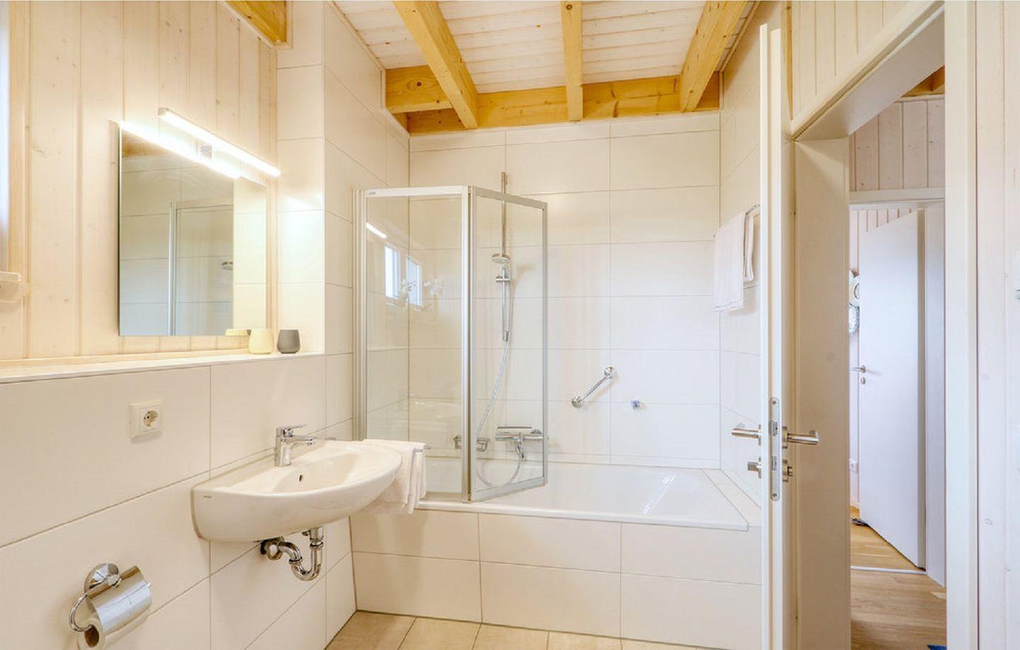 Das Wannenbad im Erdgeschoss bietet einen kleinen Kosmetikspiegel und das Highlight des Hauses: eine Infrarot-Sauna. Es ist der ideale Ort zum Entspannen. Im Obergeschoss befindet sich ein zweites Bad mit Dusche und ebenfalls einem kleinen Kosmetikspiegel.