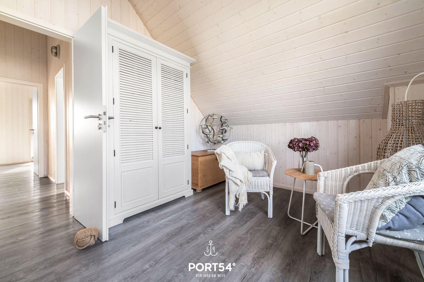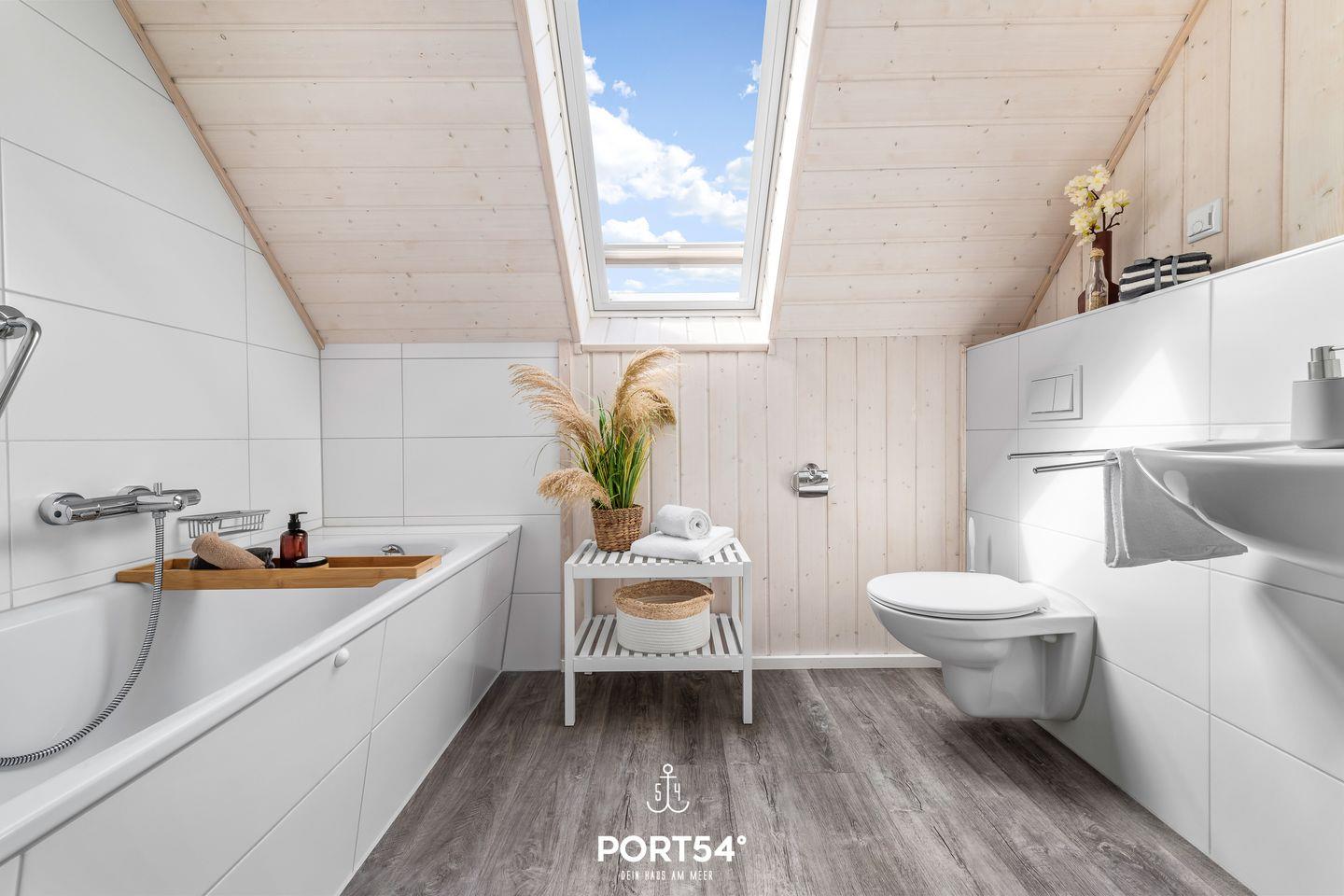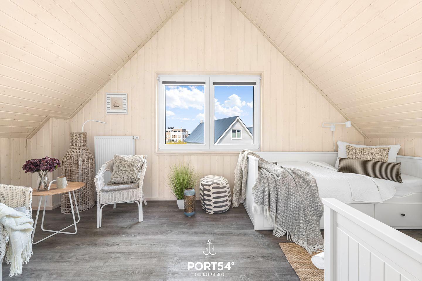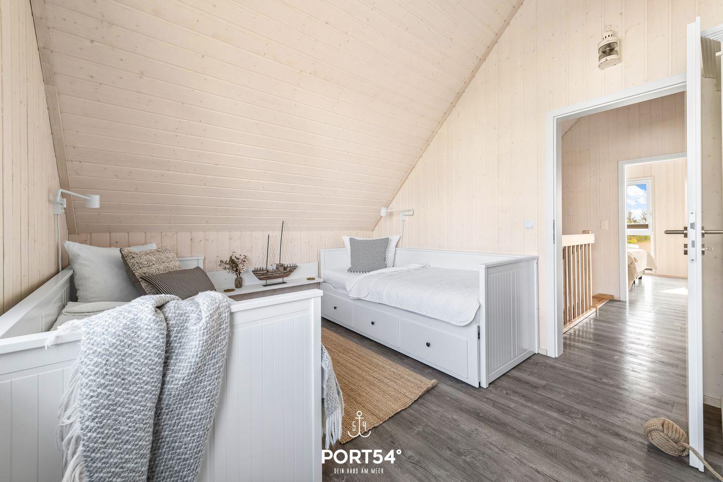 Im Obergeschoss findest Du zwei Schlafzimmer, eines verfügt über ein Doppelbett (180 x 200 cm), das zweite Schlafzimmer ist mit zwei Einzelbetten (90 x 200 cm) ausgestattet. Ein Schlafsofa bietet zwei Kindern weitere Schlafmöglichkeiten. Damit einem erholsamen Schlaf nichts entgegensteht, sind beide Schlafzimmer mit Verdunkelungsmöglichkeiten ausgestattet. Außerdem findest Du im Obergeschoss ein Badezimmer mit Badewanne zum Relaxen.