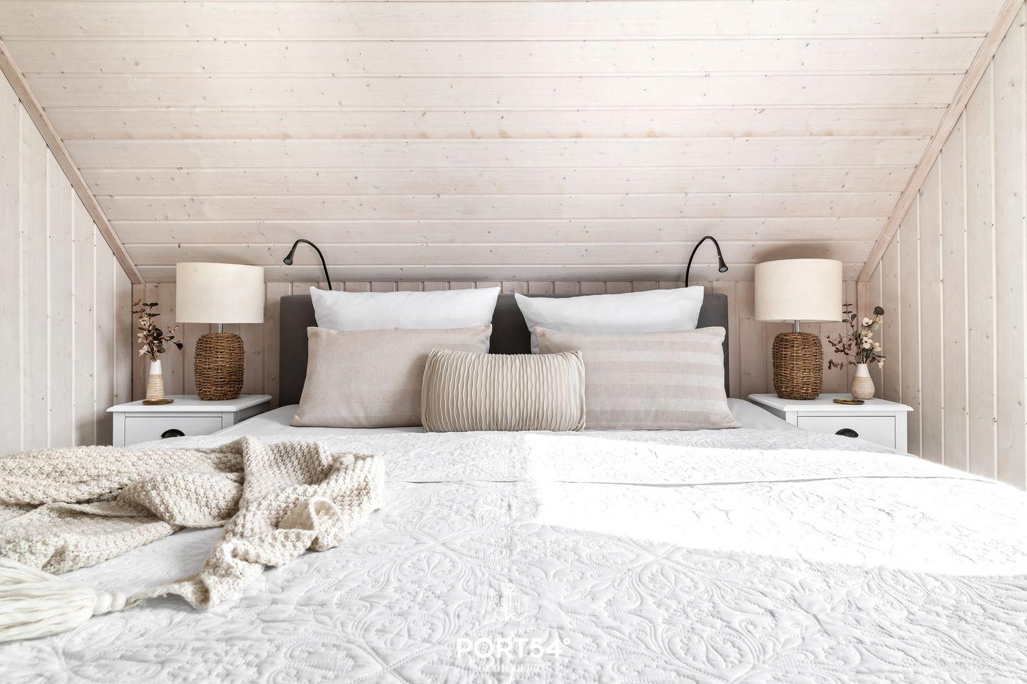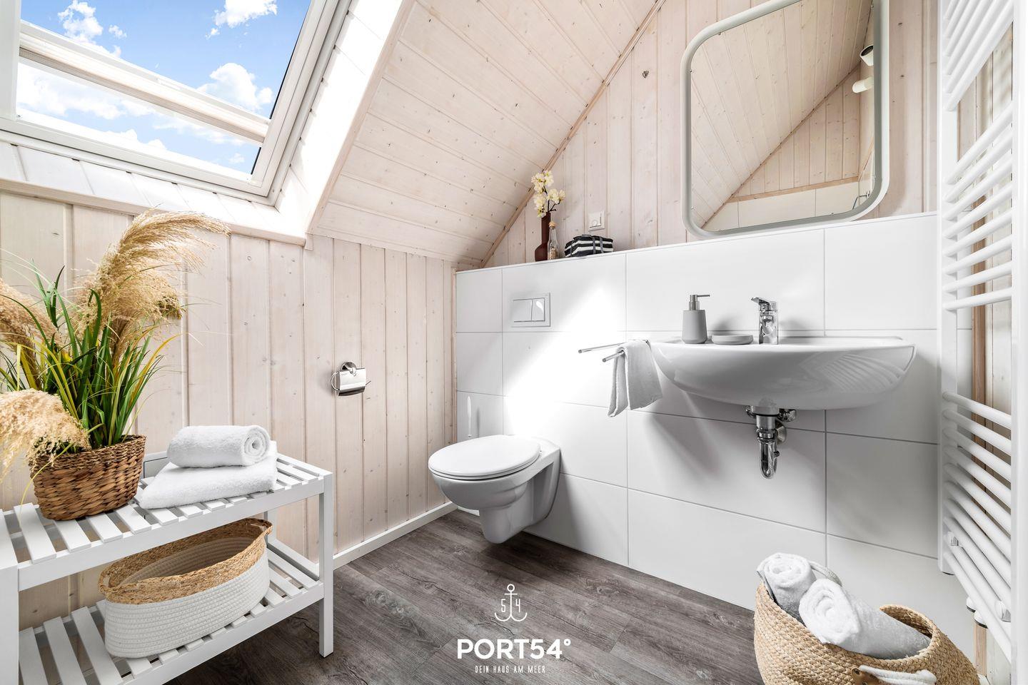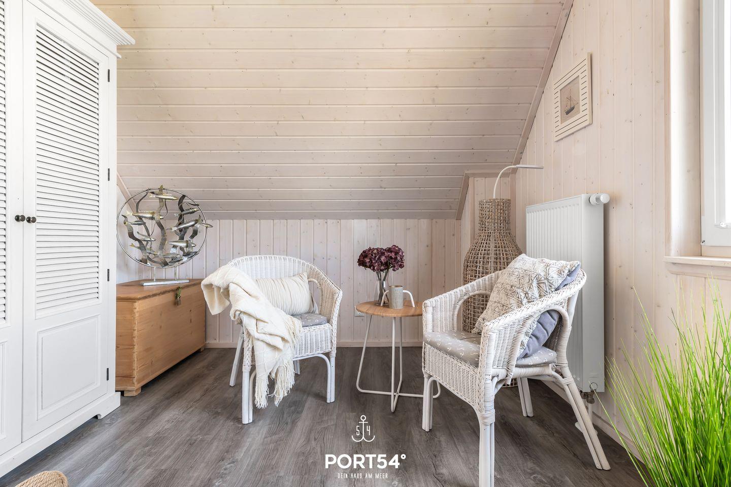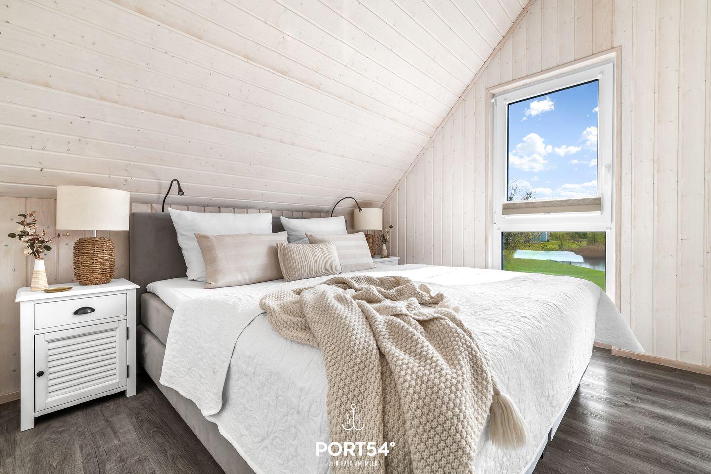 Im Obergeschoss findest Du zwei Schlafzimmer, eines verfügt über ein Doppelbett (180 x 200 cm), das zweite Schlafzimmer ist mit zwei Einzelbetten (90 x 200 cm) ausgestattet. Ein Schlafsofa bietet zwei Kindern weitere Schlafmöglichkeiten. Damit einem erholsamen Schlaf nichts entgegensteht, sind beide Schlafzimmer mit Verdunkelungsmöglichkeiten ausgestattet. Außerdem findest Du im Obergeschoss ein Badezimmer mit Badewanne zum Relaxen.