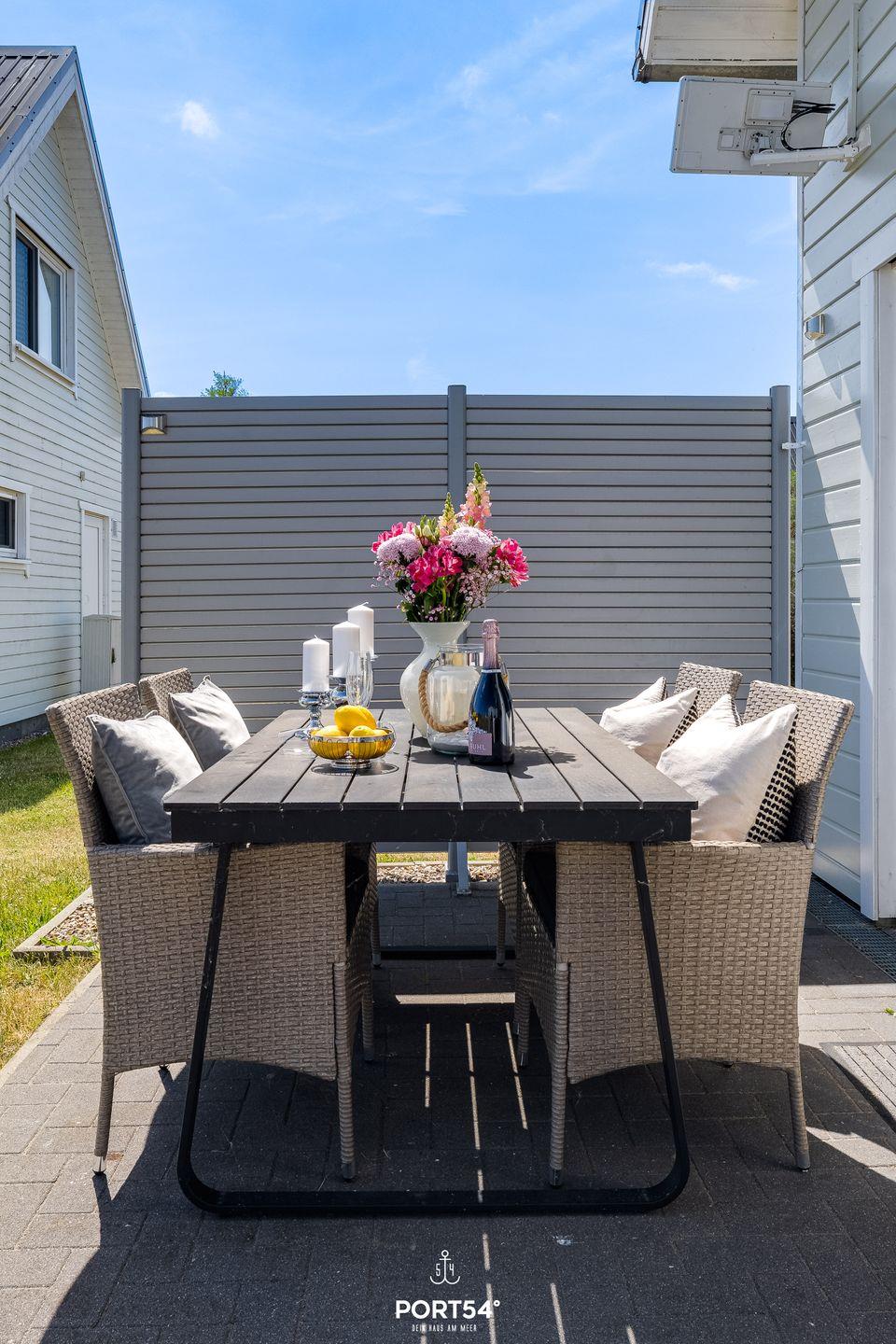 Draußen erwartet Dich eine einladende Terrasse mit komfortablen Outdoormöbeln und einer Sonnenliege. Dank Sicht- und Windschutz auf beiden Seiten der Terrasse kannst Du hier ungestört relaxen und die frische Meeresluft genießen. Ein Fahrradständer und ein abschließbarer Fahrradschuppen stehen Dir für Deine mitgebrachten oder beim Tourguide gemieteten Fahrräder bereit, sodass Du die Umgebung bequem erkunden kannst. Für gesellige Grillabende steht Dir ebenfalls ein Holzkohlegrill zur Verfügung.