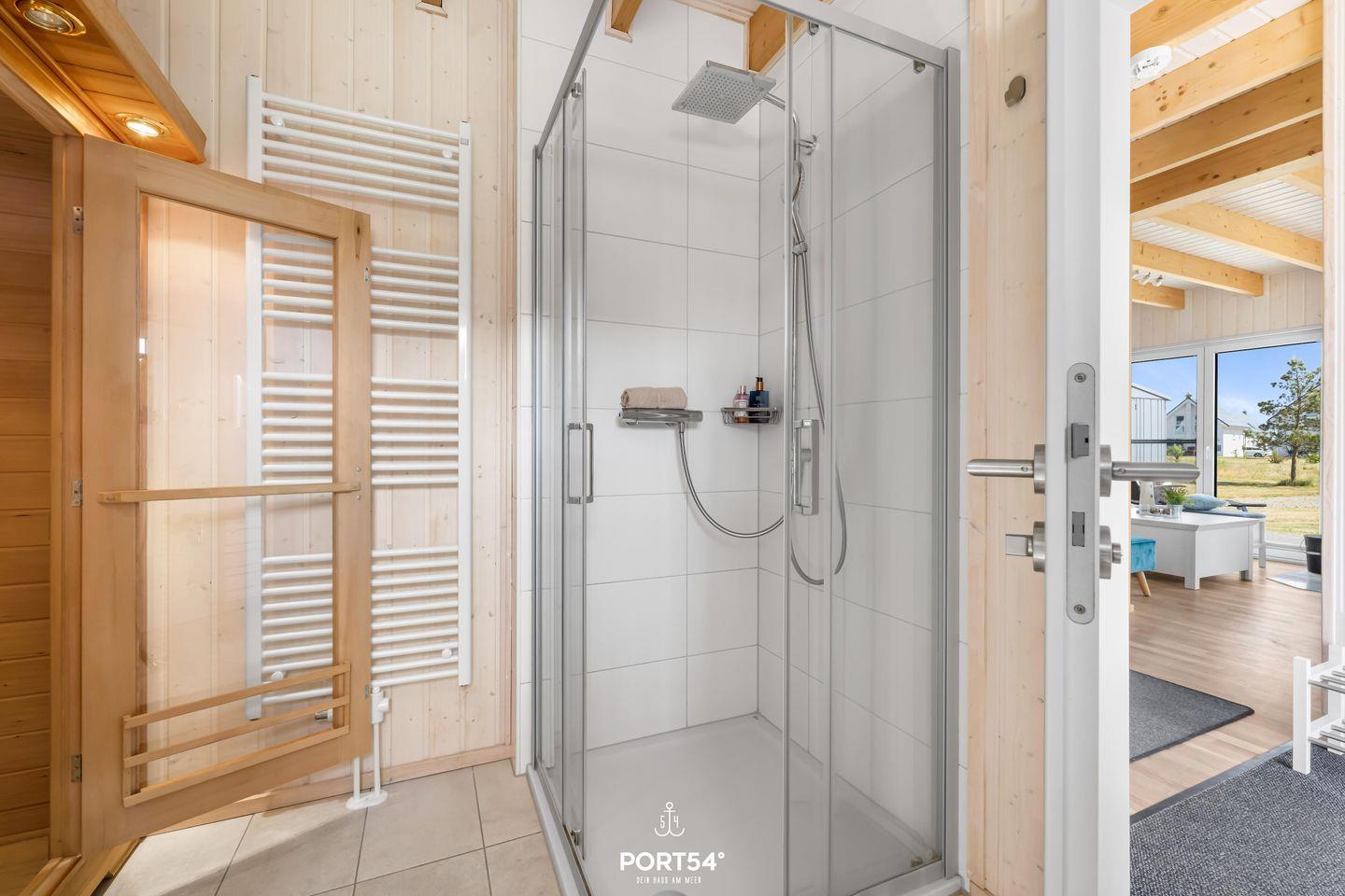 Die beiden modernen Badezimmer lassen keine Wünsche offen. Im Erdgeschoss erwartet Dich ein wahres Wellness-Erlebnis: eine luxuriöse Dusche mit Regendusche, ein Föhn, ein WC und ein beleuchteter Spiegel. Das Highlight ist die Infrarotsauna, die für wohltuende Entspannung sorgt. Genieße die Wärme der Infrarotstrahlen und gönne Dir eine kleine Auszeit. Ein Handtuchheizkörper und ein Radio sorgen für zusätzlichen Komfort, während das Fenster mit Sichtschutz Privatsphäre garantiert.