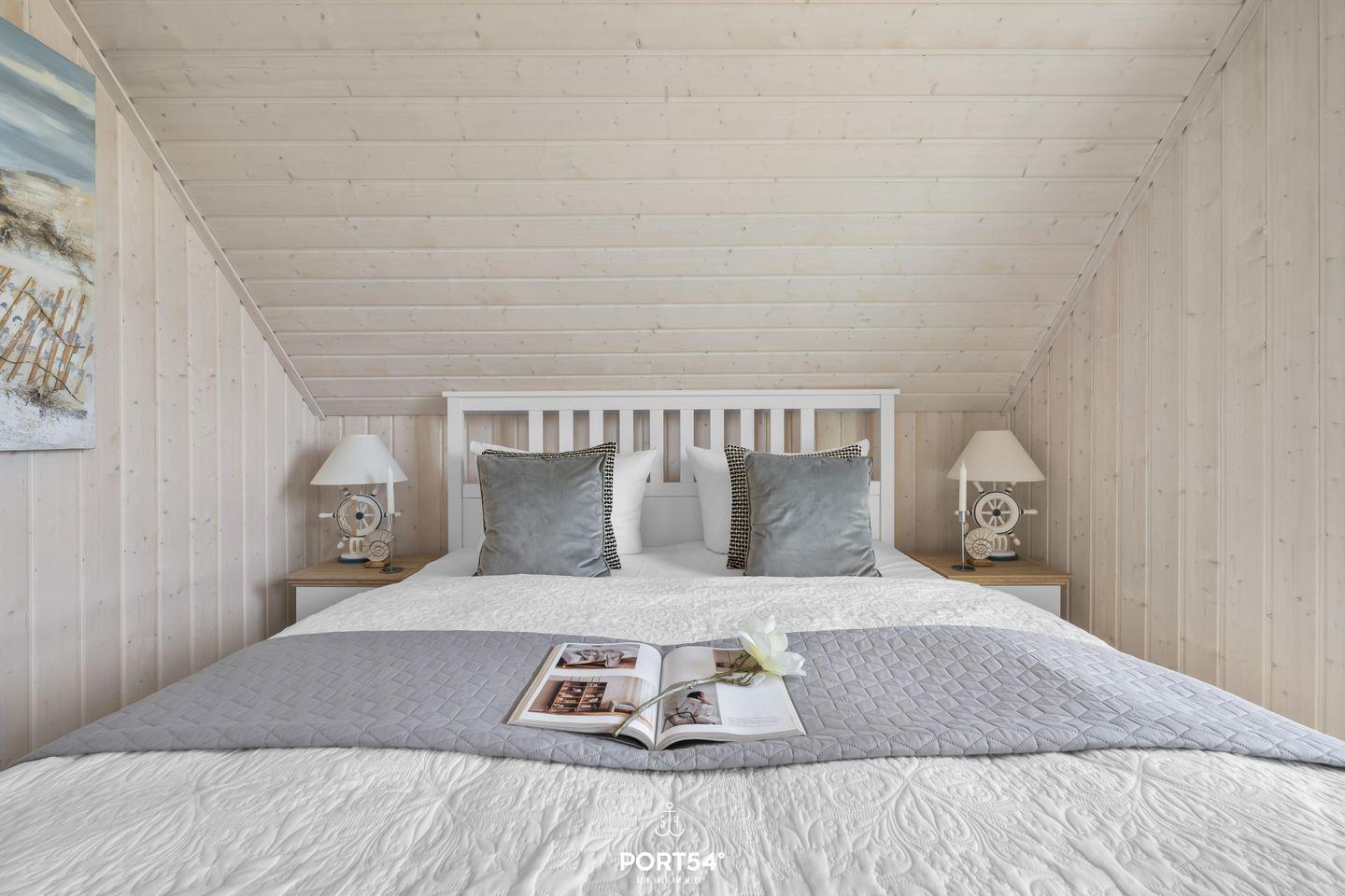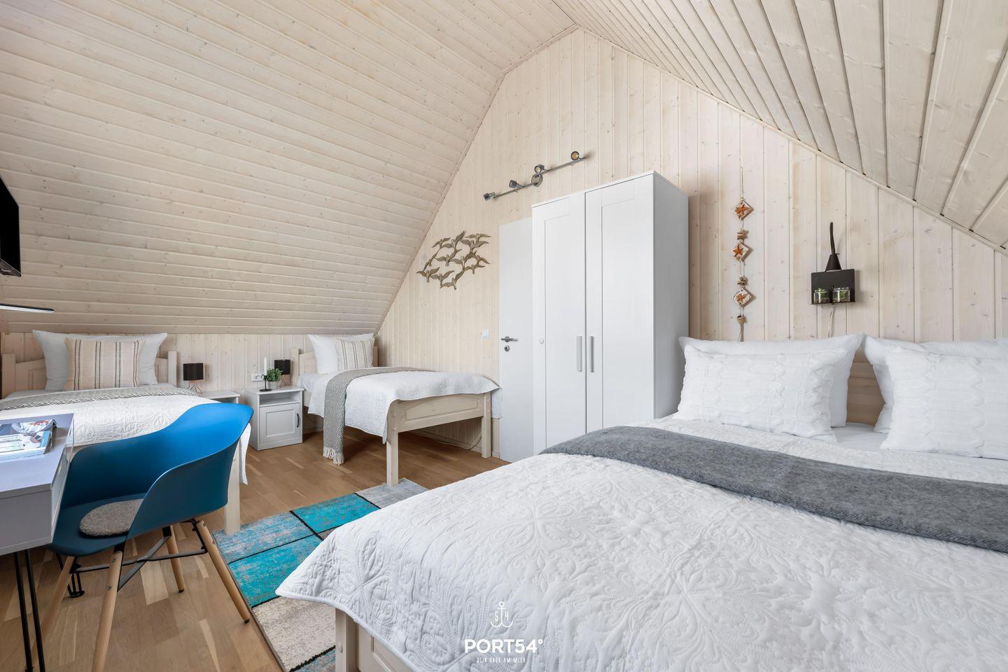 Das Ferienhaus verfügt über drei geschmackvoll eingerichtete Zimmer, darunter zwei behagliche Schlafzimmer. Das erste Schlafzimmer erwartet Dich mit einem großzügigen Doppelbett (180 x 200 cm), einem geräumigen Kleiderschrank, einem Smart-TV und einer weiteren Stereoanlage – ideal für entspannte Stunden vor dem Schlafengehen. Im zweiten Schlafzimmer findest Du ein Doppelbett (140 x 200 cm) und zwei Einzelbetten (je 90 x 200 cm) sowie einen Smart-TV. Beide Schlafzimmer sind mit Verdunkelungsmöglichkeiten, Insektenschutz sowie jeweils mit einem Turmventilator für warme Sommertage ausgestattet, sodass Du ungestört schlafen kannst.