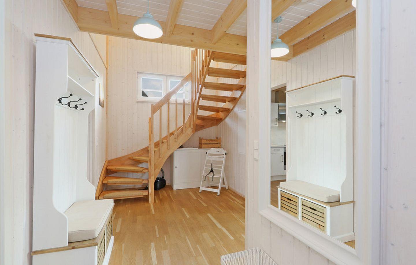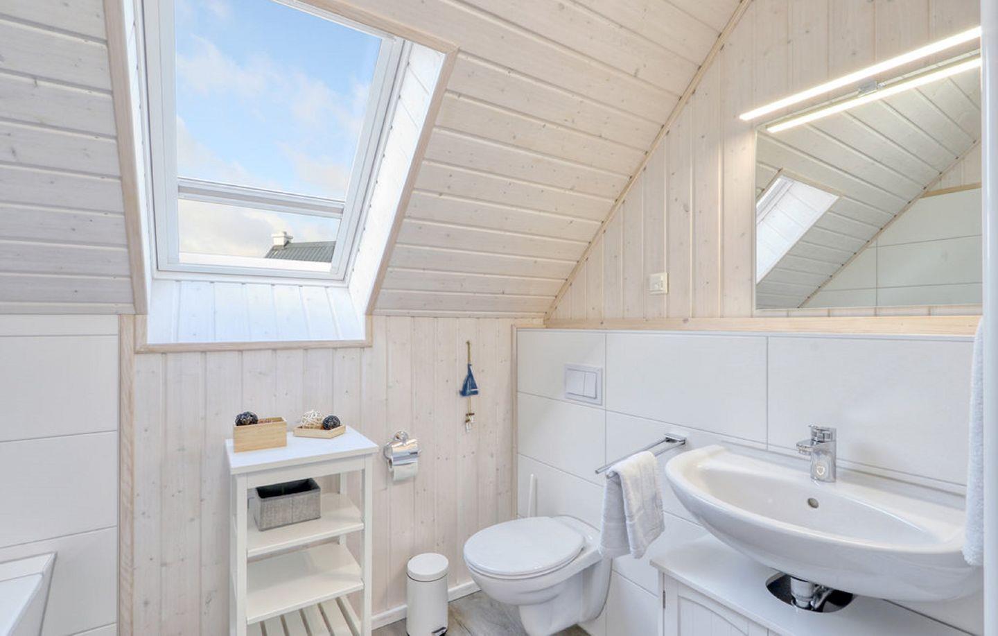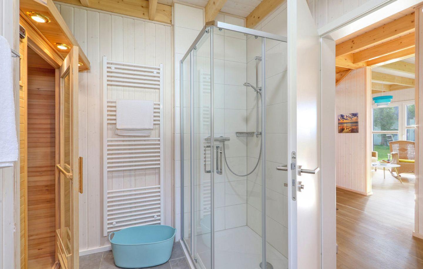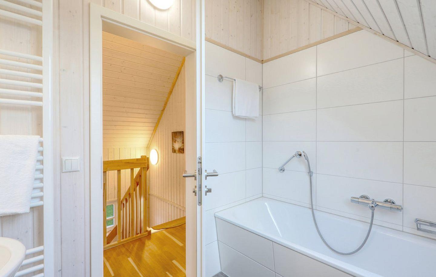 Das großzügige Badezimmer im Erdgeschoss ist mit einer ebenerdigen Dusche und als besonderes Highlight mit einer Infrarot-Sauna ausgestattet – ideal, um Dich an kühleren Tagen wohlig aufzuwärmen. Im Obergeschoss bietet das zweite Badezimmer eine bequeme Badewanne mit Duschmöglichkeit sowie einen Föhn.