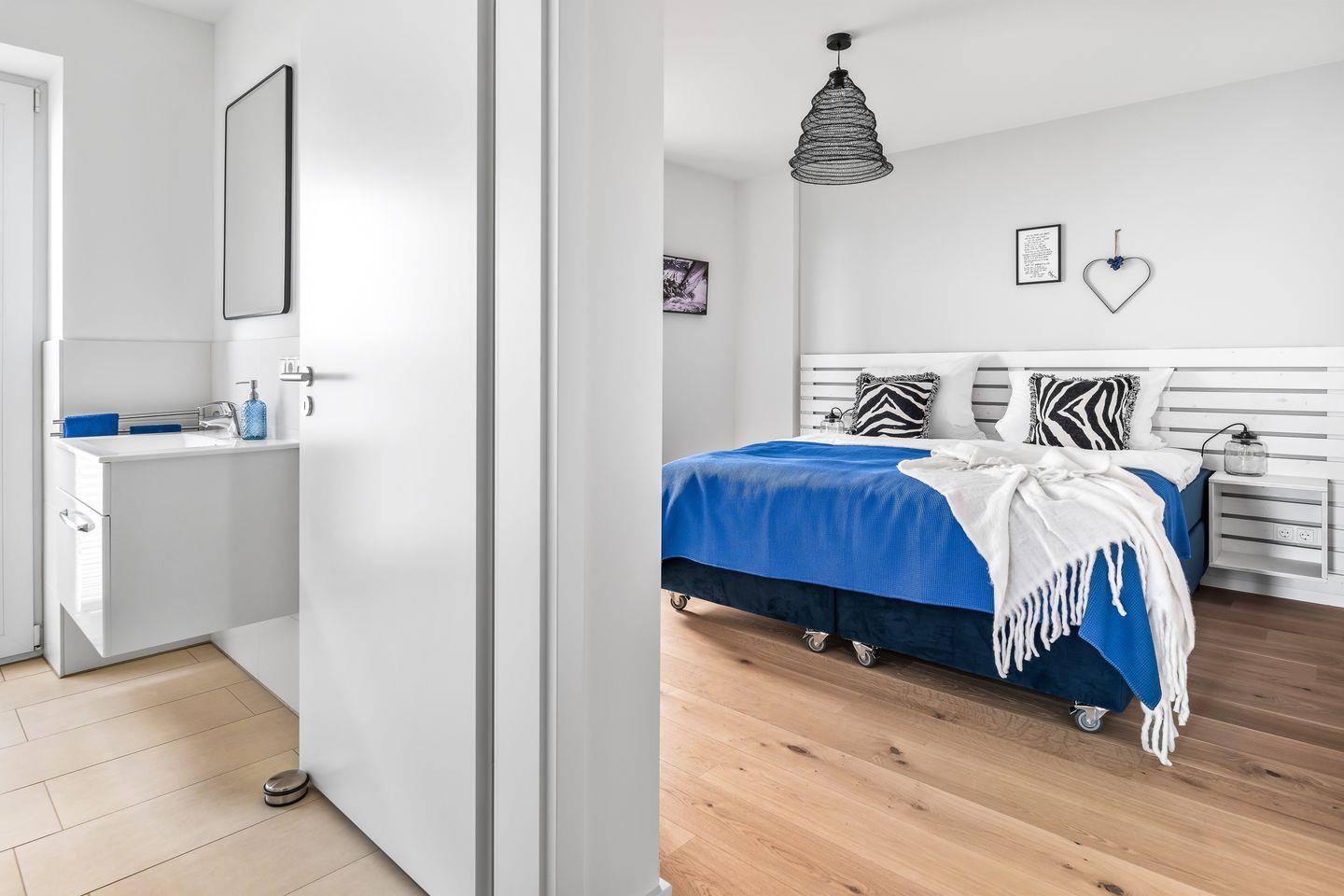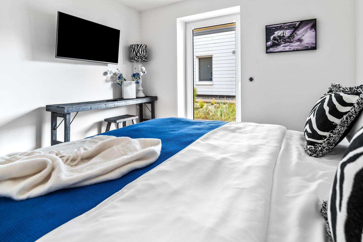 Schlafen Sie wie auf Wolken in den zwei charmanten Schlafzimmern. Das Master-Schlafzimmer lockt mit einem Doppelbett und direktem Meerblick, während das zweite Schlafzimmer mit zwei Einzelbetten auf Rollen flexibel bleibt. Beide sind mit Smart-TVs und eigenen Bädern ausgestattet, damit Ihr Komfort keine Grenzen kennt. So steht einem gemütlichen Ostseeurlaub mit Freunden und Familie nichts im Weg.
