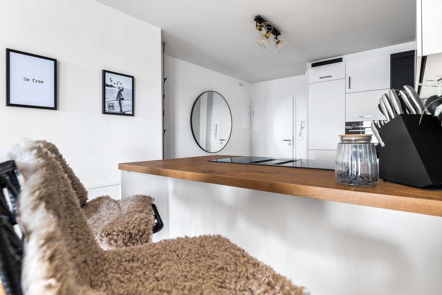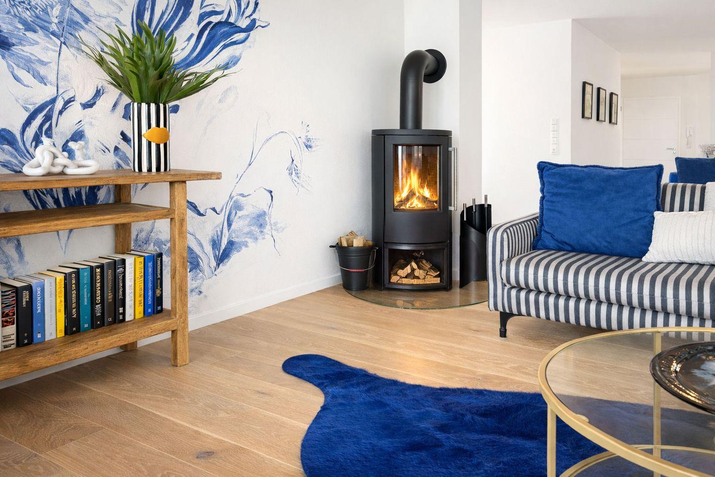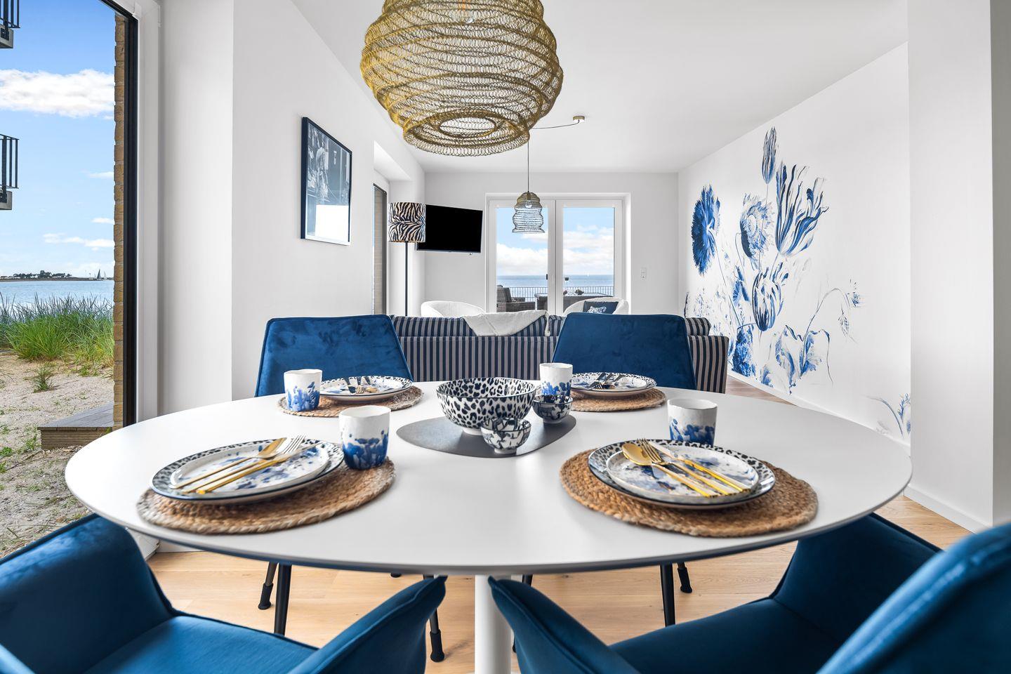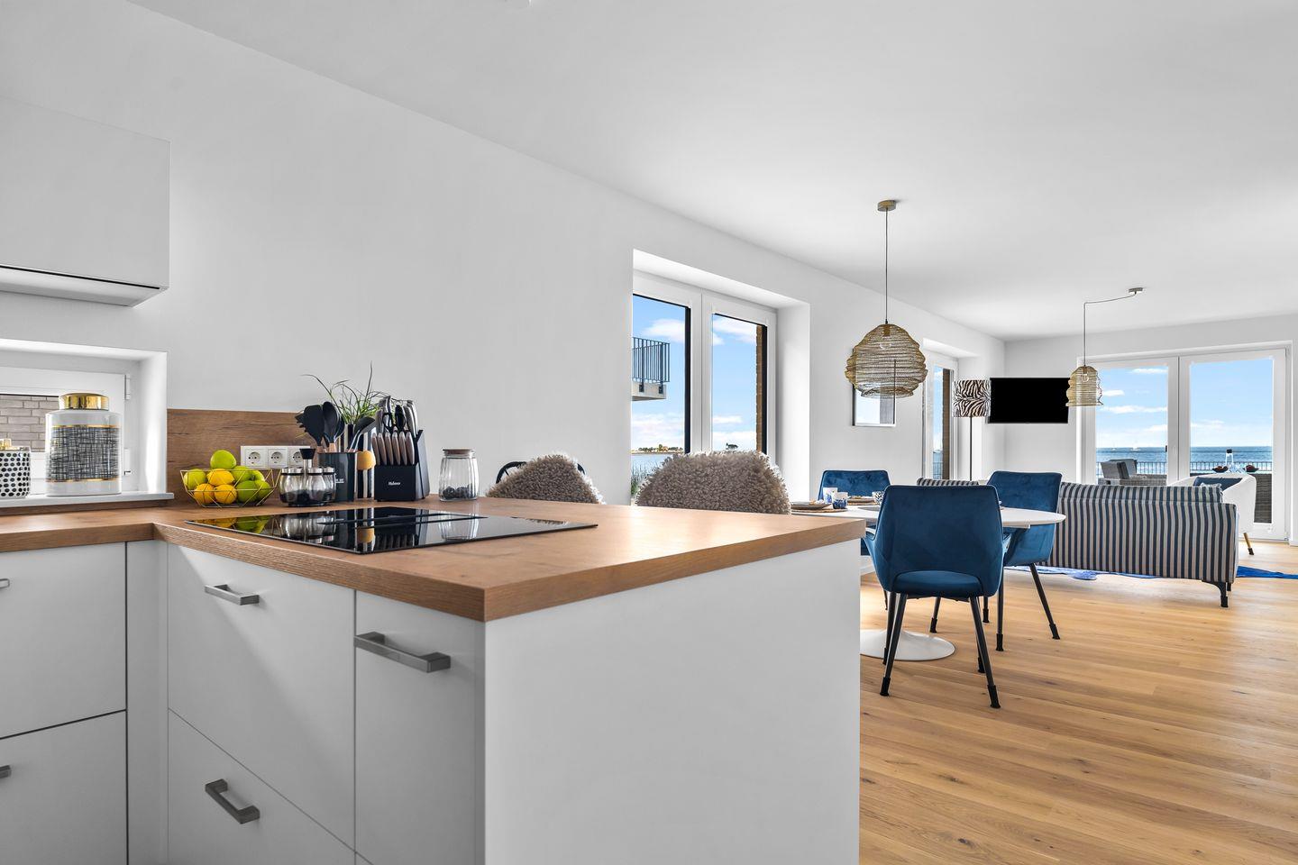 Auf einer großzügigen Fläche von 112 m² bietet "Blue Sea" einen offenen Wohn-Essbereich ausgestattet mit einem Kamin, perfekt für gemütliche Stunden. Ob beim Kochen in der top modernen Küche oder beim Entspannen auf dem Sofa – der Meerblick bleibt Ihr ständiger Begleiter. Ein runder Esstisch und ein einladender Küchentresen machen jede Mahlzeit besonders und sorgen für Geselligkeit im Ostseeurlaub.