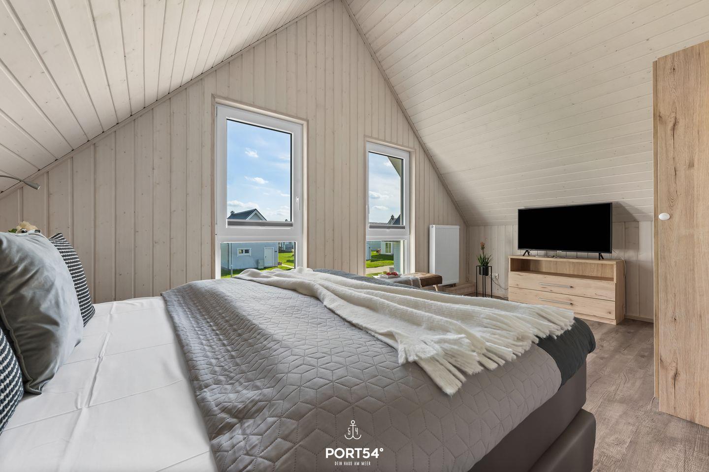 Im Obergeschoss befinden sich zwei Schlafzimmer. Eines der beiden Zimmer bietet Dir ein gemütliches Boxspringbett (180x200 cm) und einen Schrank, das zweite Schlafzimmer ist mit zwei Boxspringbetten (je 100x200 cm) sowie ebenfalls einem Schrank ausgestattet. Beide Zimmer verfügen über Insektenschutz und Verdunkelungsmöglichkeiten, sodass einem erholsamen Schlaf nichts mehr im Wege steht.