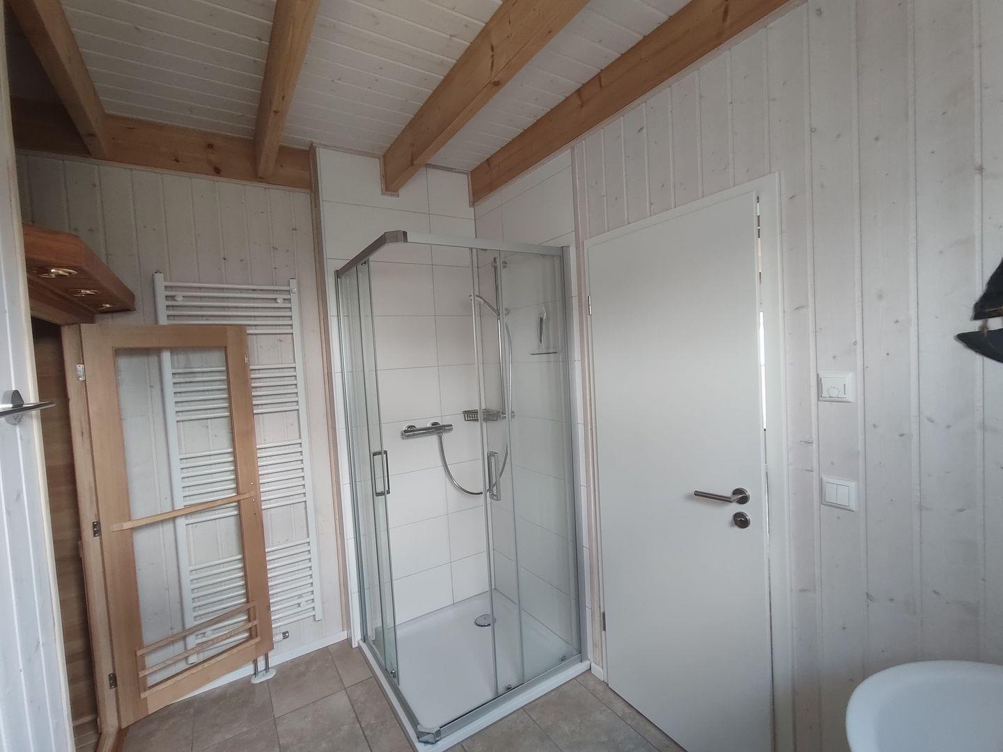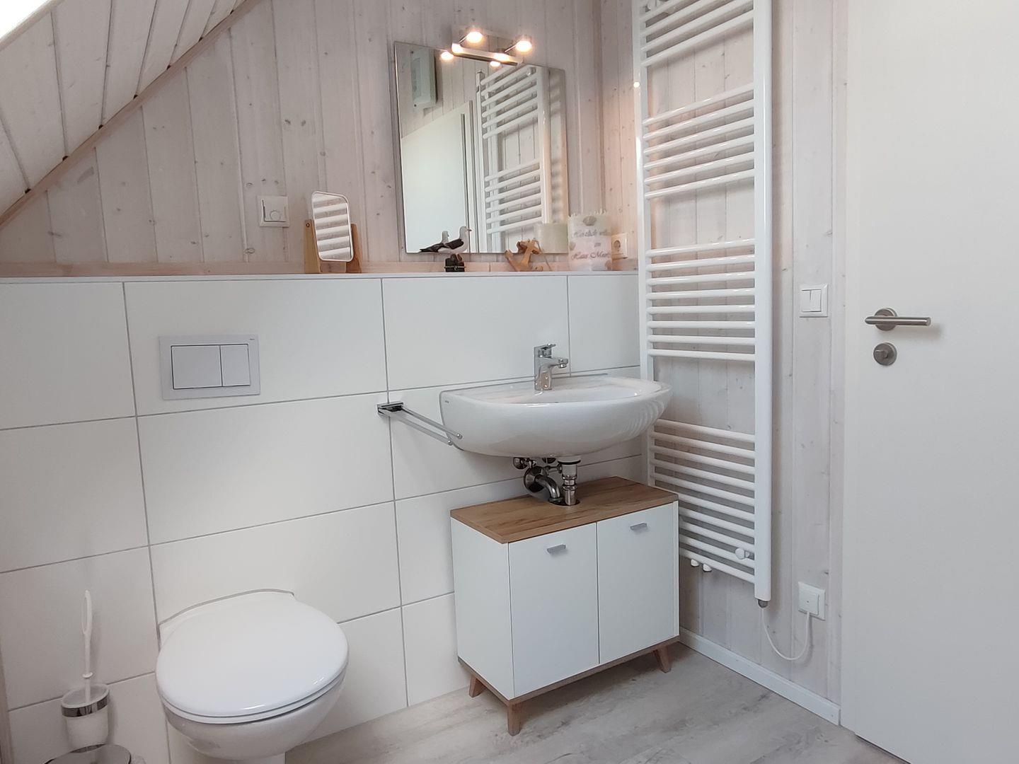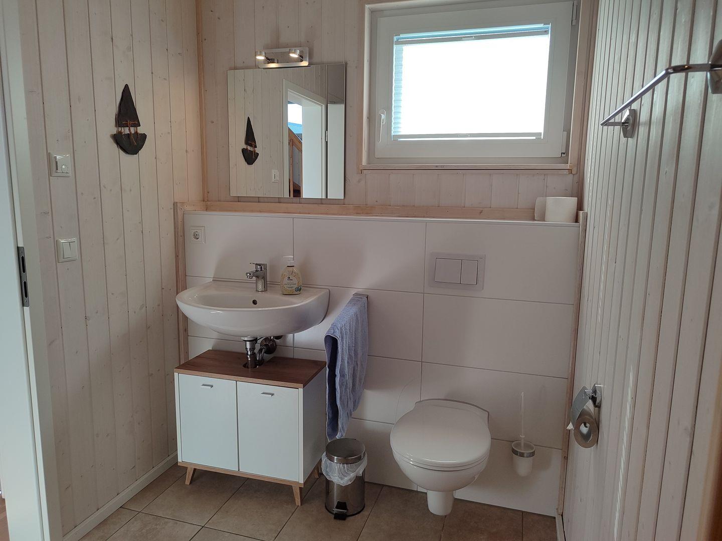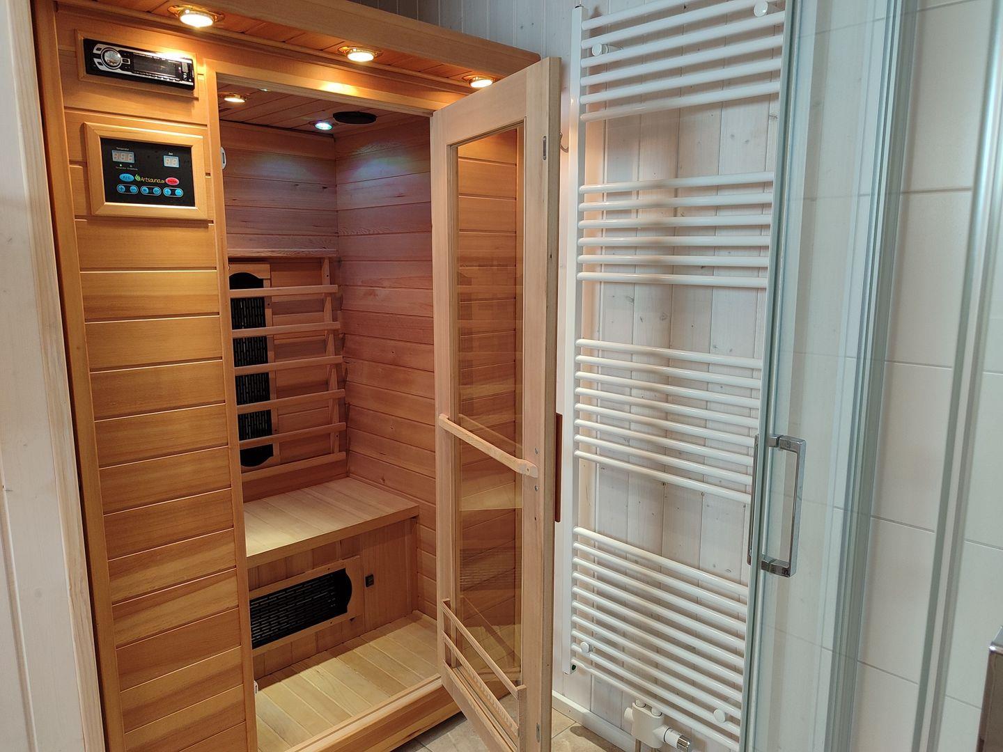 Das moderne Badezimmer im Erdgeschoss ist ein echtes Highlight: Hier kannst Du Dich nach einem langen Tag in der Infrarotsauna entspannen. Die ebenerdige Dusche, der Handtuchheizkörper und das Fenster mit Sichtschutz sorgen für zusätzlichen Komfort.