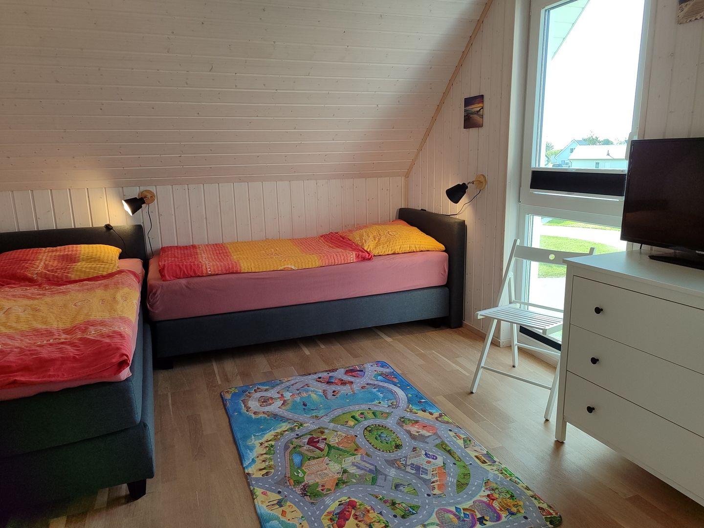 Das zweite Schlafzimmer ist ideal für Familien oder Freunde. Hier findest Du drei Einzel-Boxspringbetten (je 90x200 cm), einen weiteren Kleiderschrank, eine Kommode und einen Smart-TV, damit Du auch im Urlaub Deine Lieblingssendungen nicht verpasst.