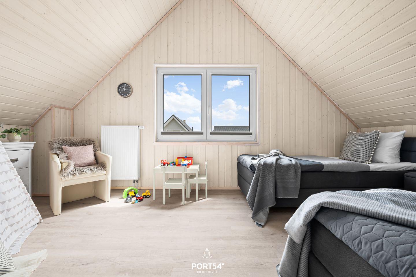 Ein Kinderhochstuhl sowie ein Kinderreisebett mit Matratze stehen ebenfalls zur Verfügung. Ein weiteres Wannenbad mit Fenster rundet das Obergeschoss ab. Beide Bäder verfügen über einen Handtuchheizkörper.