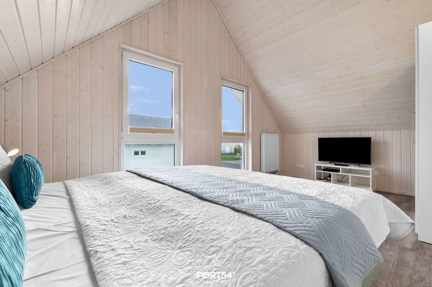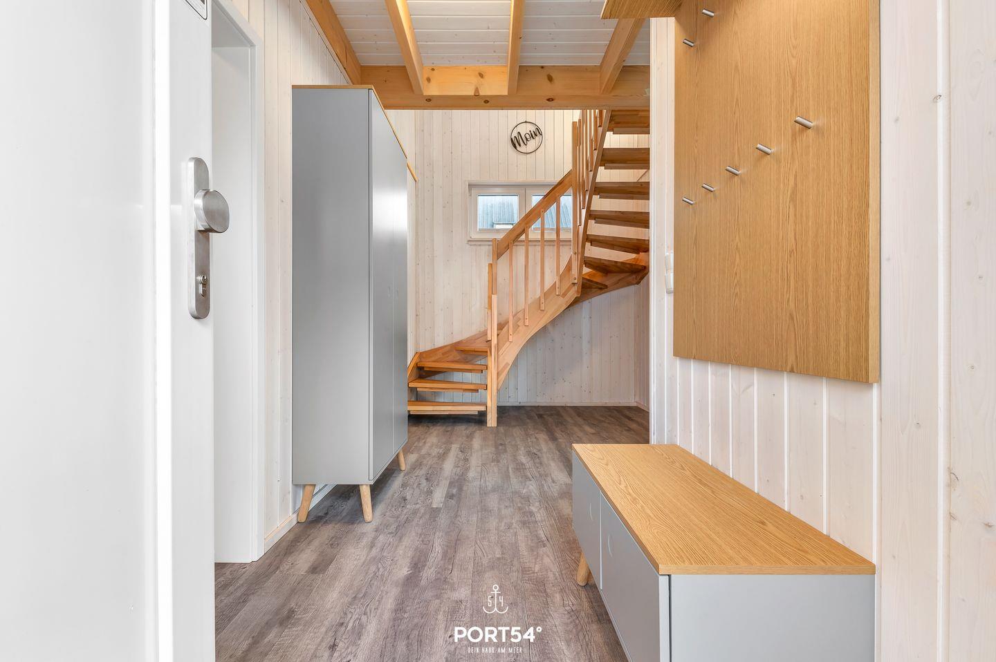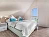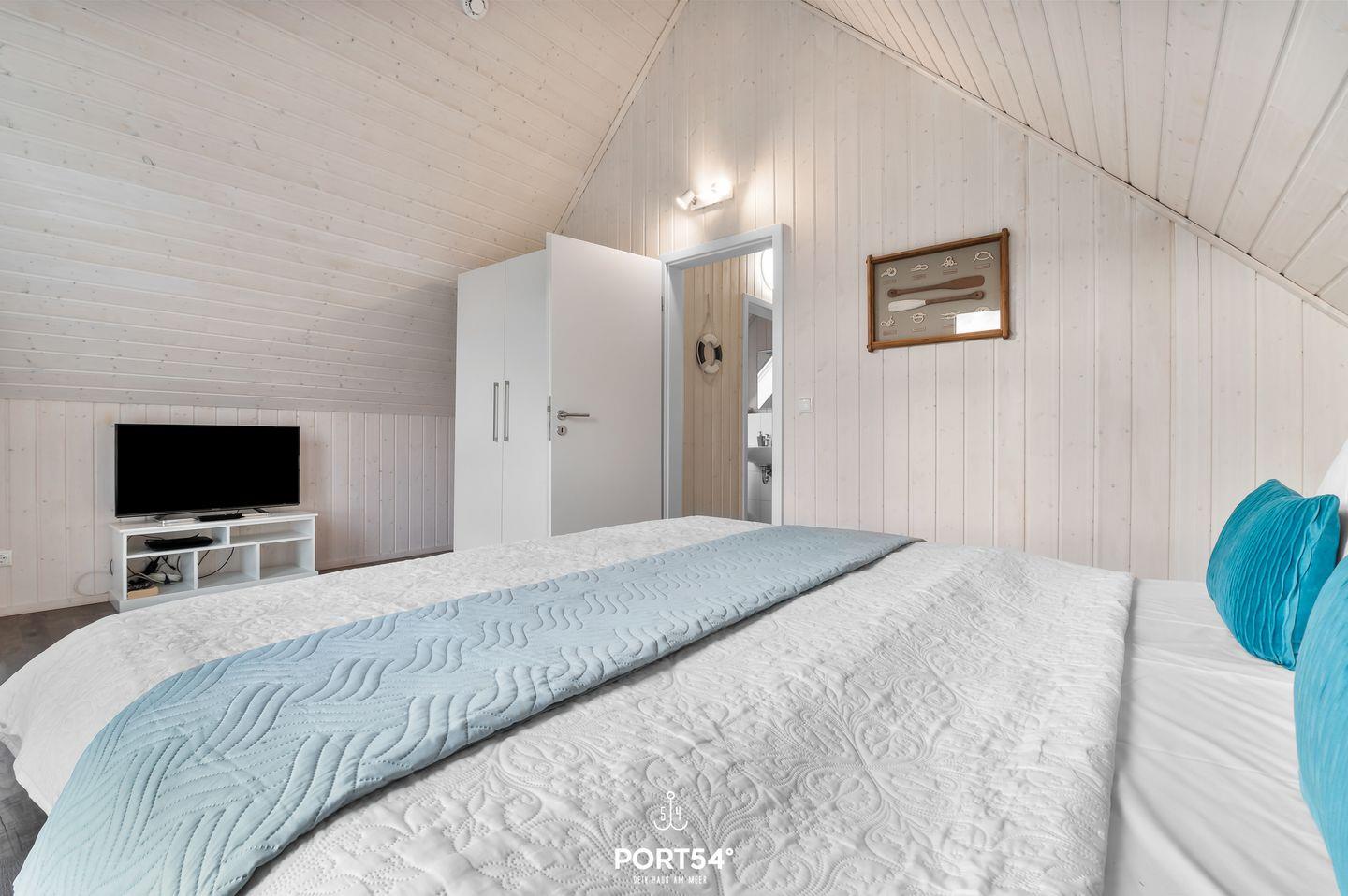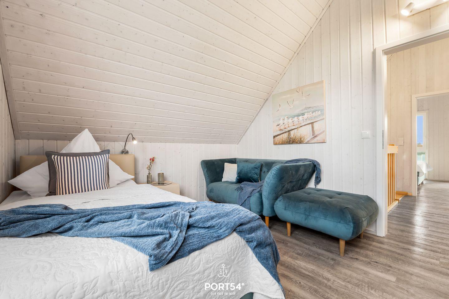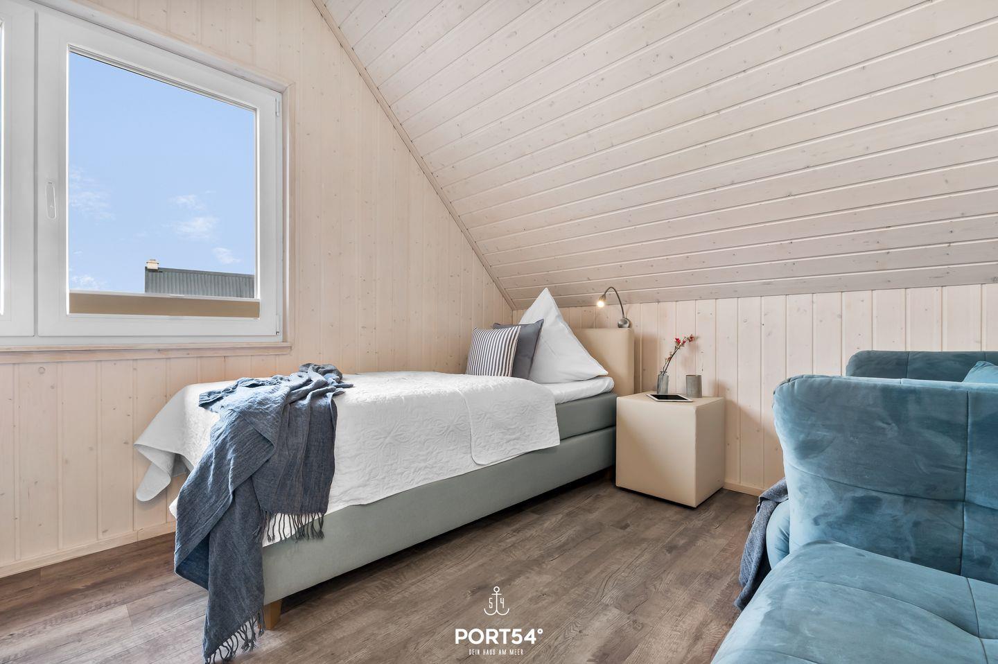 Im Obergeschoss befinden sich zwei Schlafzimmer. Eines der beiden Zimmer bietet ein gemütliches Boxspringbett (180 cm x 200 cm), einen Schrank und einen Smart-TV, das zweite Schlafzimmer ist mit zwei Boxspringbetten (je 90 cm x 200 cm) sowie ebenfalls mit einem Schrank ausgestattet. Beide Zimmer verfügen über Insektenschutz und Verdunkelungsmöglichkeiten, sodass einem erholsamen Schlaf nichts im Wege steht.