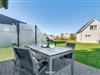 Die westlich ausgerichtete Terrasse lädt mit gemütlichen Outdoormöbeln, einem Holzkohlegrill und einem Sonnenschirm zum Verweilen im Freien ein – ideal für gesellige Abende mit Familie und Freunden.