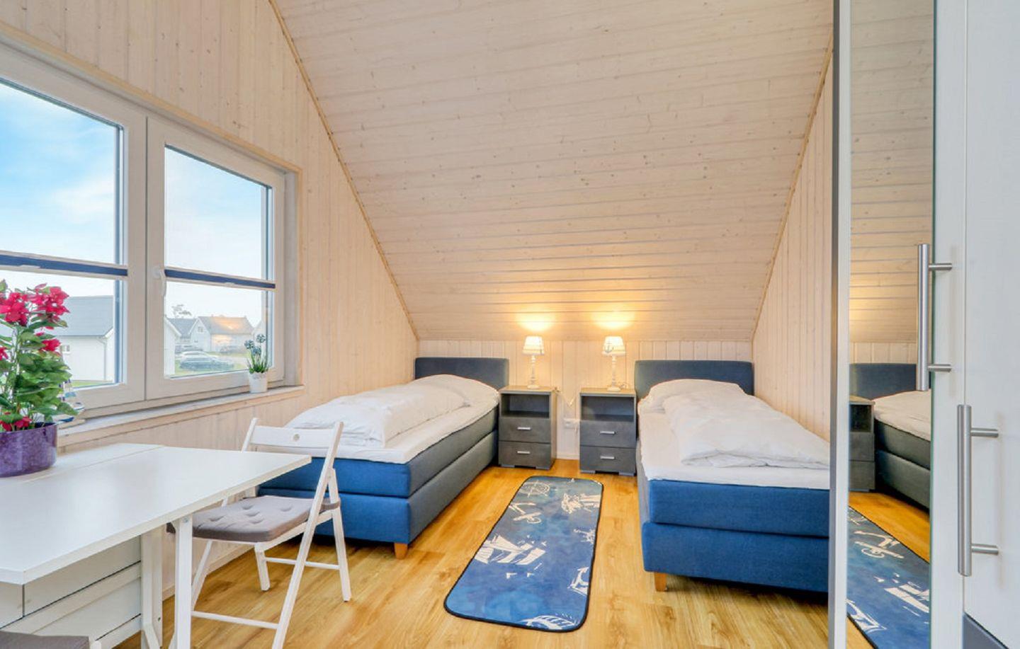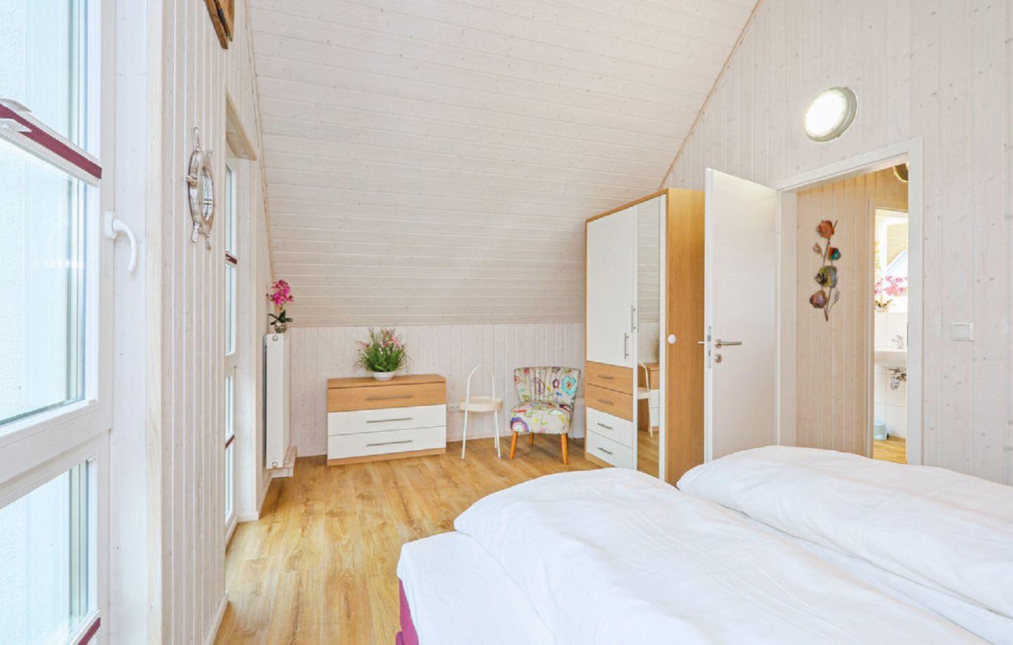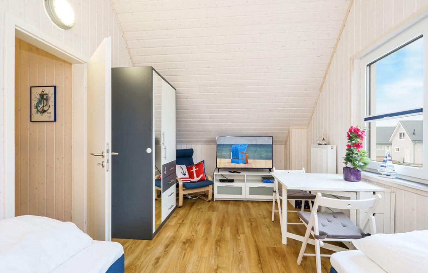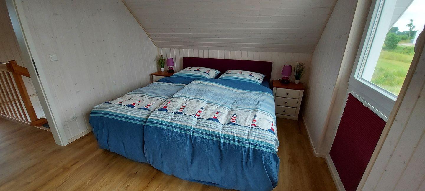 Im Obergeschoss befinden sich zwei Schlafzimmer. Eines der beiden Zimmer bietet ein gemütliches Boxspringbett (180x200 cm) und einen Schrank, das zweite Schlafzimmer ist mit zwei Boxspringbetten (90x200 cm), einem Smart-TV sowie ebenfalls mit einem Schrank ausgestattet. Beide Zimmer verfügen über Verdunkelungsmöglichkeiten und Insektenschutz, sodass einem erholsamen Schlaf nichts im Wege steht.
