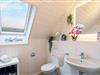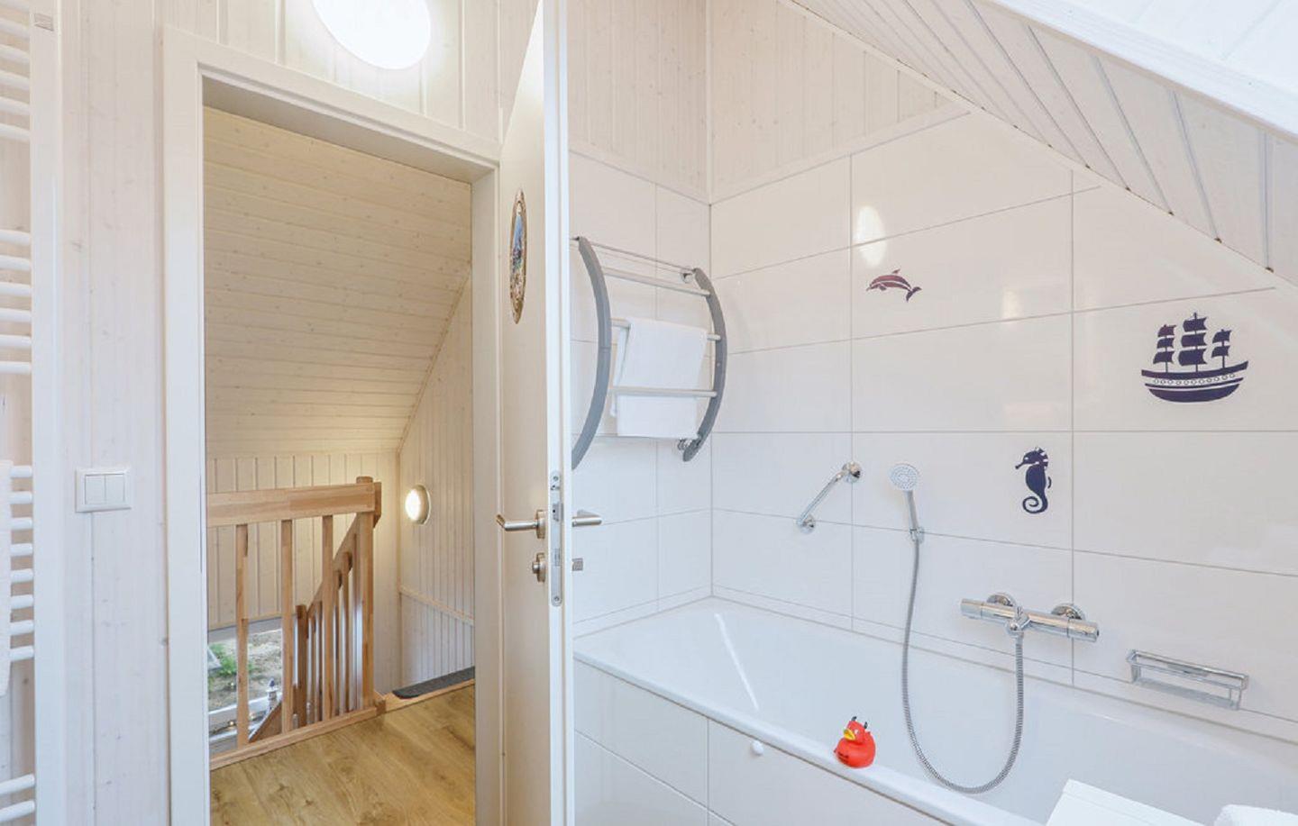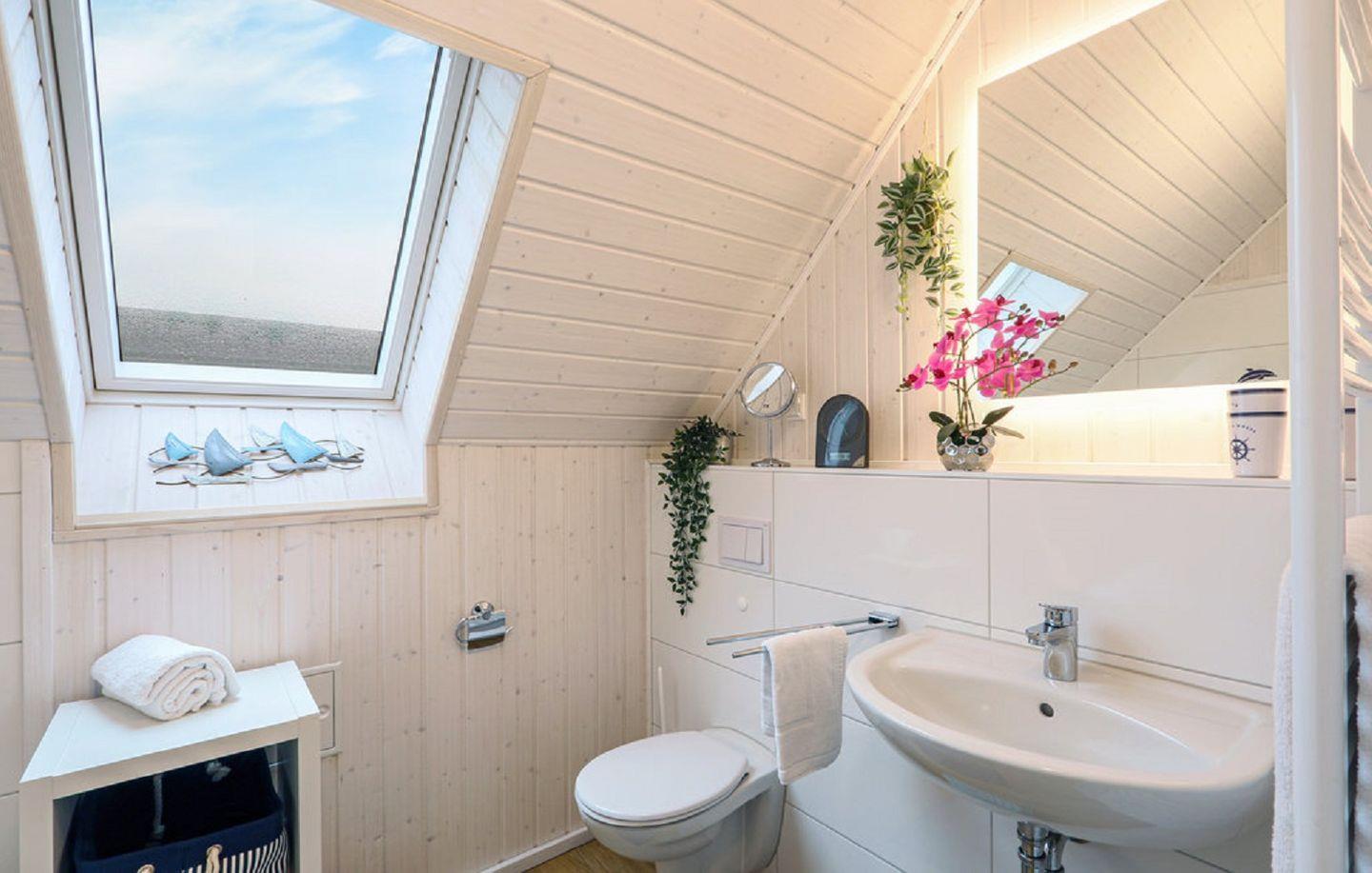 Das Bad im Obergeschoss bietet ein Dachfenster mit Sichtschutz, eine Badewanne, eine Handtuchheizung, einen Föhn und ein weiteres WC.