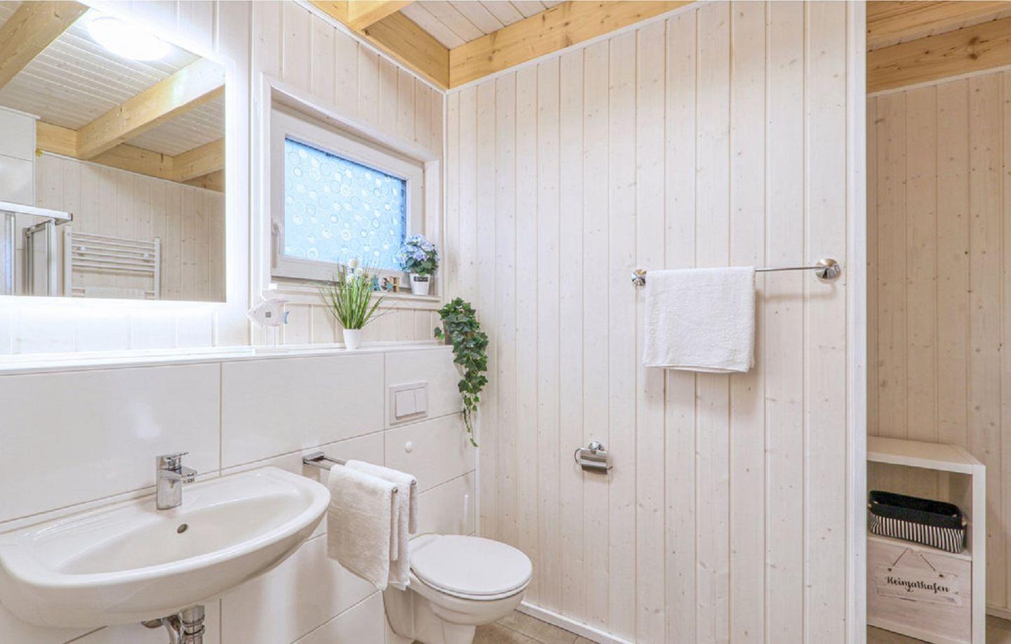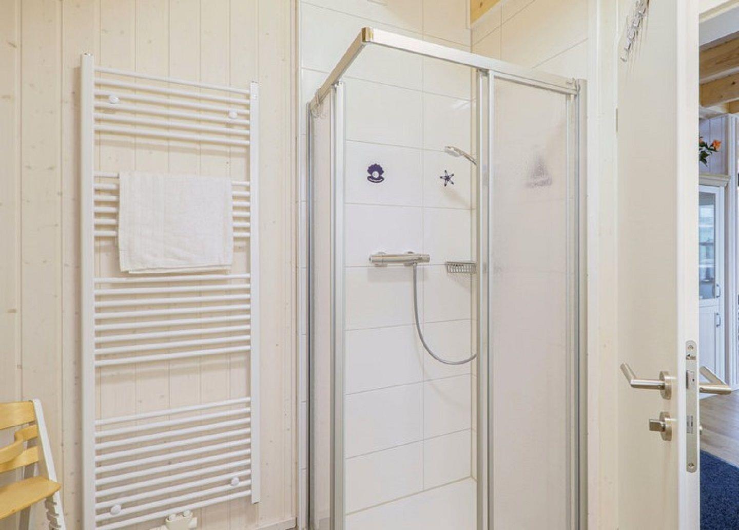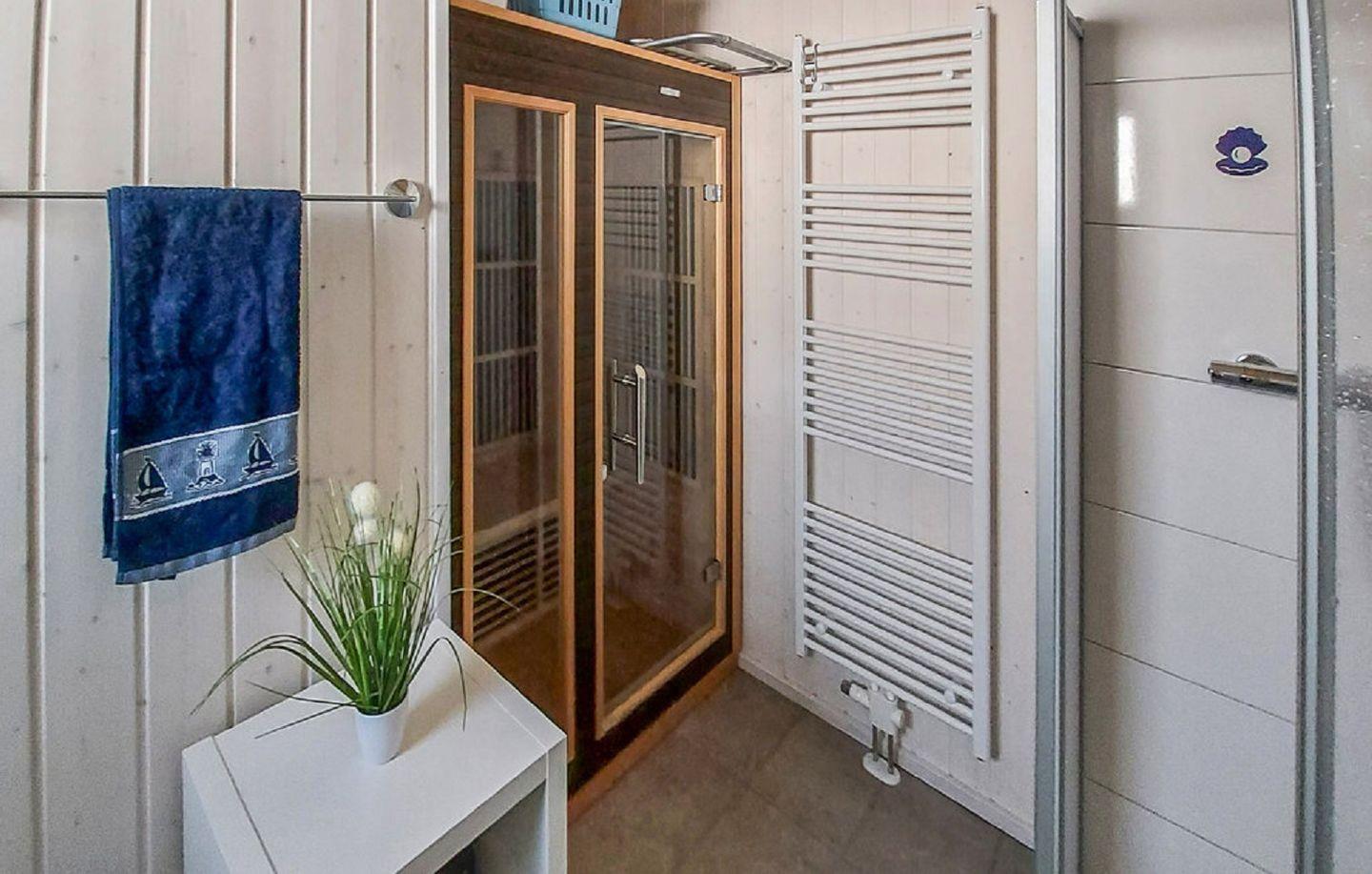 Ein Bad rundet das Erdgeschoss ab. Das Badezimmer verfügt über ein Fenster mit Sichtschutz, eine Dusche, eine Handtuchheizung und als besonderes Highlight eine Infrarotkabine. Hier kannst Du Dich nach langen Strandspaziergängen aufwärmen und entspannen.