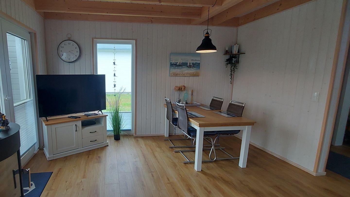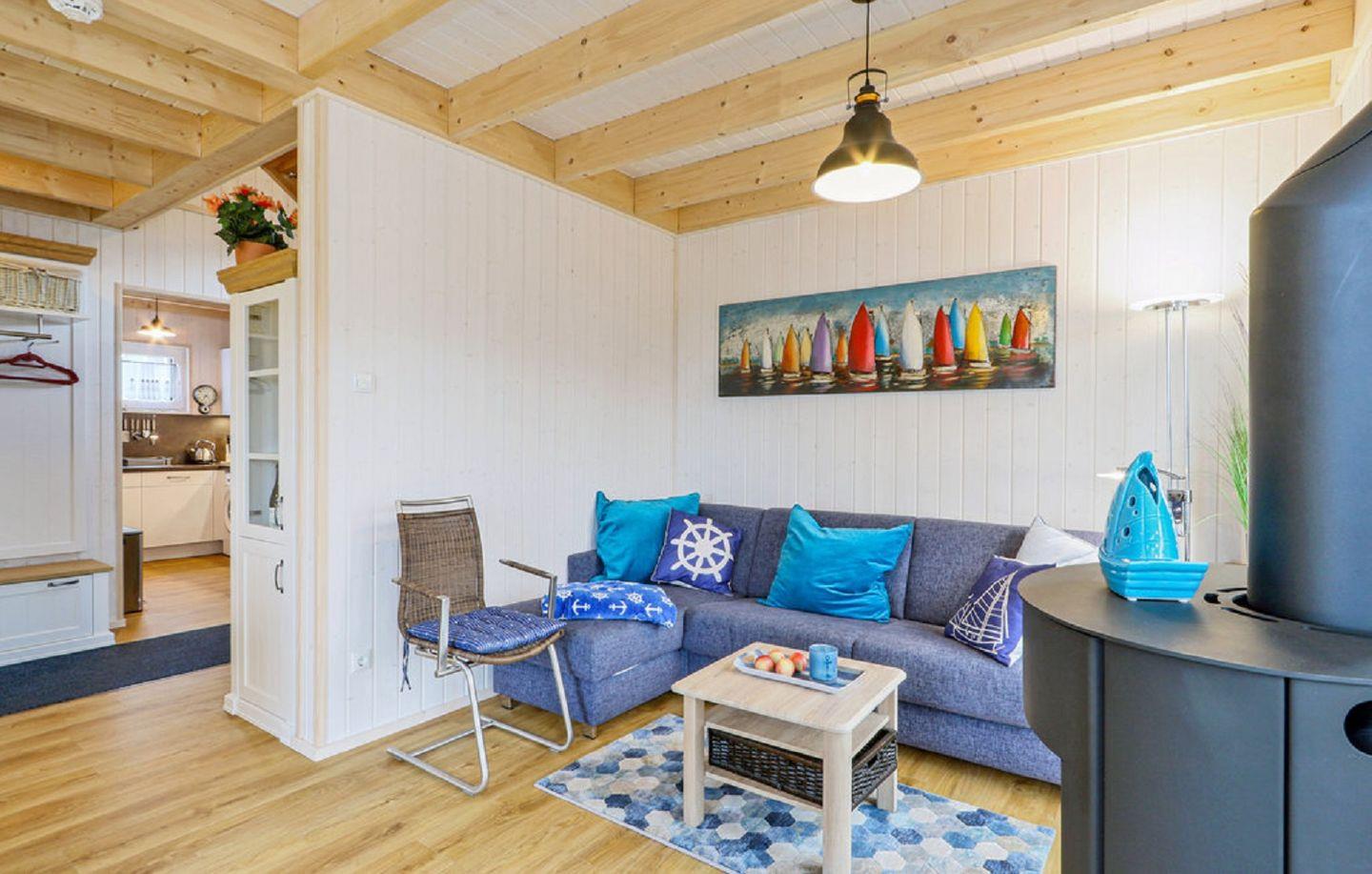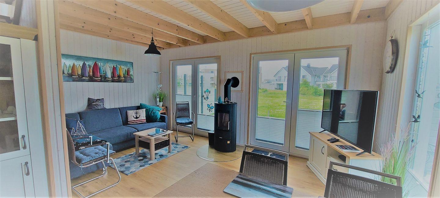 Durch die großen Panoramafenster ist das Haus lichtdurchflutet und sorgt für ein großzügiges Wohngefühl. Im Wohnbereich kannst Du es Dir auf dem Sofa gemütlich machen, ein gutes Buch lesen oder auf dem Flachbild-TV Deine Lieblingsserie schauen. An kühlen Abenden verbreitet der Kamin eine wohlige Wärme. Das Sofa verfügt über eine Schlaffunktion (140x200 cm) und bietet somit zwei weitere Schlafplätze für Kinder.