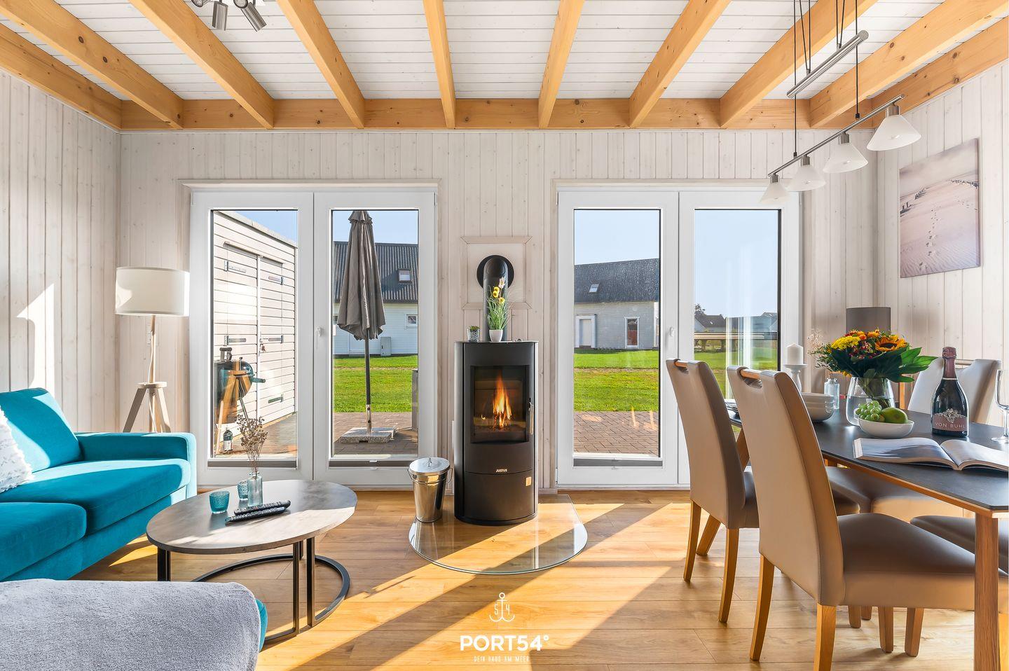 Der lichtdurchflutete Wohn- und Essbereich lädt mit einer gemütlichen Couch und einem wärmenden Kamin zum Entspannen ein.