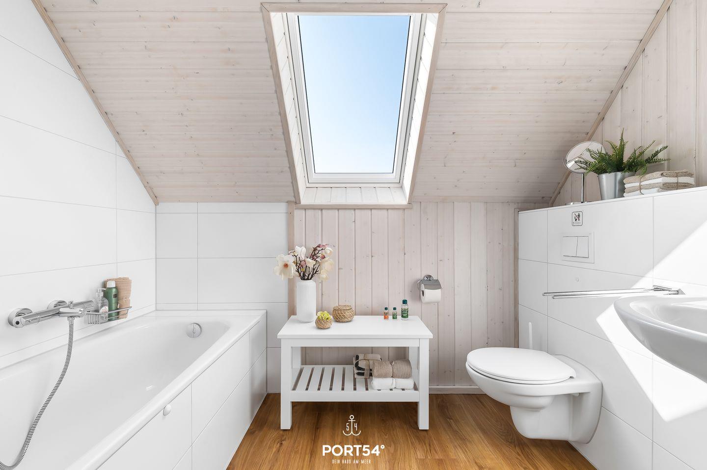 Ebenfalls findest Du im Obergeschoss ein Bad mit Dachfenster, einer Badewanne, WC und Handtuchheizung.