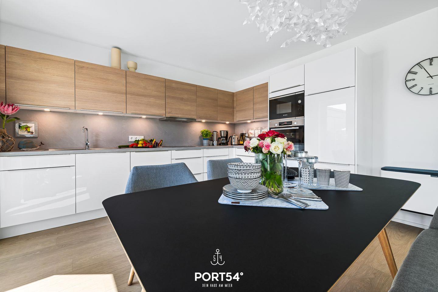 Die offene Küche ist mit Espressomaschine, Eierkocher und vielem mehr hervorragend ausgestattet, sodass für kulinarische Kochabende alles Wichtige vorhanden ist. Eine Waschmaschine befindet sich ebenfalls in der Küche.