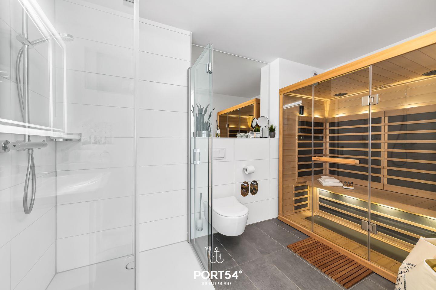 Das Badezimmer mit bodentiefer Dusche und Infrarot-Wärmekabine sorgt für wohltuende Wellnessmomente. Zusätzlich stehen Dir ein Handtuchheizkörper, ein Kosmetikspiegel und ein Föhn zur Verfügung.