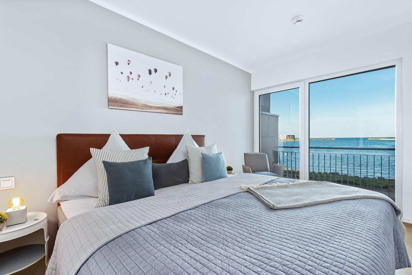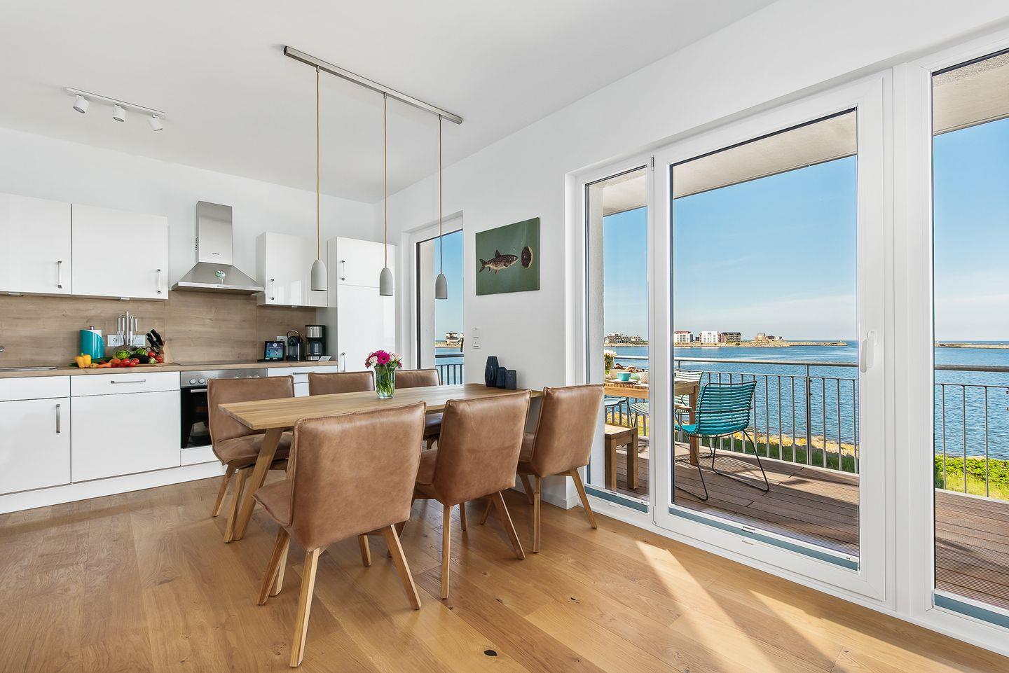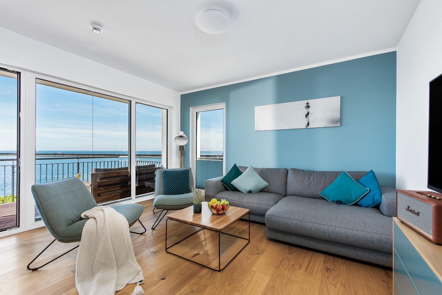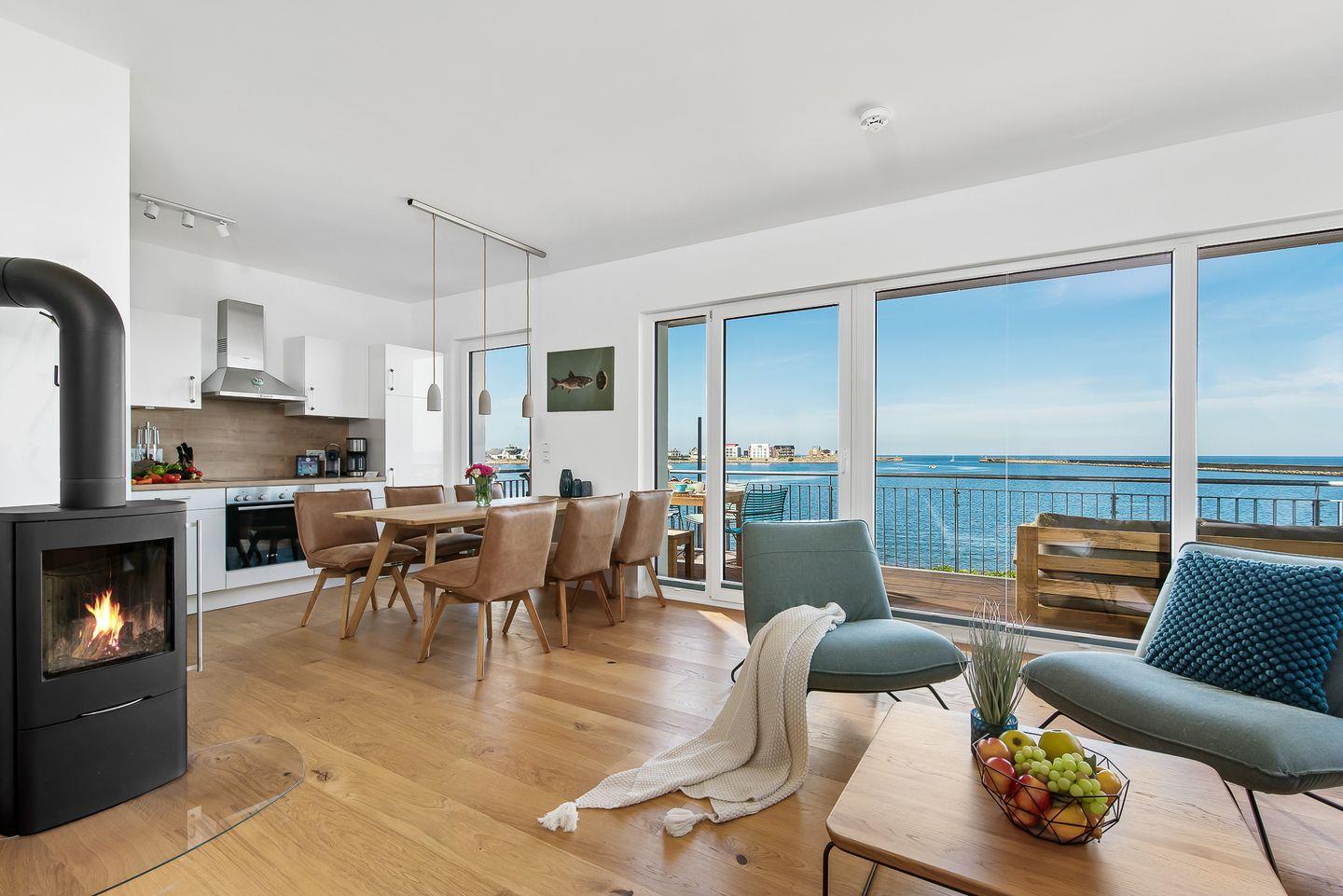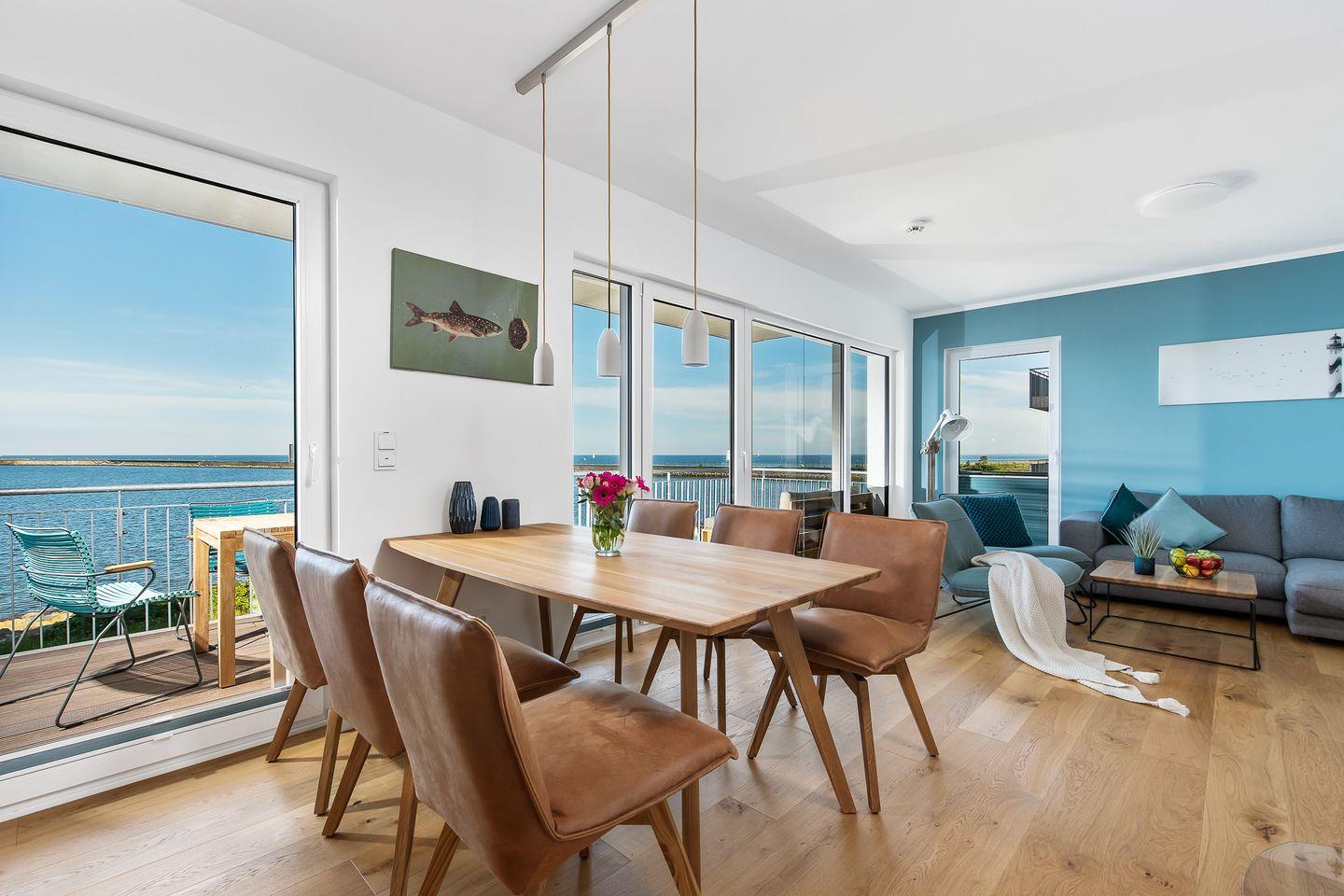 Vom Wohn- und Essbereich mit bodentiefen Fenstern hast Du Zugang zum Herzstück dieser Ferienwohnung, dem großen Balkon mit einem unvergesslichen Blick auf die freie Ostsee und die Hafeneinfahrt.