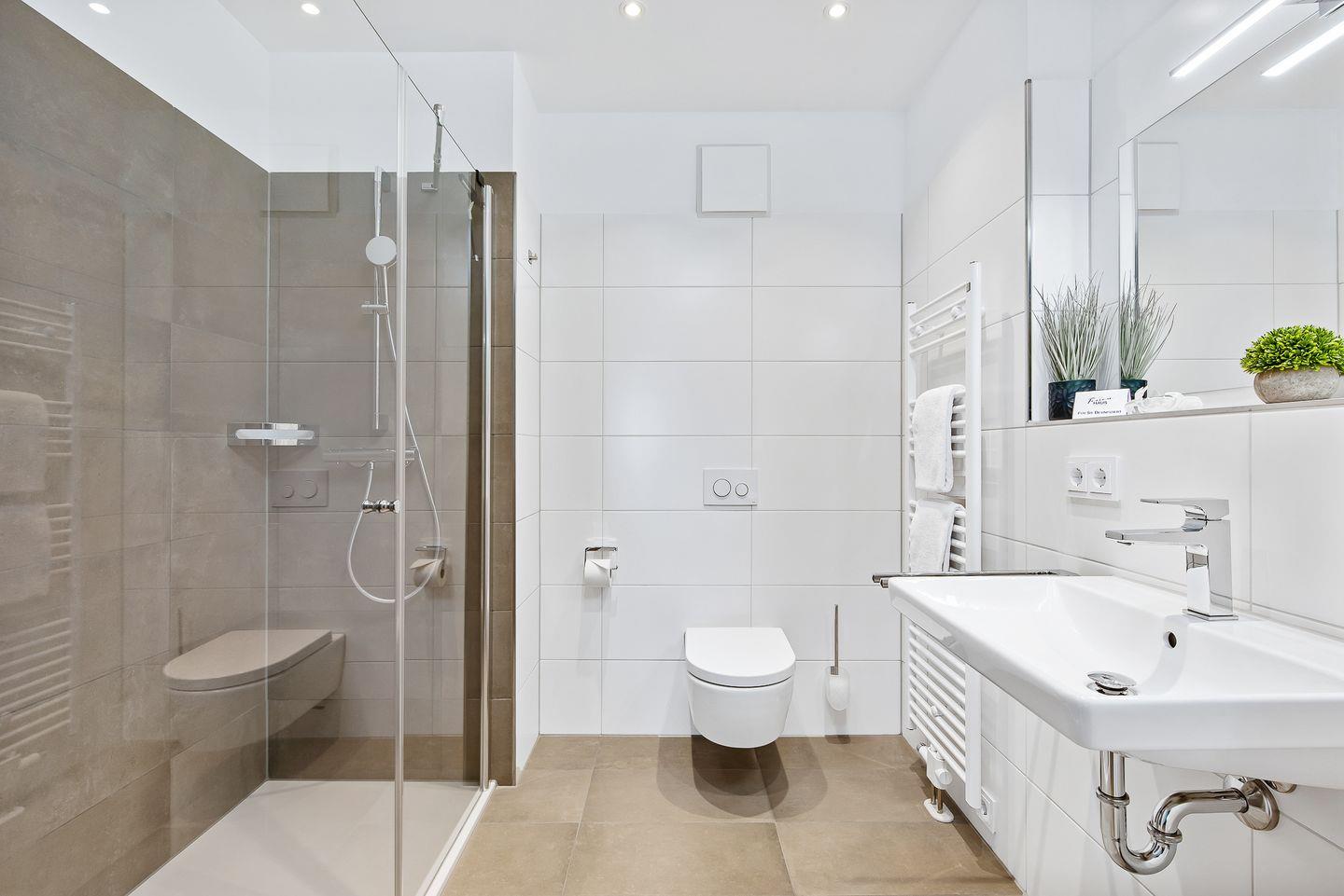 Beide Badezimmer bieten Dir ausreichend Platz, eine ebenerdige Dusche, einen Handtuchtrockner und einen großen Spiegel.