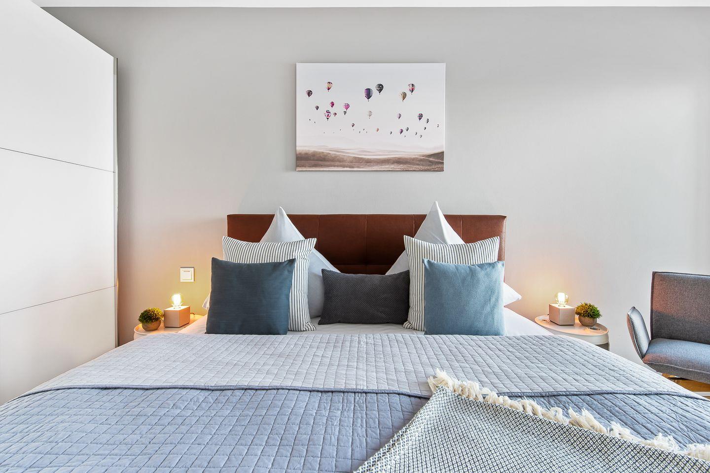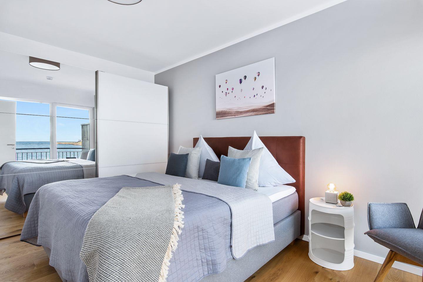 Diese Ferienwohnung verfügt über zwei komfortable Doppelschlafzimmer mit Boxspringbetten (180 x 200 cm), Kleiderschränken und Verdunkelungsmöglichkeiten, eines mit TV und eines mit Wasserblick.