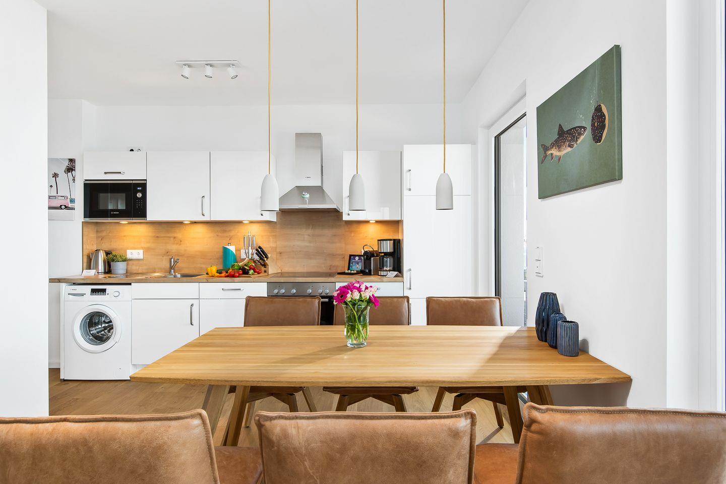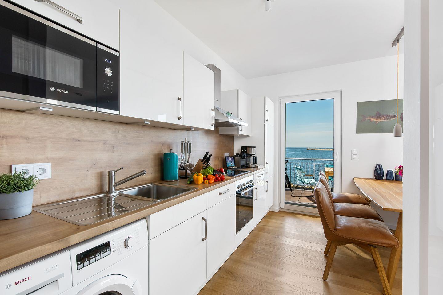 Die hochwertig ausgestattete Küche mit Meerblick ist offen zum Wohn- und Essbereich gestaltet und lädt Dich zu gemeinsamen Kochabenden ein.