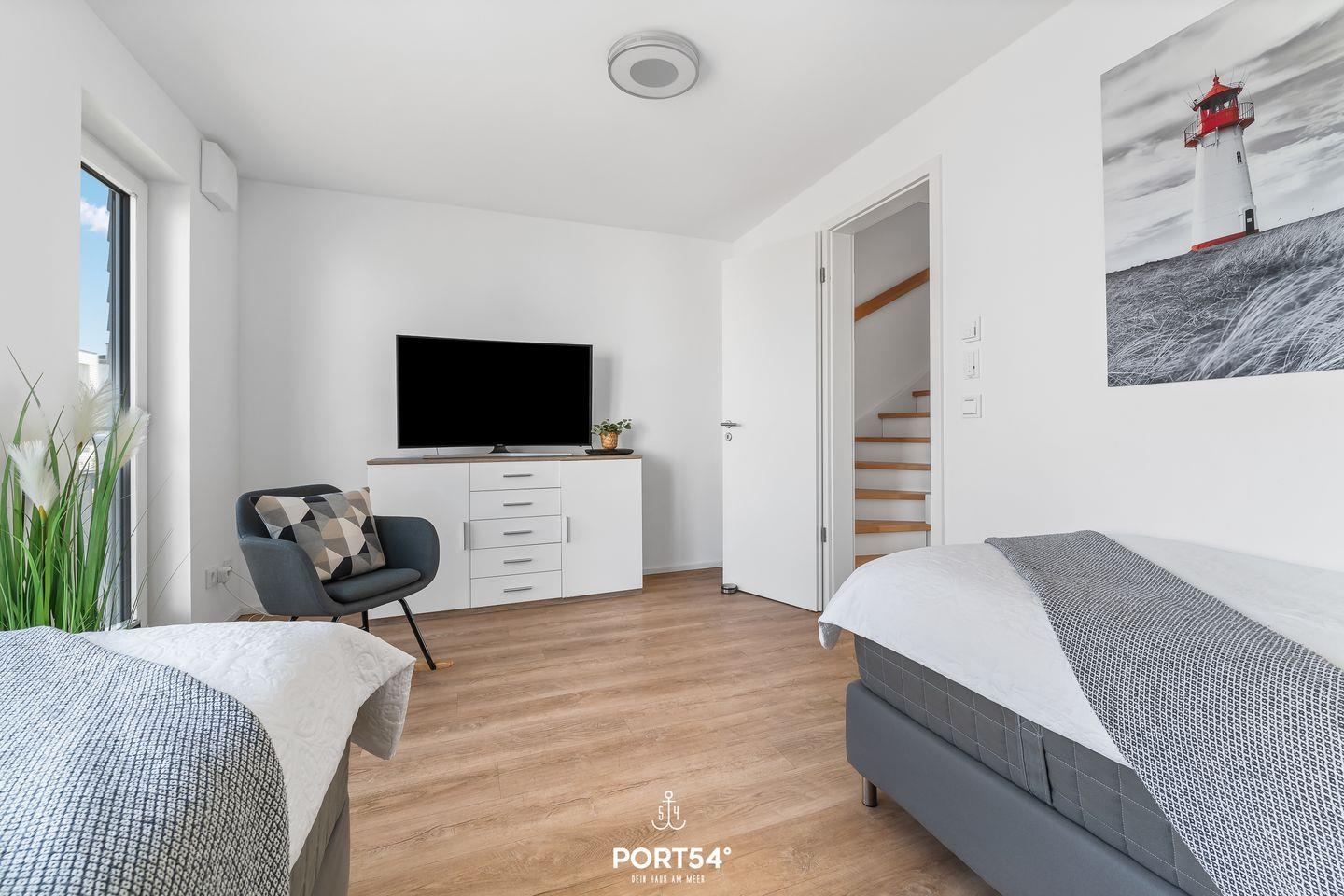 Im 1. Obergeschoss findest Du zwei Schlafzimmer: eines mit einem großzügigen Boxspring-Doppelbett (180 x 200 cm) und ein weiteres mit zwei Boxspring-Einzelbetten (90 x 200 cm), die sich bei Bedarf zusammenstellen lassen. Das dritte Schlafzimmer im 2. Obergeschoss bietet ebenfalls ein komfortables Boxspring-Doppelbett (180 x 200 cm) sowie einen zusätzlichen Schreibtisch – ideal für jene, die auch im Urlaub etwas arbeiten möchten.